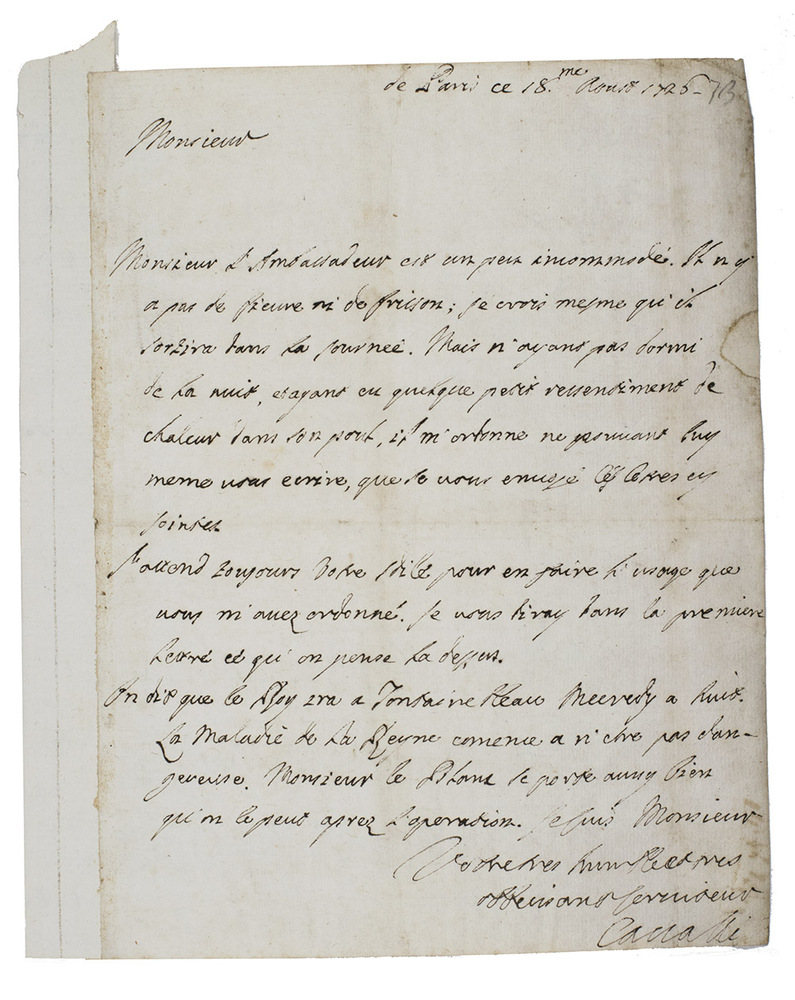 The writer of the letter, a certain Cavalli was apparently a kind of spy in the service of an unidentified ambassador, reporting on the activities of members of the French Royal court. He indicates he is writing at the request of the ambassador, but we have not identified the recipient, perhaps an official or journalist. He first tells the addressee that the "the Ambassador" is not very well: he has no fever nor is he shivery, and he even goes out during the day. But, having not slept during the night and having a somewhat fast pulse, he cannot write himself and has ordered the writer to send the two annexed letters (not now present).