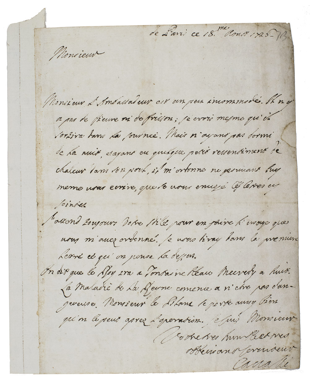 Much of the letter remains mysterious beyond the identities of Cavalli, the ambassador he served and the recipient of his letter. Charles-Henri, comte d'Hoym appears to have been Polish ambassador in Paris around this time and might have wished to keep an eye on the Queens circumstances, but we find nothing to link him to a Cavalli, whose name sounds Italian. Charles François de la Baume Le Blanc, duc de La Vallière, and his son Louis César were both at the court at this time, but we find nothing more to associate either with the "Monsieur Le Blanc" of the letter nor any clue to what they think might be done concerning Marie Leszczynska after whatever operation she was to undergo. It certainly places the letter in the dark atmosphere of court intrigues and secret operations flourishing in 18th-century Paris.