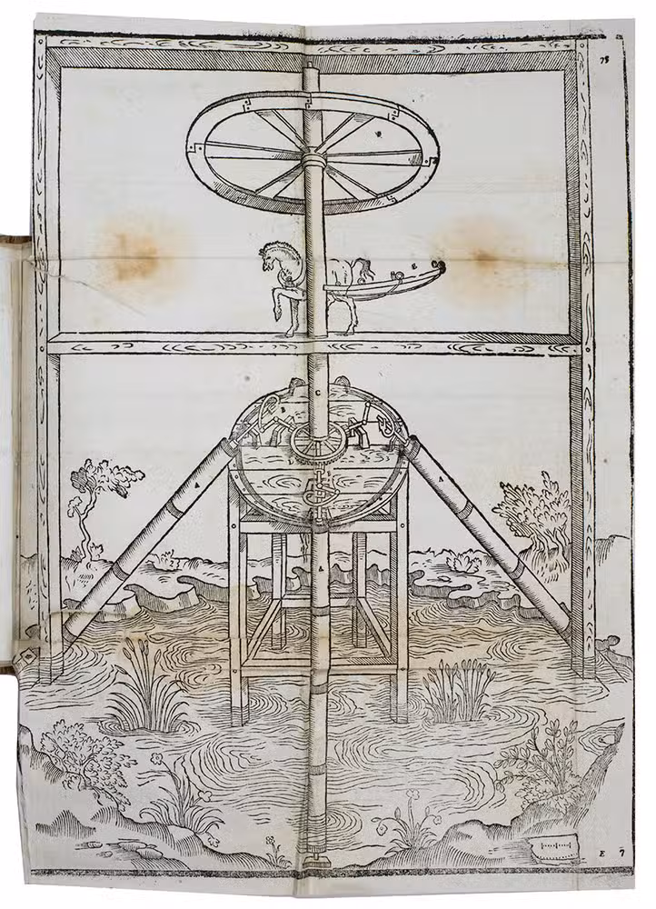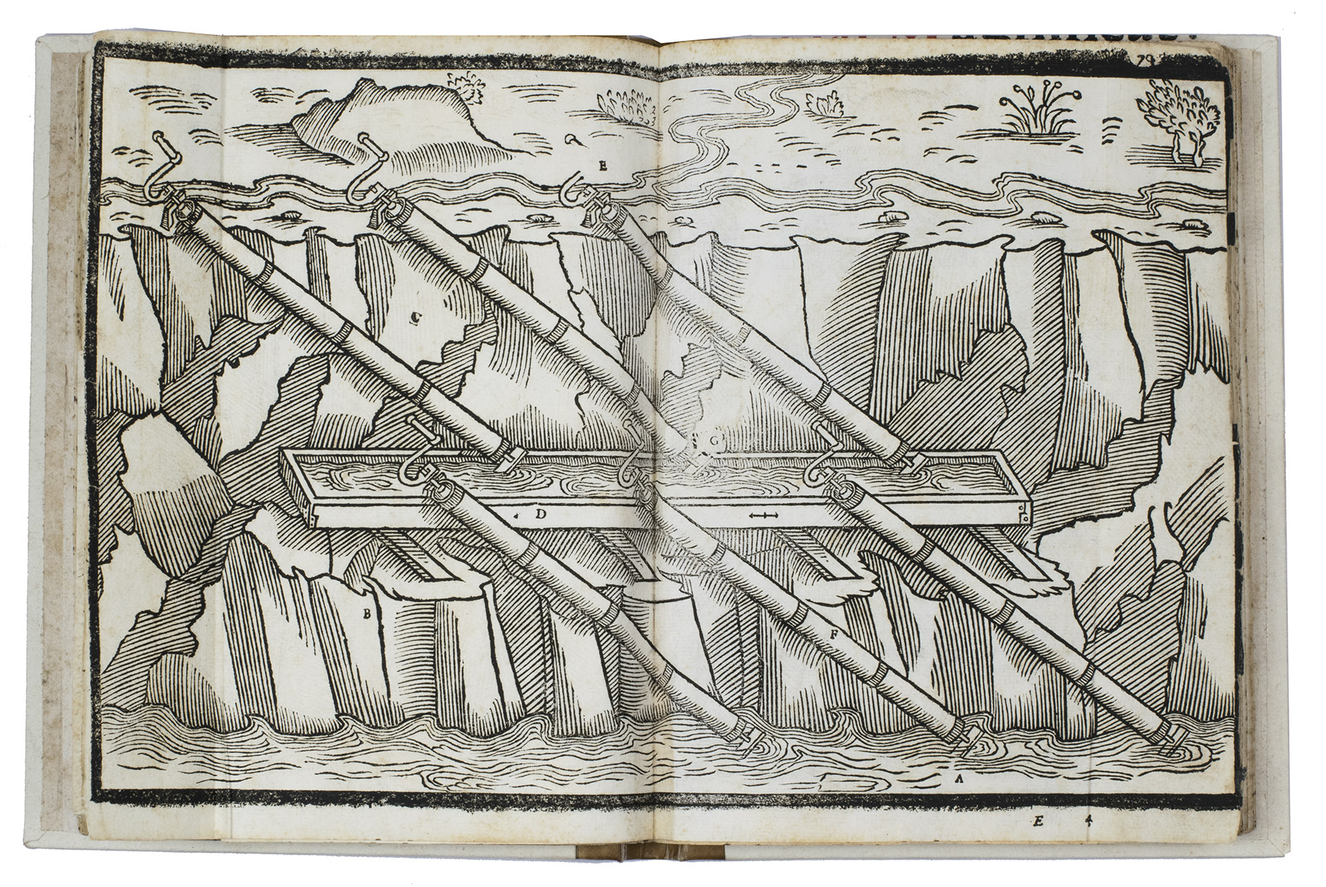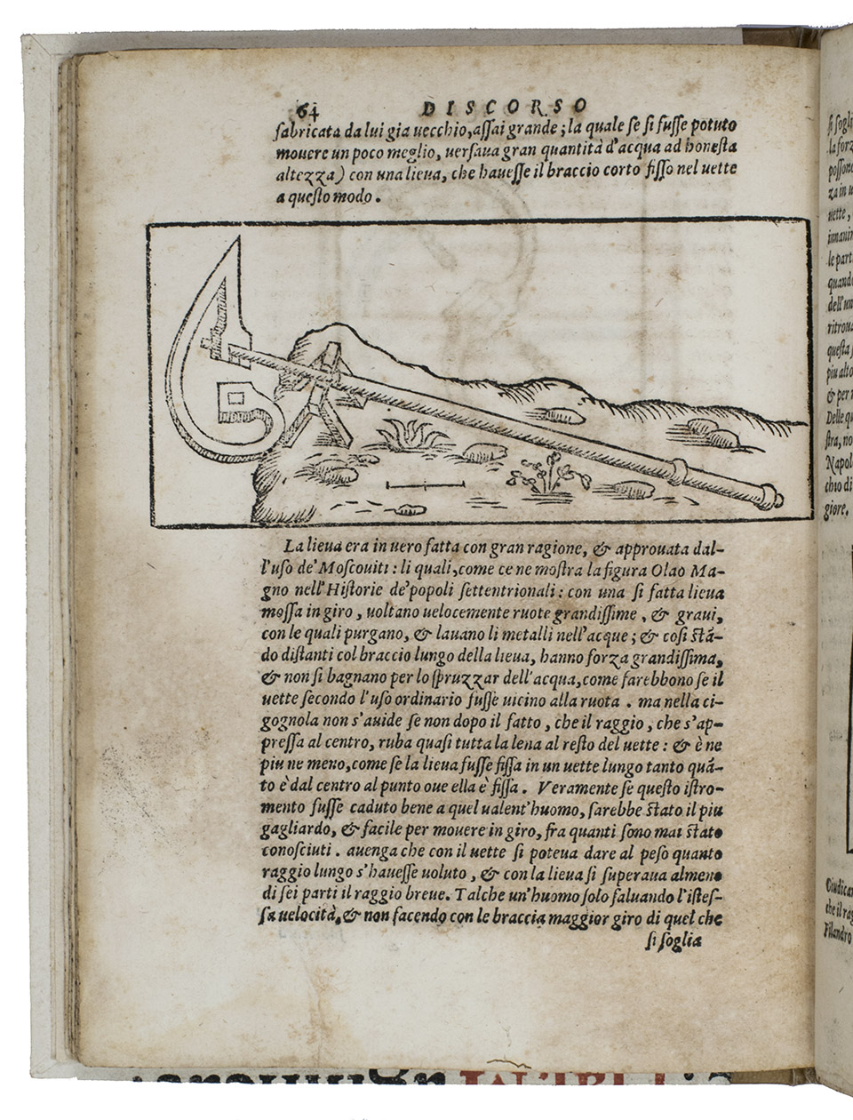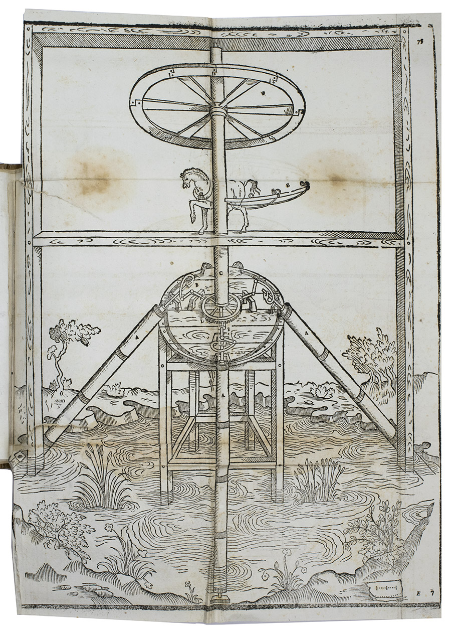 First and only edition of Ceredi's rare and important study of hydraulic mechanics, one of the earliest works on the subject. In this beautifully illustrated work, the 16th-century Italian hydraulic engineer Giuseppe Ceredi describes not only the construction of the Archimedes screw, but also how to improve it and how to use it for the drainage and irrigation of fields, as he considered the devices in use to be inefficient. Although the screw, invented by Archimedes in the 3th century BC, was widely used in the classical antiquity, no clear description or instructions for building it existed in Ceredis time, though the device was known to him and his contemporaries. With the present work, he tried to improve Archimedess design and he for the first time published a proposal for a systematic scheme of irrigation, using a standardized mechanical device. Besides improving an old mechanical device, he also considers the economic, health and agricultural aspects of the Archimedes screw. Ceredis present publication should be considered one of the most important publications in the history of hydraulic science.
