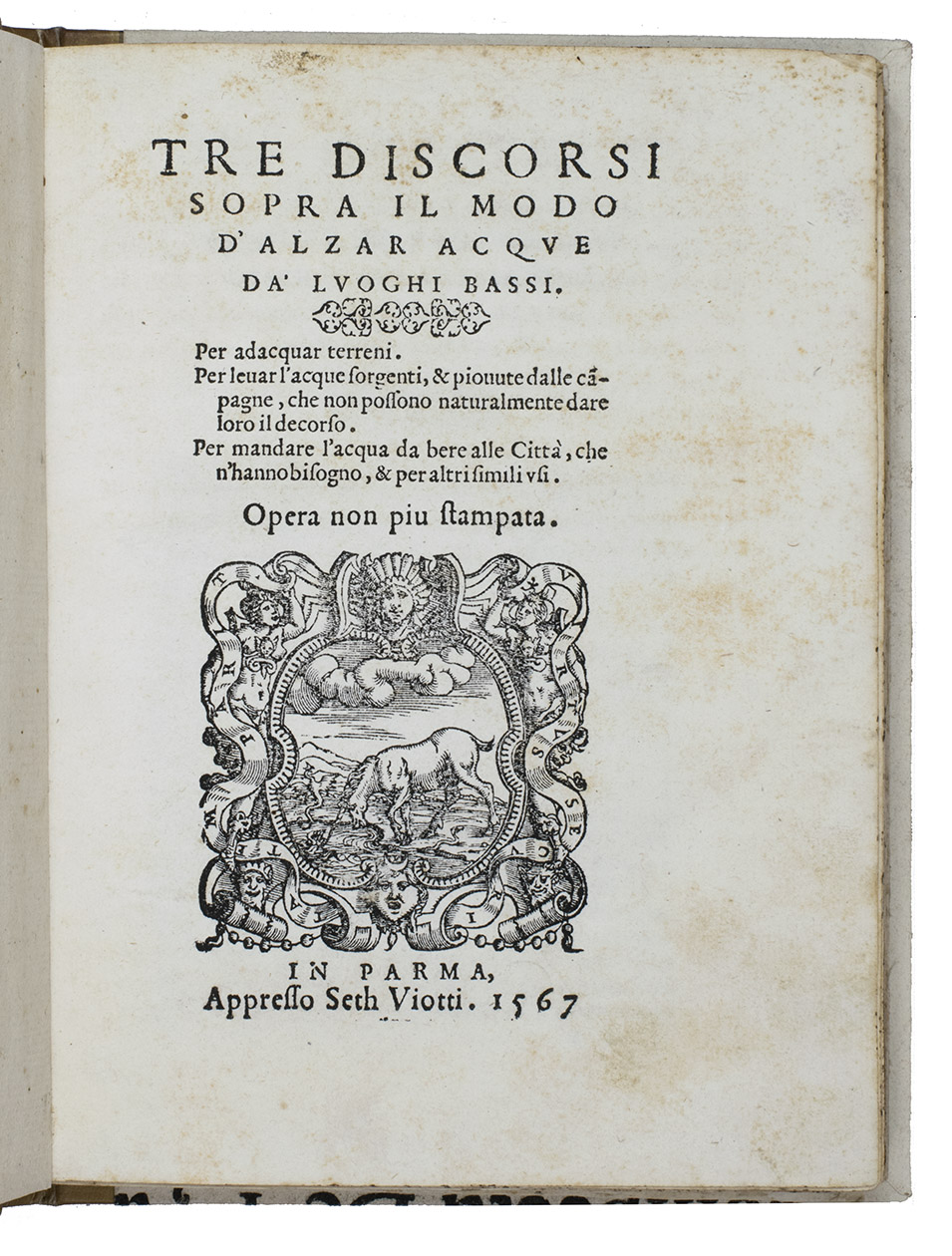 Tre discorsi sopra il modo d'alzar acque da'luoghi bassi. Per adacquar terreni. Per levar l'acque sorgenti, & piouute dalle campagne, che non possono naturalmente dare loro il decorso. Per mandare l'acqua da bere alle città, che n'hanno bisogno, & per altri simili vsi.