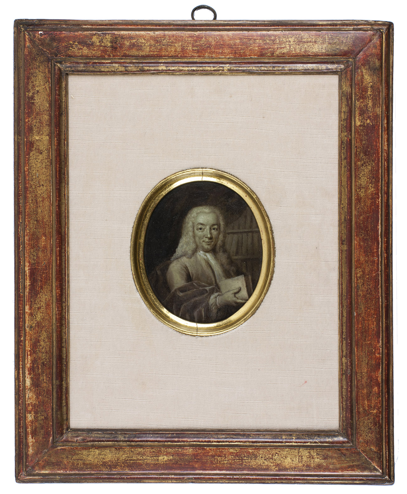 [France?], "1687" [= ca. 1735?]. Oval portrait painting (11 x 9 cm) in grisaille on copper, with a note on the back "J. de Cerf A[nn]o 1687". Mounted in a gilt rectangular wooden frame (34.5 x 28 cm).