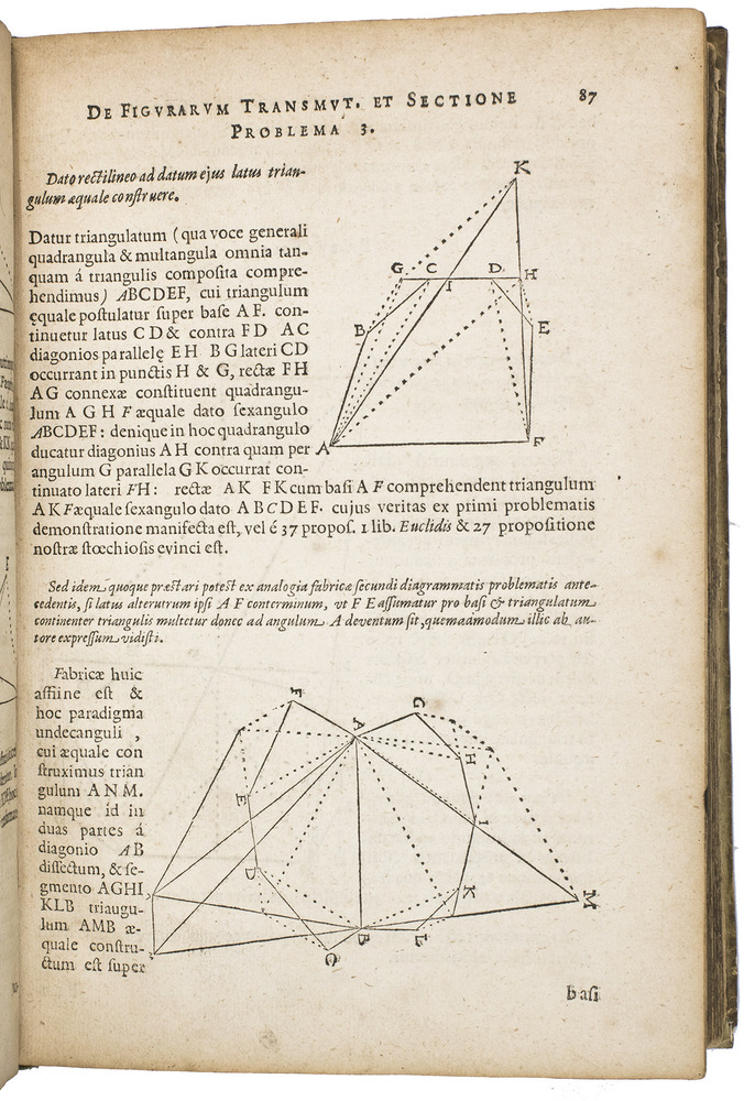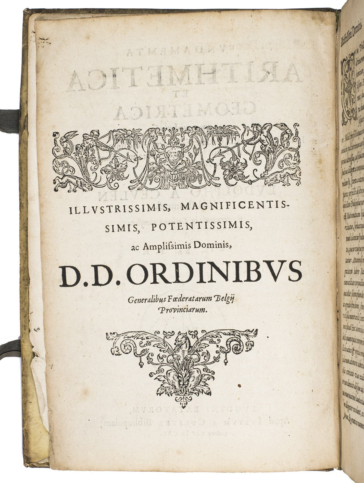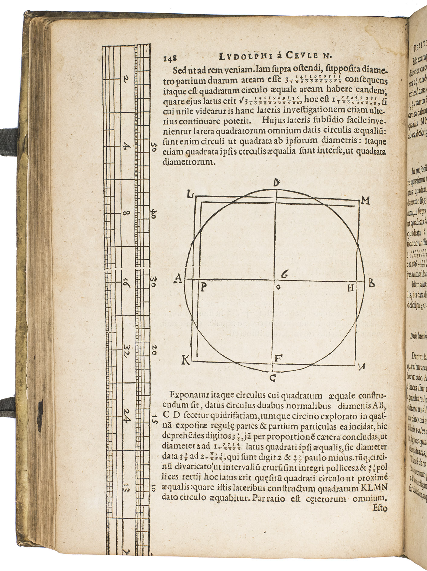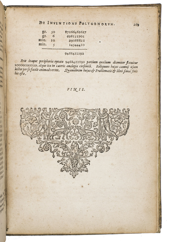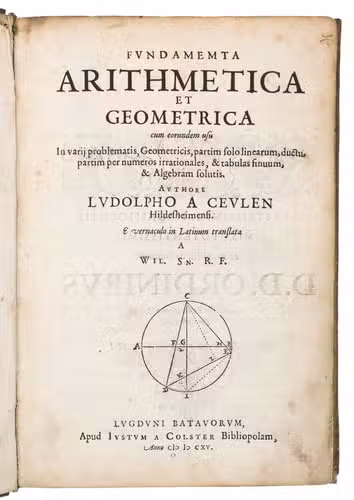First Latin edition of two important mathematical treatises by Ludolf van Ceulen (1539-1610) both translated by Van Ceulen's pupil, Willebrord Snell (1580-1626). There are at least three and perhaps more issues of the present edition. Apparently with all leaves ever present in this issue, whereas most copies lack one or more. The present Van Colster issue is clearly intended for the Dutch Republic and its supporters while the Van der Marsce issue is clearly aimed at the Spanish-controlled Southern Low Countries and its supporters. The Marcus issue is more neutral.