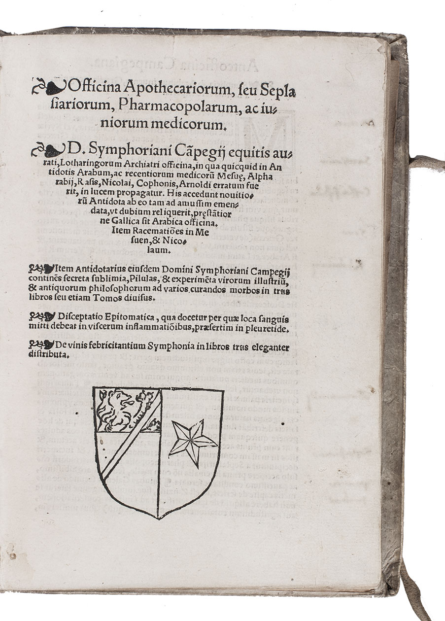 First and only edition of a work on the history of medicine by the French doctor Symphorien Champier (1472-1539). During his career Champier switched several times from being appreciative to critical towards Arab authors. In one of his earlier works, he describes Avicenna (Ibn Sina) as "a man of most outstanding genius and certainly the most distinguished of all" (Siraisi). On the other hand, he later criticised Italian doctors, "who allowed their schools to be occupied by 'Arabs, Persians, Indians and Mahometans'" (Siraisi). In the present work, which he wrote late in his career, he takes a more moderate view, admitting that Arabs indeed made useful contributions to the study of medicine, and calling Avicenna the noblest of them all. The text can be seen as a brief history of medicine, dividing it in three sections: Greek, Latin and Arabic medicine. For the Latin he makes a distinction between Latini, those who follow Galen and Hipprocrates (Boqrat), and barbari, those who set out their own path.