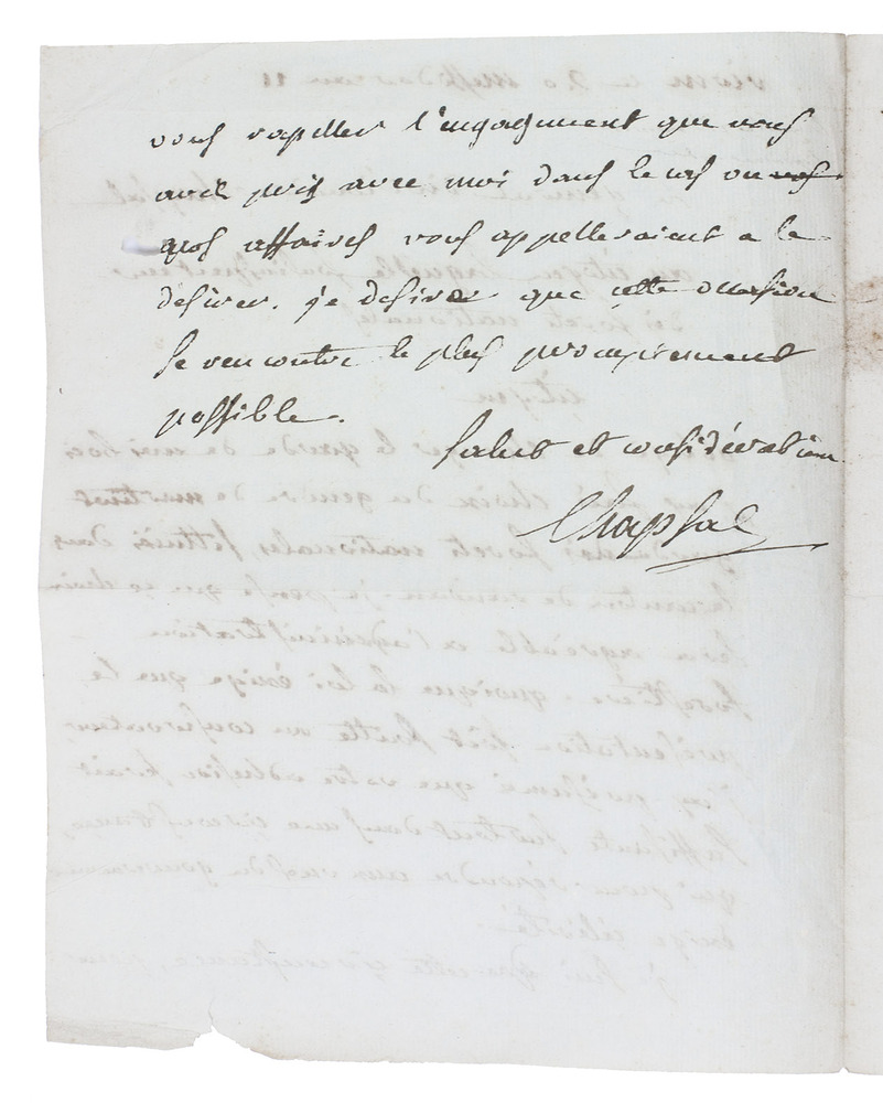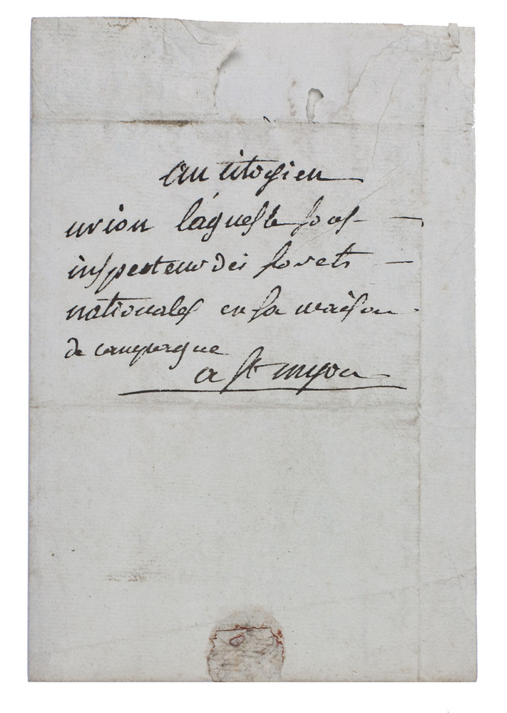 Autograph letter by the French lieutenant Jean-Antoine Chapsal (1753-1834), addressed to Urion Laguesse, "sous-inspecteur des forets nationales", concerning the appointment of a forester to oversee his woods. He tells Laguesse that, since a forest ranger is required by law, he can appoint someone he thinks appropriate without consulting Chapsal.