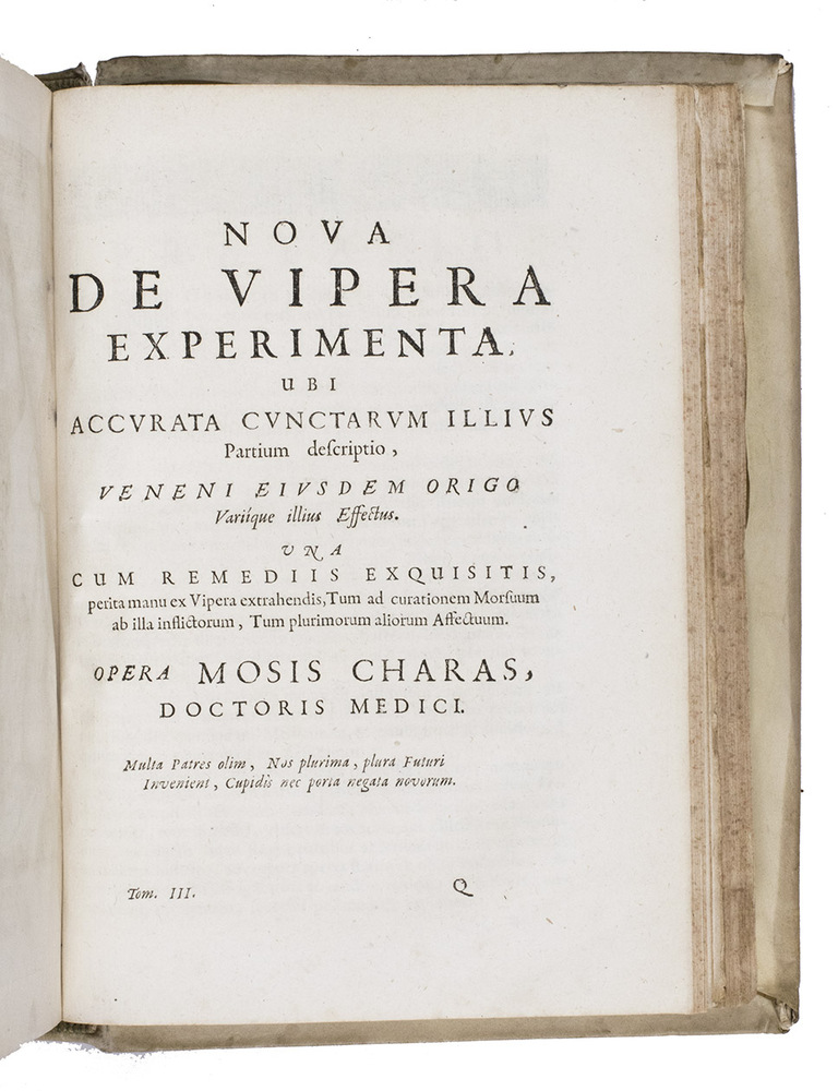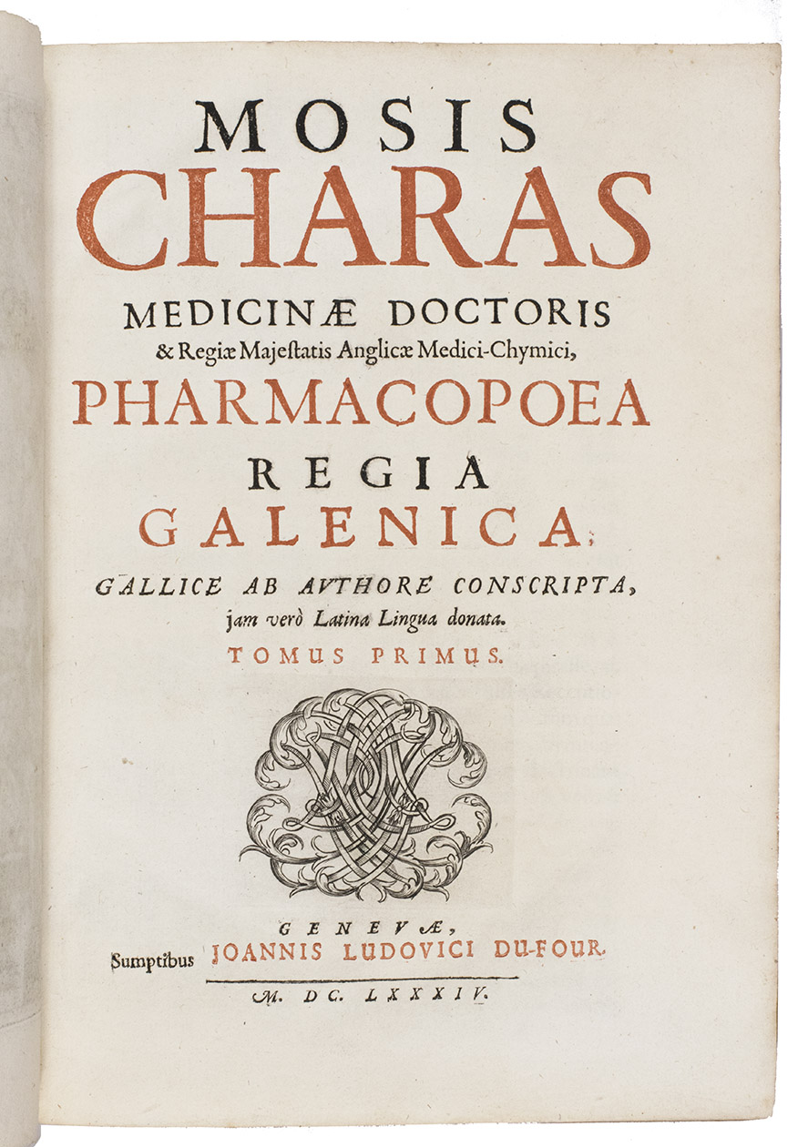 (1) CHARAS, Moyse. Pharmacopoea regia Galenica.(2) CHARAS, Moyse. Pharmacopoea regia chymica.(3) CHARAS, Moyse. Historiam naturalem animalium, plantarum et mineralium, theriacae andromachi compositionem ingredientium, cum experiments circa viperam