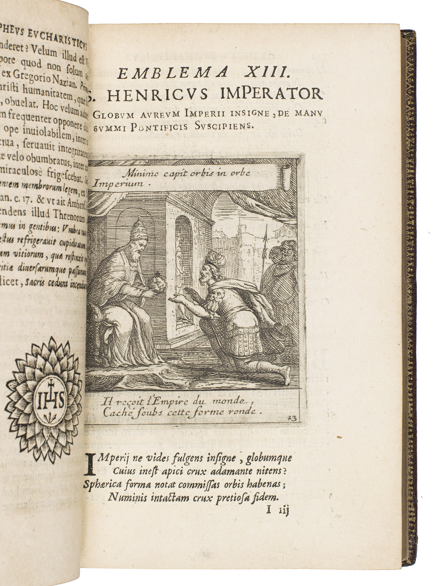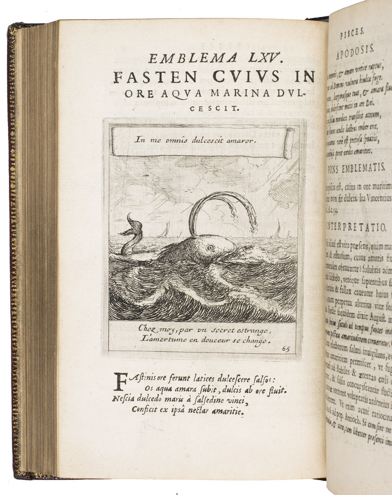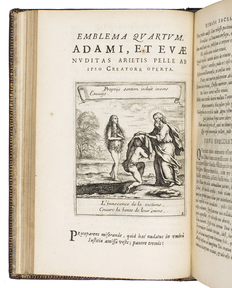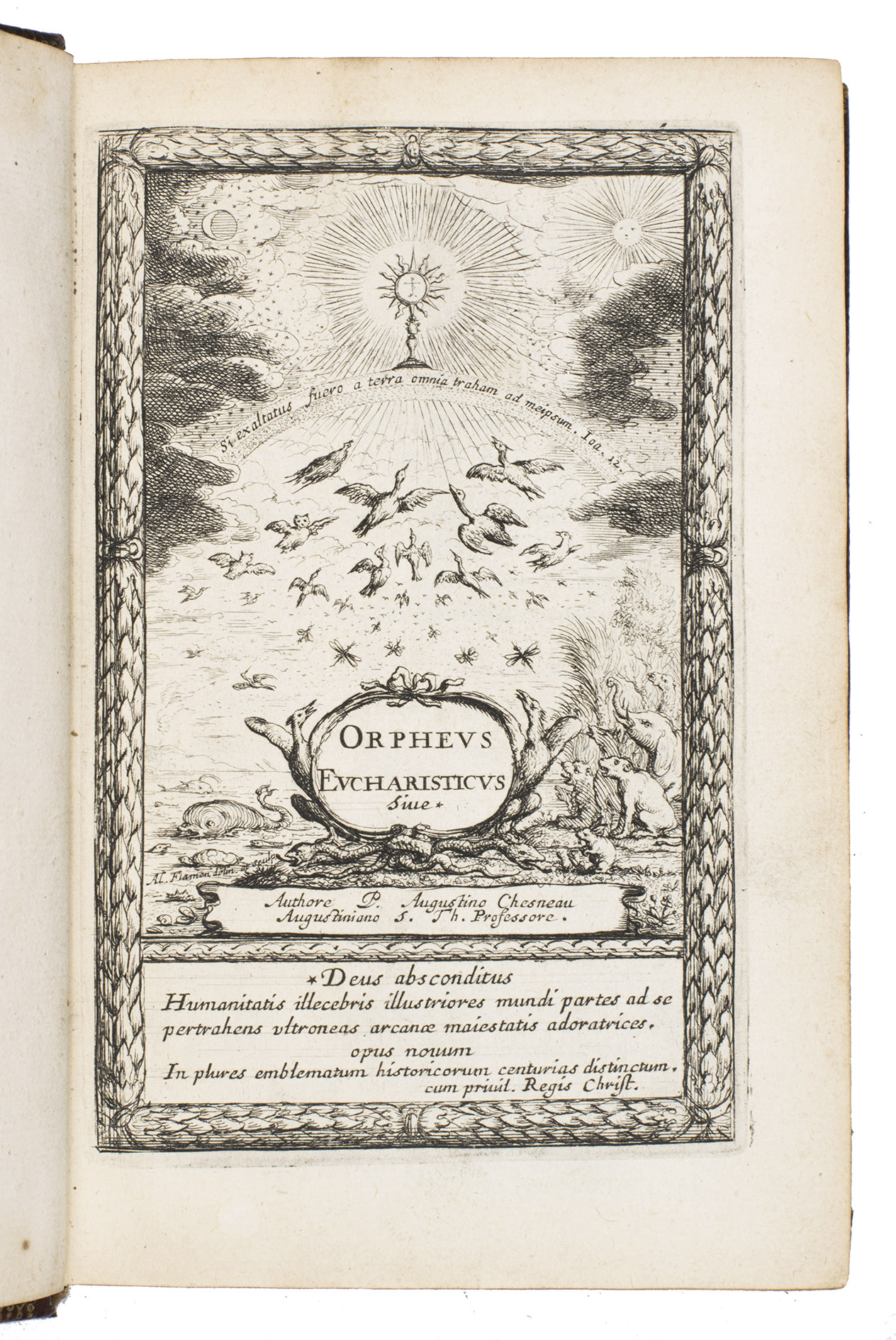 First edition of a remarkable religious emblem book by Augustin Chesneau (1615-after 1669). The emblems, each with a Latin title above and French moralising couplet below engraved in the plate, are by the Flemish painter and engraver Albert Flamen (1620-1674). Flamen's engravings mainly show landscapes and animals such as birds, fish, Whale, dolphin, reptiles, trees, ships and various people. Greek and Christian mythological symbols are used in the emblems, apparently combined into a new mythology. Flamen's style in engraving reminds of that of Wenceslaus Hollar, and a lot of his images are connected with the world of animals, as is also the case in this work. This edition was re-issued in 1659 as the "editio secunda", with a cancelled letterpress title page. A French edition was published by the same publisher in 1667 as Emblèmes sacrez sur le tres-saint et tres-adorable sacrement de l'eucharistie.