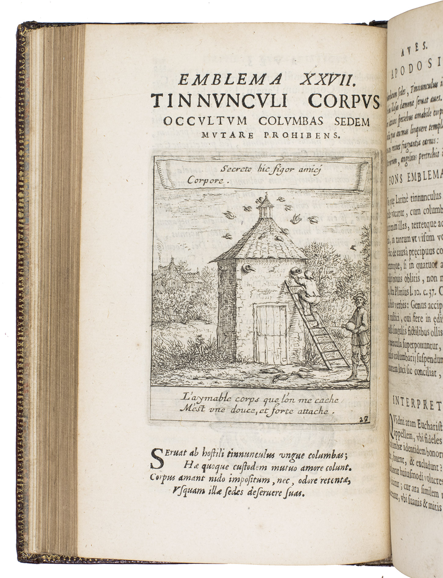 Paris, Florentin Lambert, 1657. 8vo. With an engraved title page, a typographical title page with a small woodcut ornament, 101 engraved emblems by Albert Flamen in the text (1 unnumbered on page 5, 100 numbered I-C), further with woodcut initials and woodcut tailpieces. Late 17th- or early 18th-century gold-tooled red morocco. 699, [33] pp.