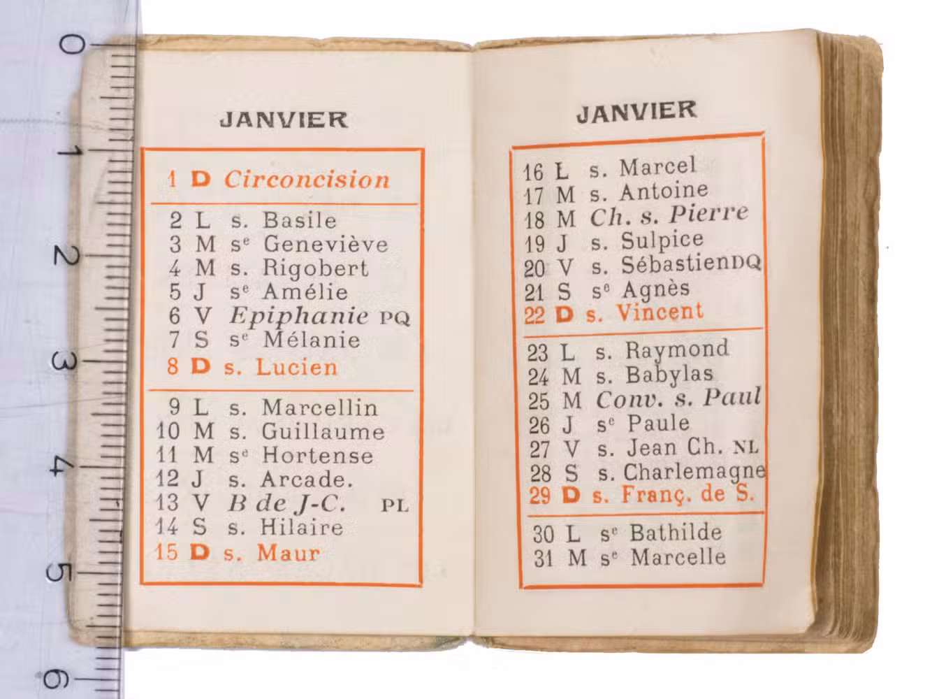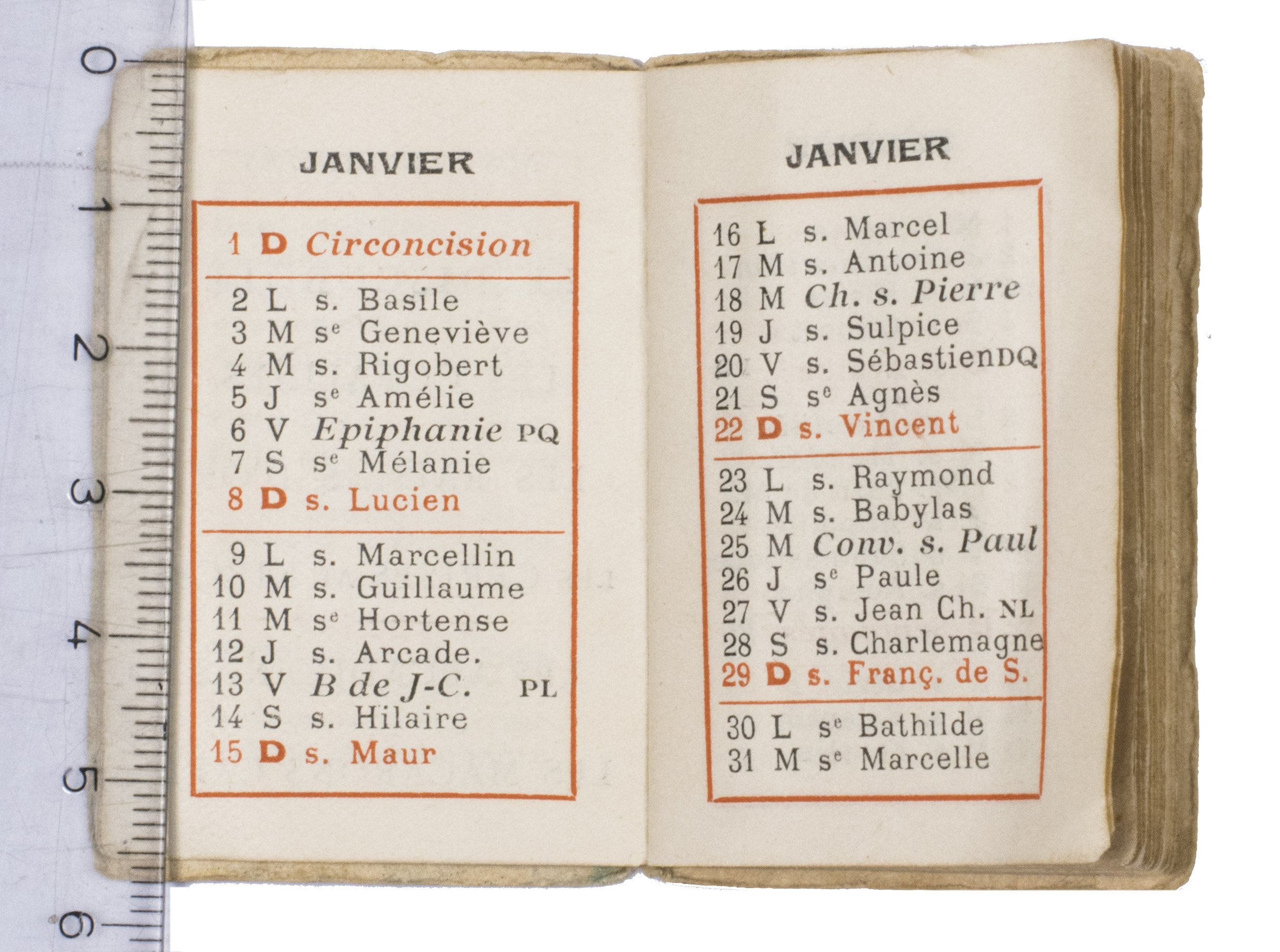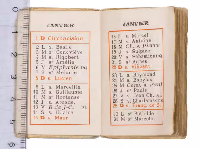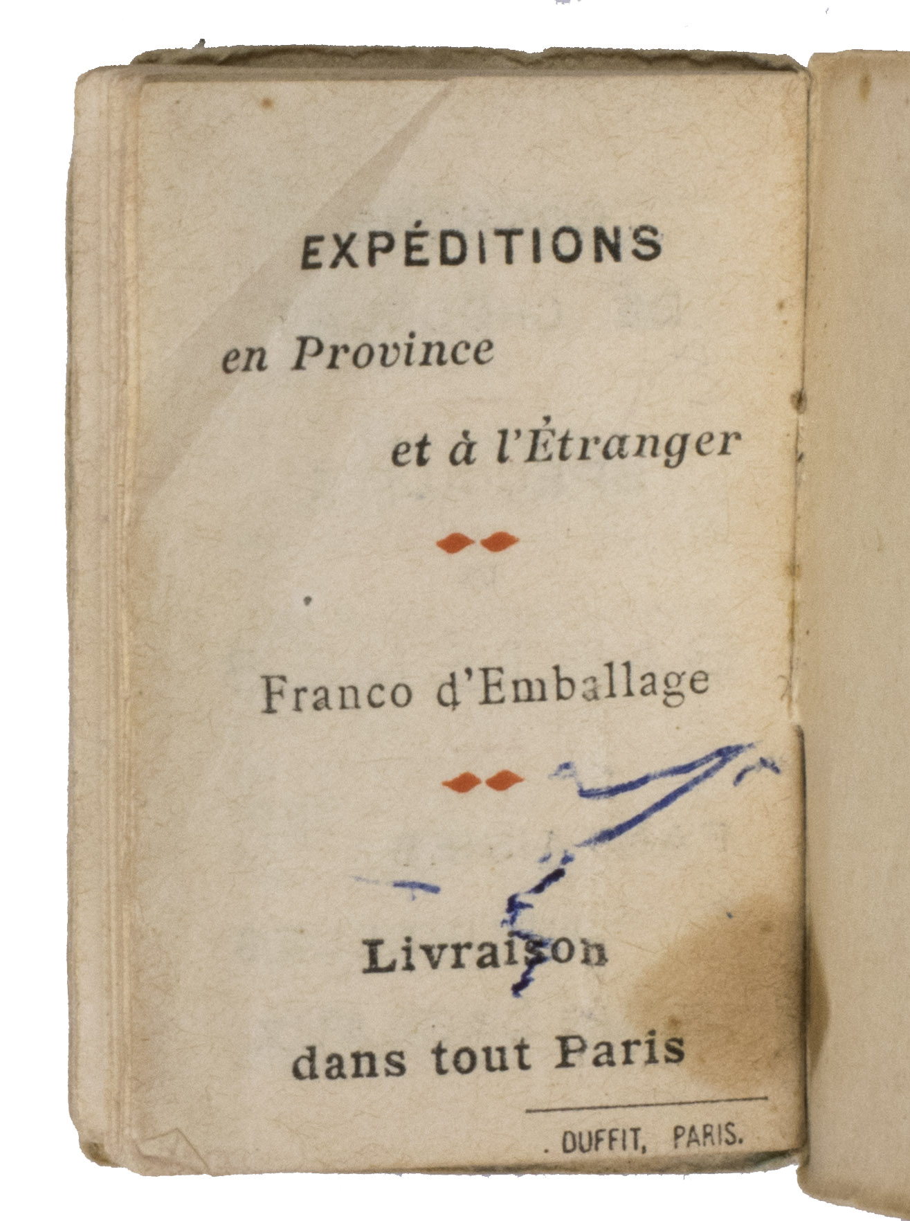 Paris, (colophon:) Duffit, 1922 Ca. 5.8 x 4 cm. The calendar has been printed in red and black. Contemporary wrappers stapled to the bookblock, with a blue floral design on the front. [20] ll.