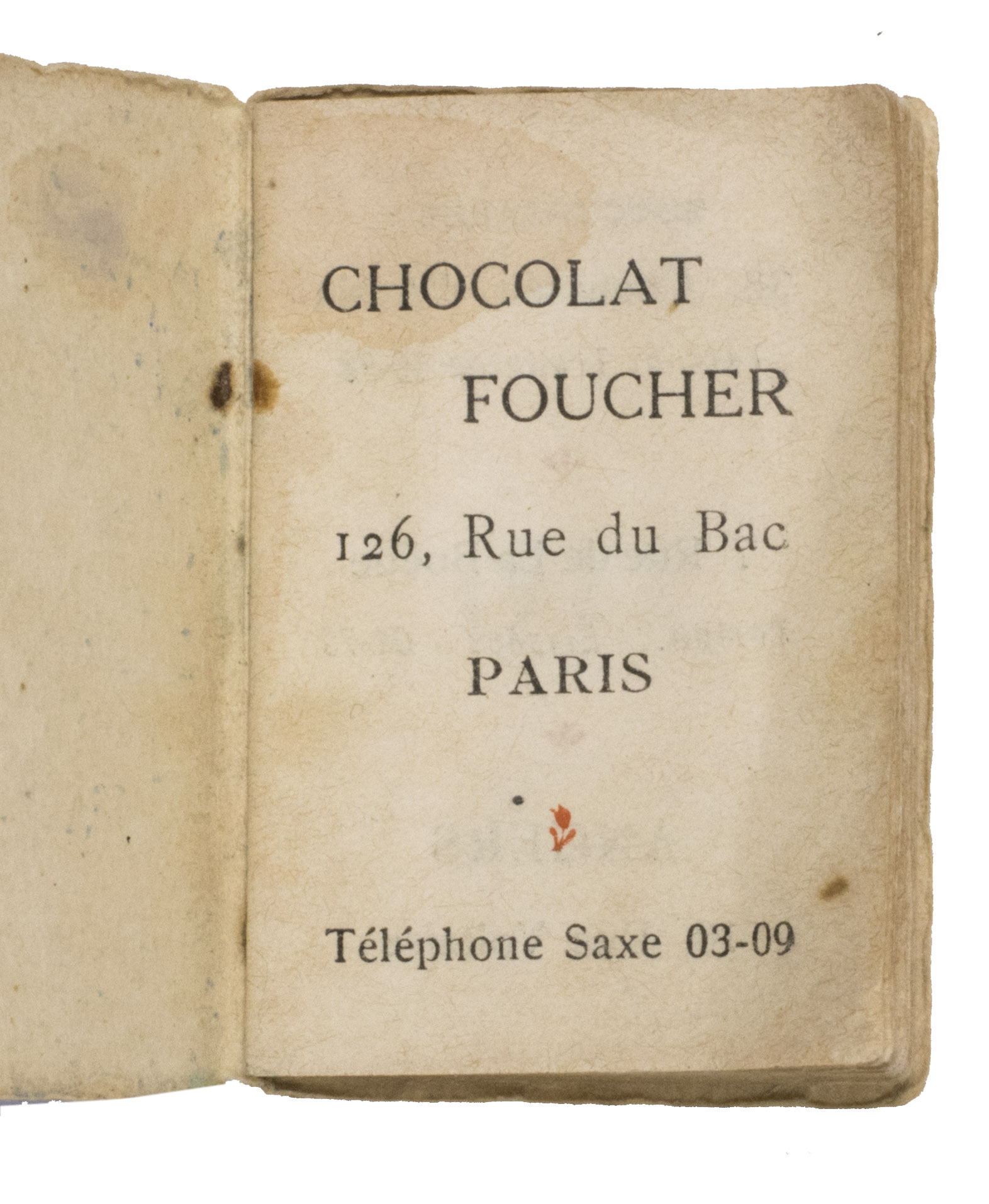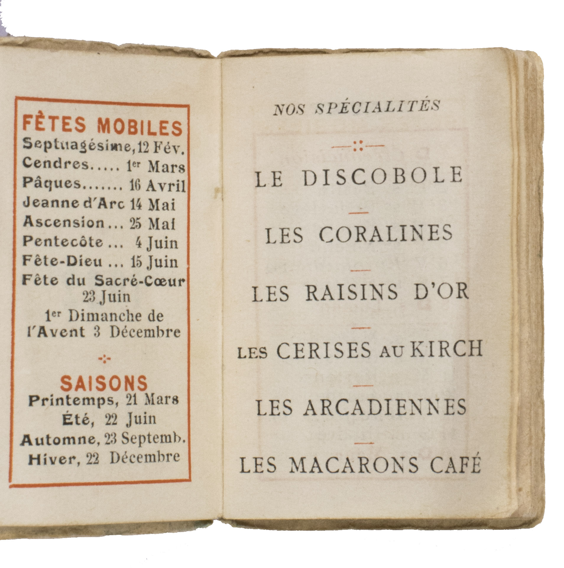 Advertorial almanac for 1922 by Chocolate Foucher, one of the oldest chocolate and sweets houses of Paris. In the 19th century, it was fairly common for chocolate confectioners in Paris to gift their most valued clients an almanac as a new year's gift. The present work was likely a recreation of that practice. It consists of a calendar for 1922, with the saint of each day mentioned. Printed on the leaves in between the months are the specialties of Chocolate Foucher, such as raisins d'or, coralines, or marrons glacés. At the end follow postal rates and prices. The work offer insight into the history of the company and of sweets in Paris in the early 1920s.