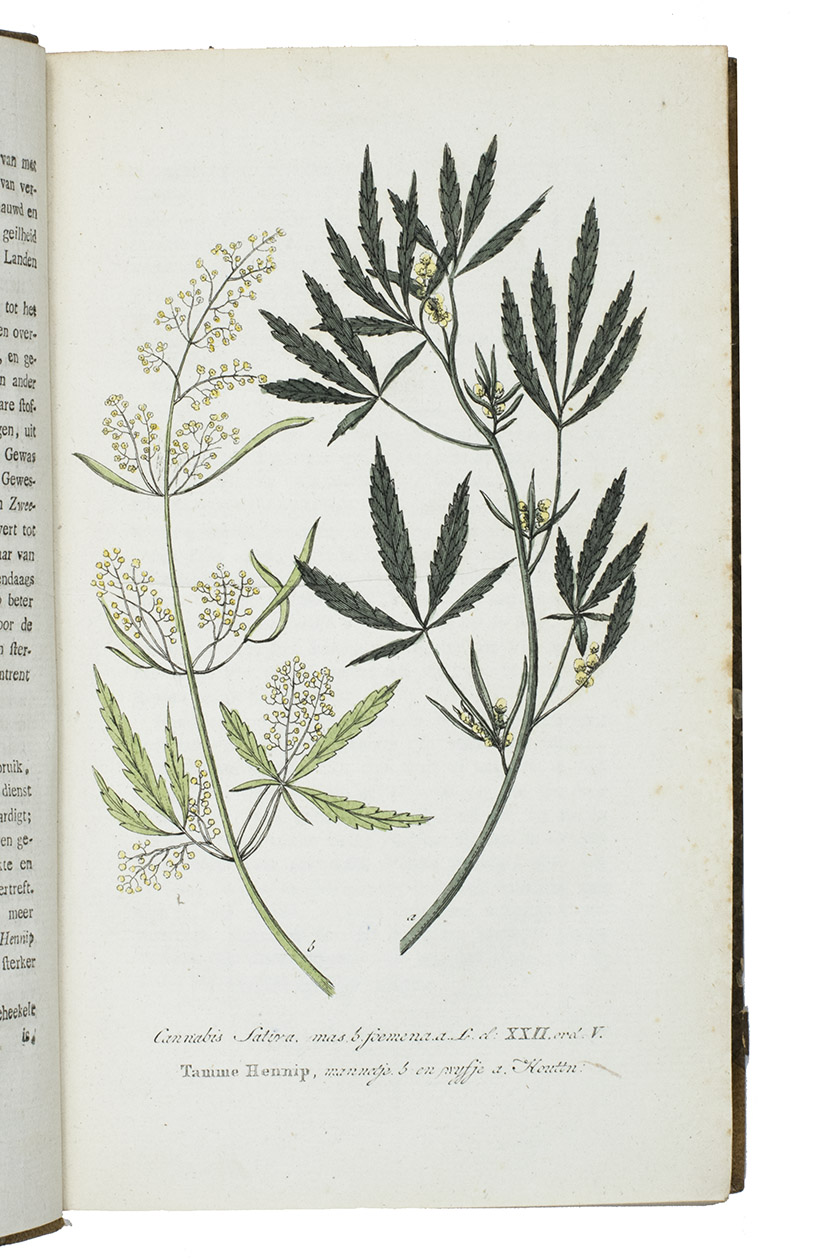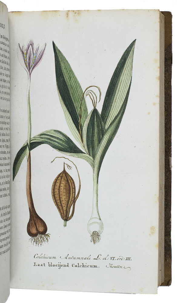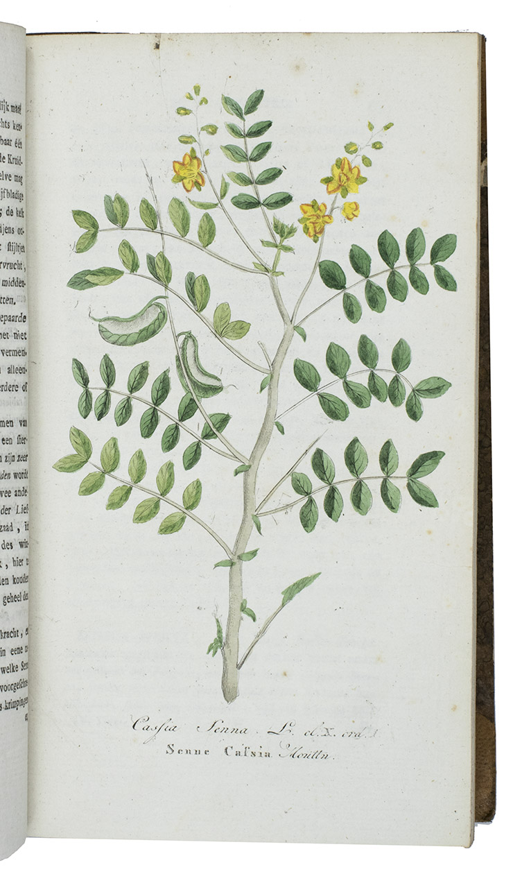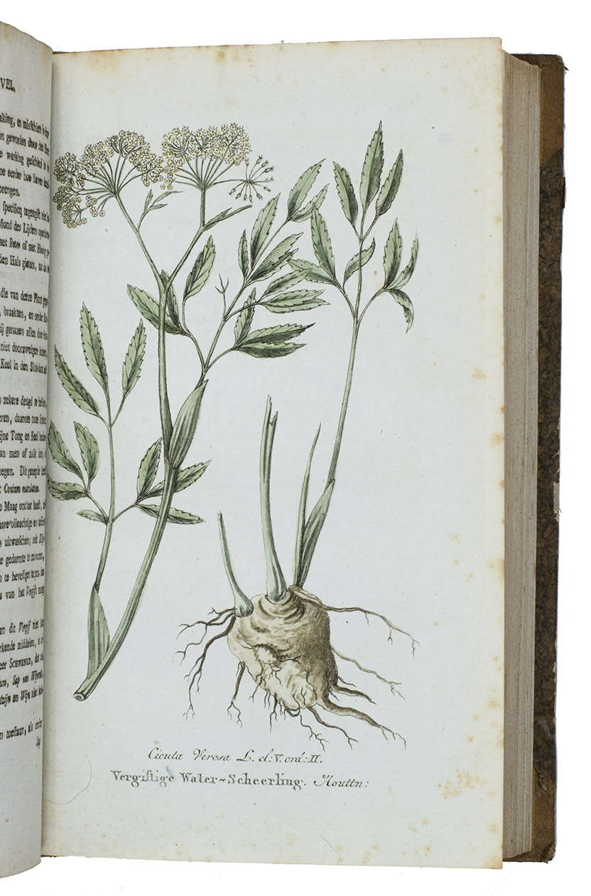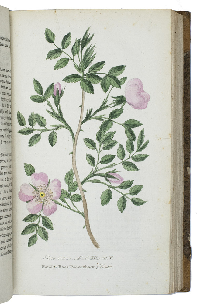 Amsterdam, Johannes Allart, 1800-1803. 4 volumes. Large 8vo. With 24 hand-coloured engraved plates of different plants, herbs, mushrooms, flowers, trees and animals. All volumes bound in contemporary half goatskin with marbled sides, gold-tooled spine with an orange and blue morocco label. XII, 560; [4], 584; [4], 568; [4], 598 pp.