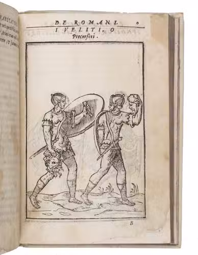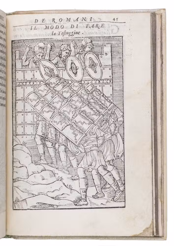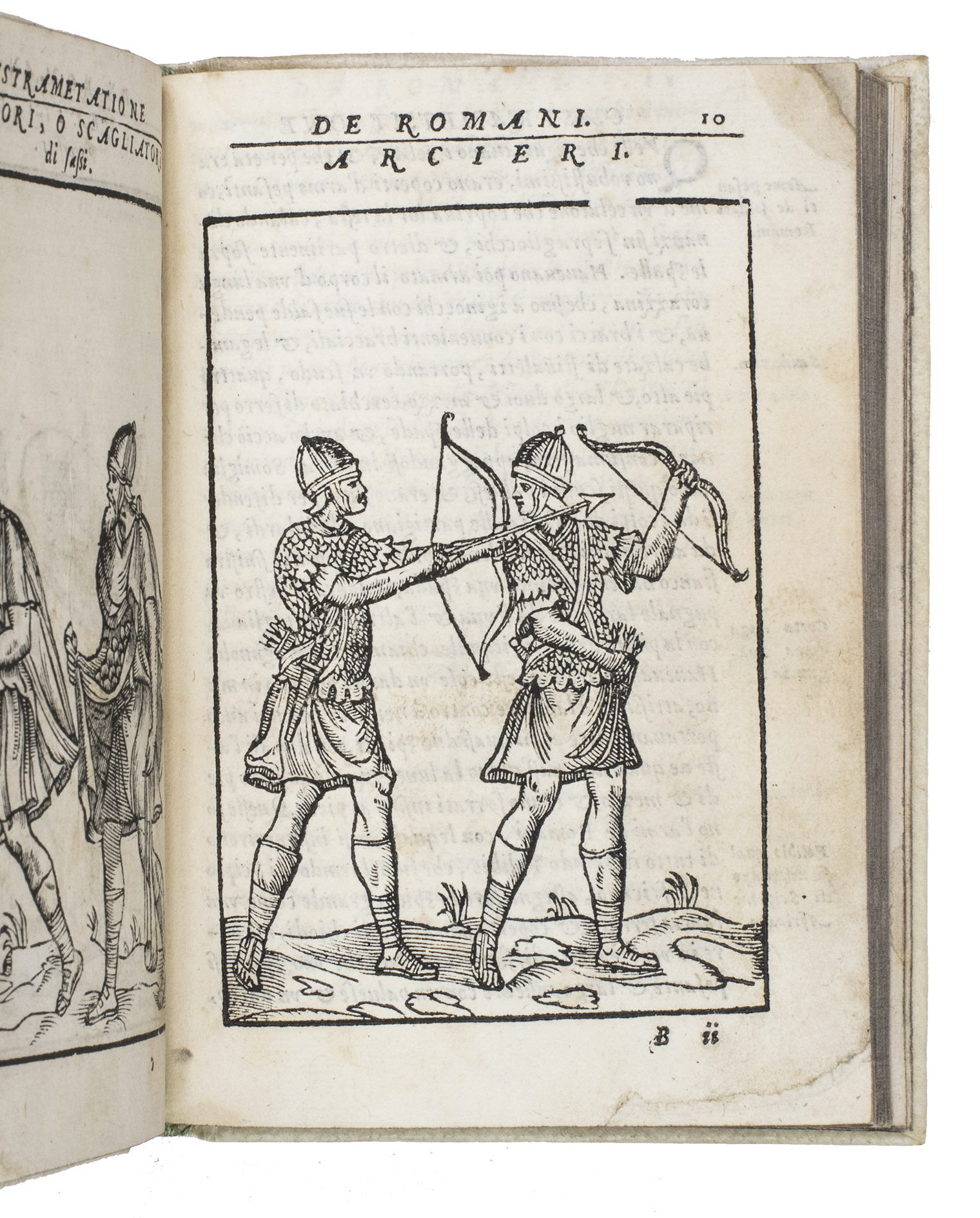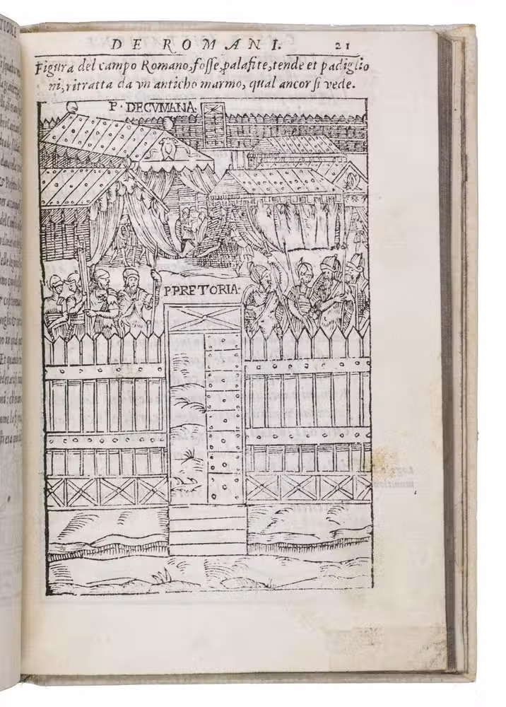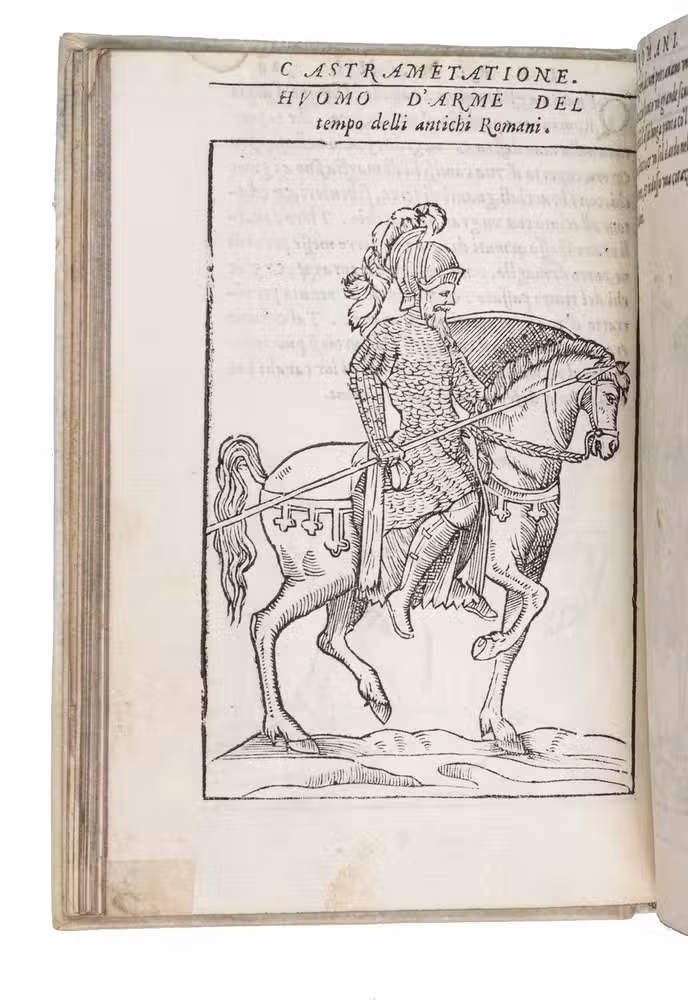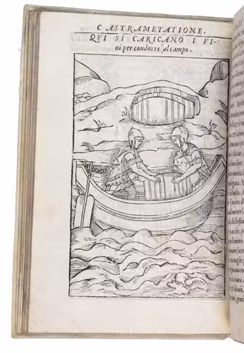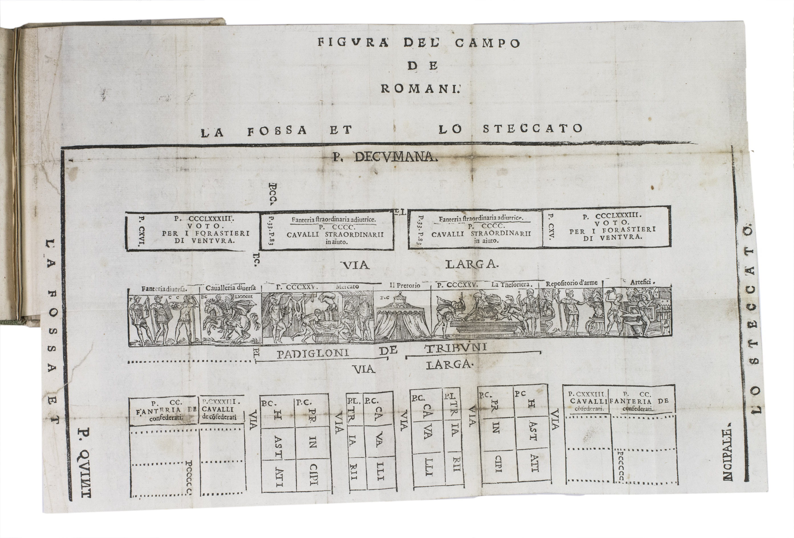 [Padua], Marc Antonio Olmo, 1558. 8vo. The word "Discorso" printed in woodcut border at the top of the title-page, with woodcut printers device: an elm with the words: "Ulmus amica viti" (the elm is friendly for vines). With 43 full-page woodcuts (ca. 11 x 7.5 cm), a large folding woodcut plate in two leaves (as issued, in total ca. 40.5 x 36 cm) of a plan of a Roman camp: "Figura del Campo de Romani", and 2 large historiated woodcut initials of 10 lines and 3 capital spaces with guide letters for initials of 5 lines. Modern vellum. 80, [4] ll.