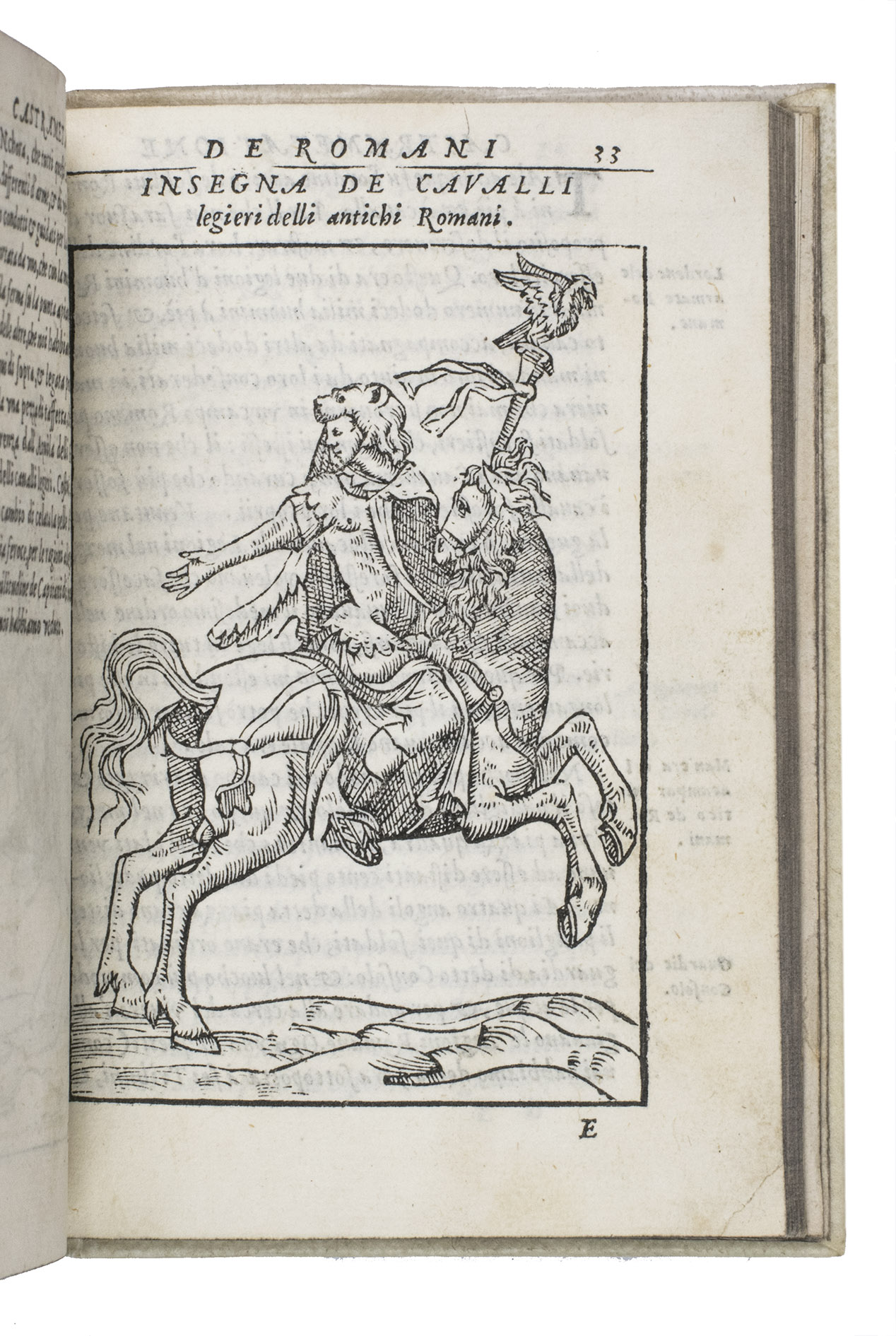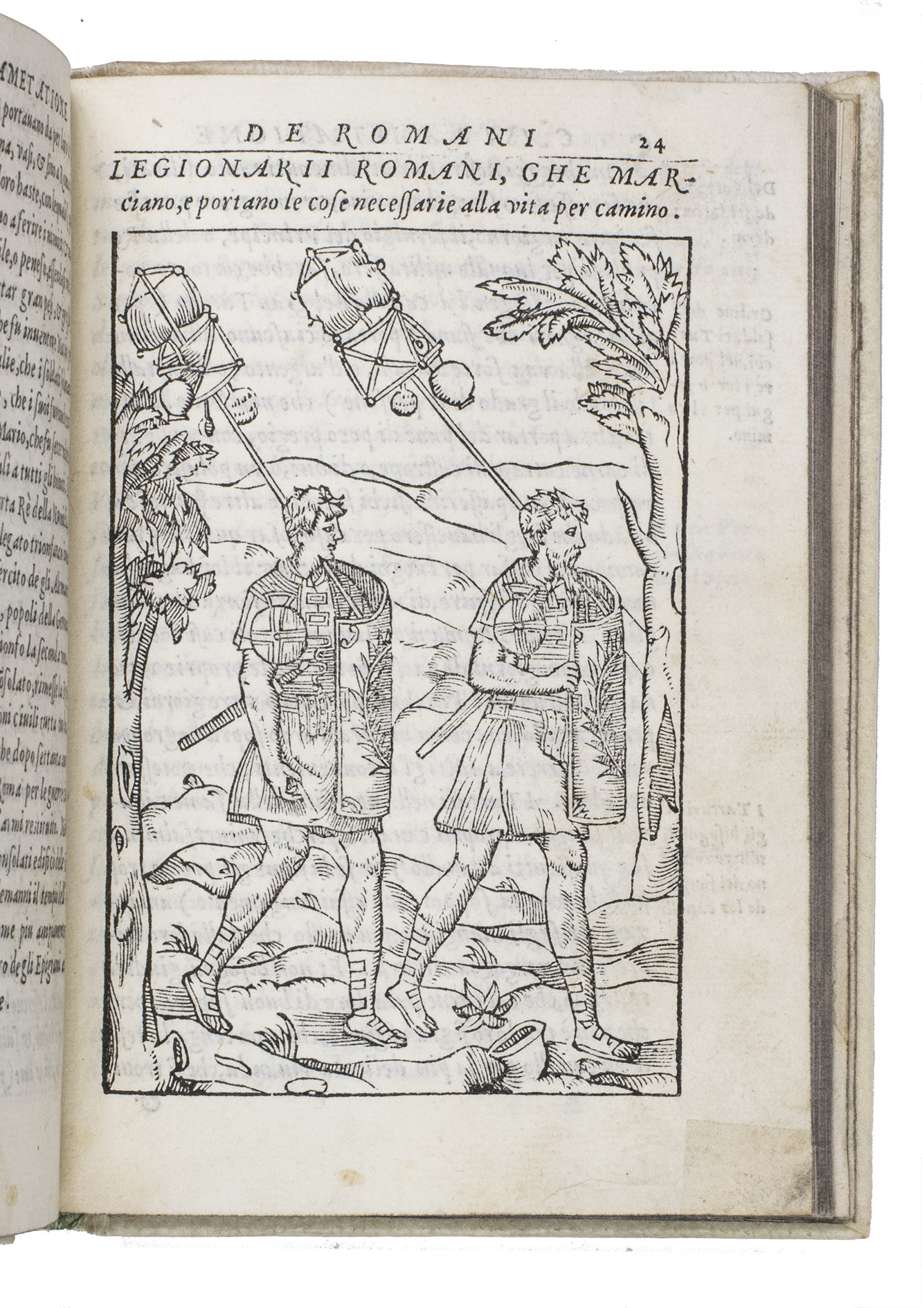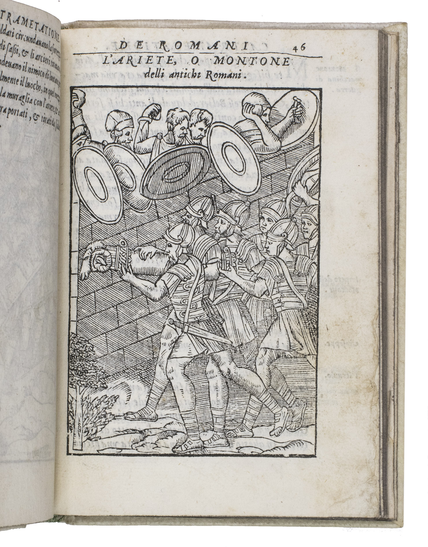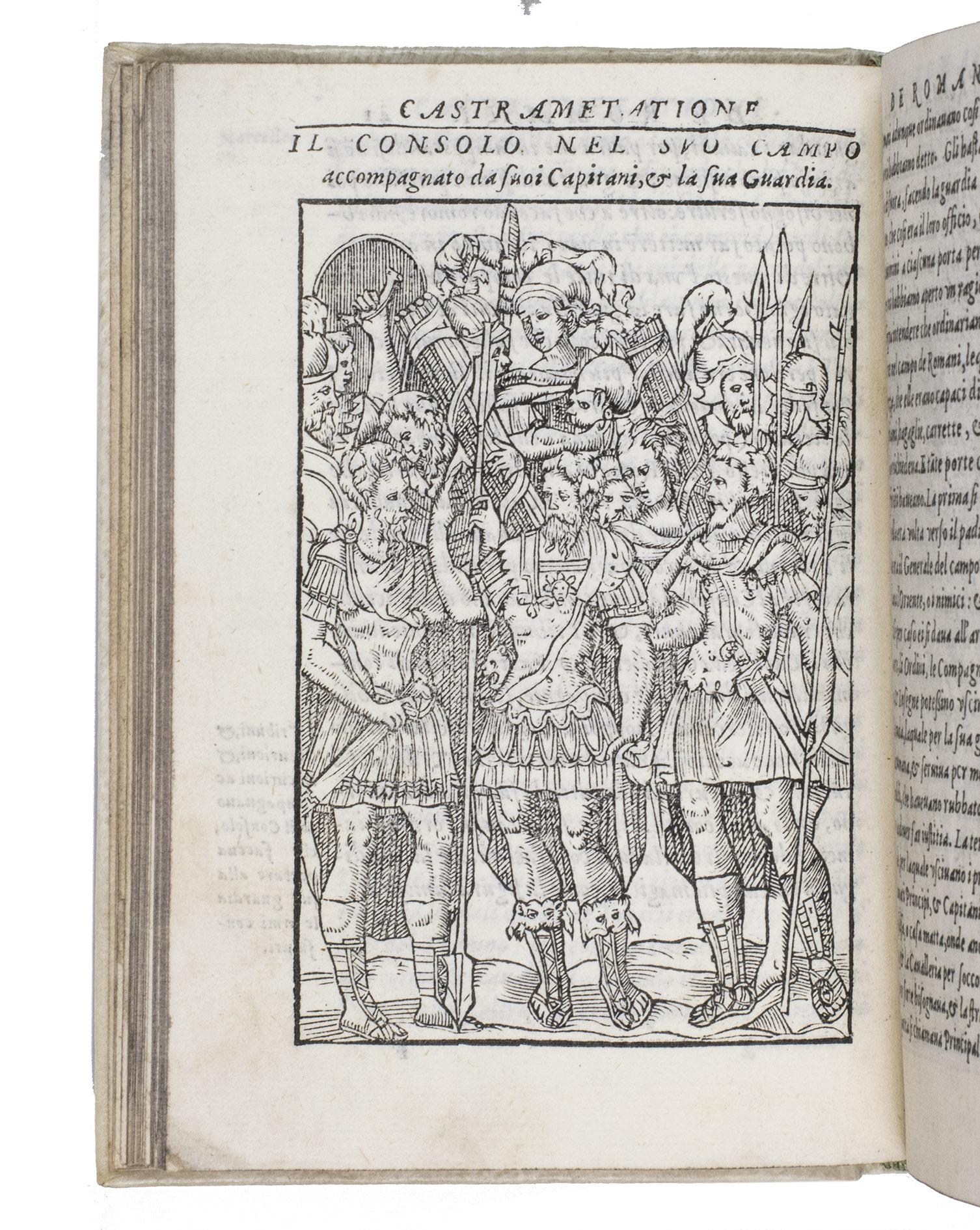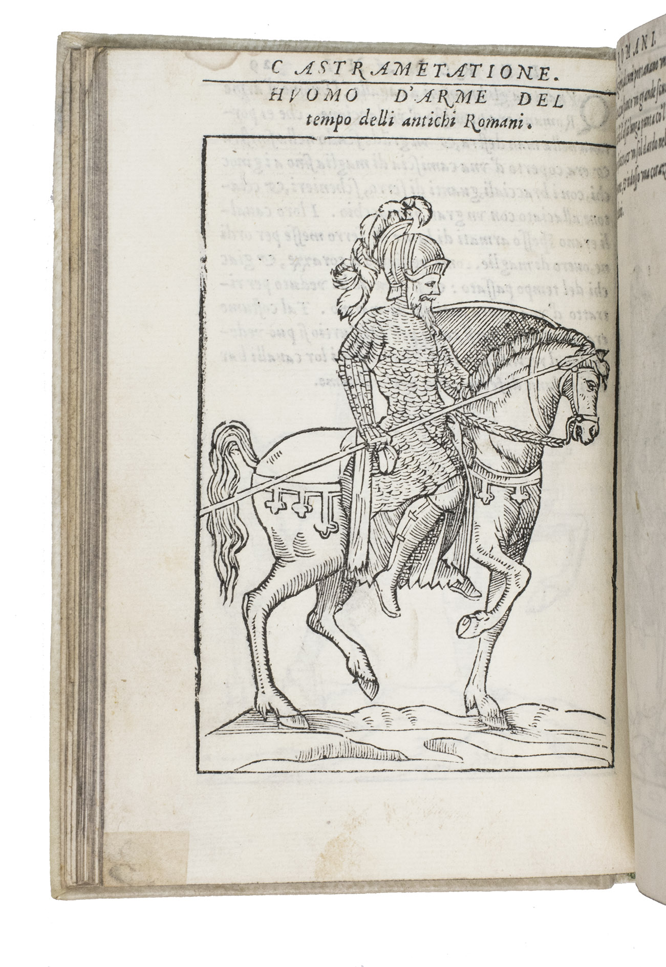 Both works are extensively and beautifully illustrated with 43 full-page woodcuts, 37 for the first, 6 for the second part. A large folding plan of a Roman castrum (Figura del Campo de Romani) is added at the end (often lacking). The woodcuts in our edition are exact copies (some in reverse) of the beautiful cuts by Pierre Edkrich, also named Pierre Cruche or Pierre Vase (ca. 1518-ca, 1590) who worked for Parisian and Lyonese printer/publishers including Guillaume Rouille, in a typical Renaissance style.