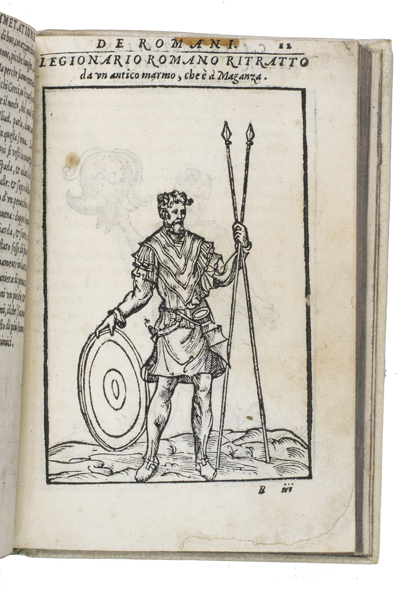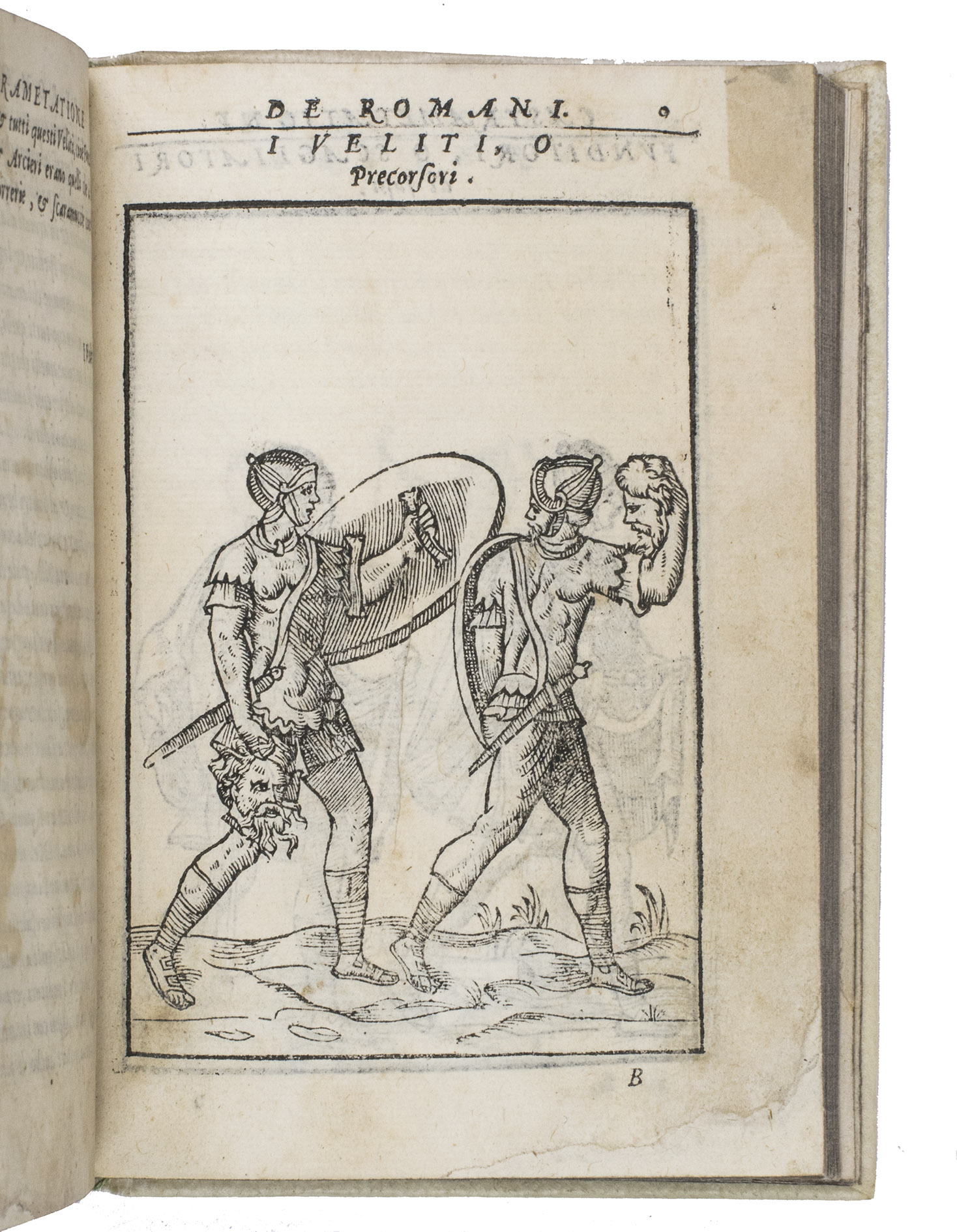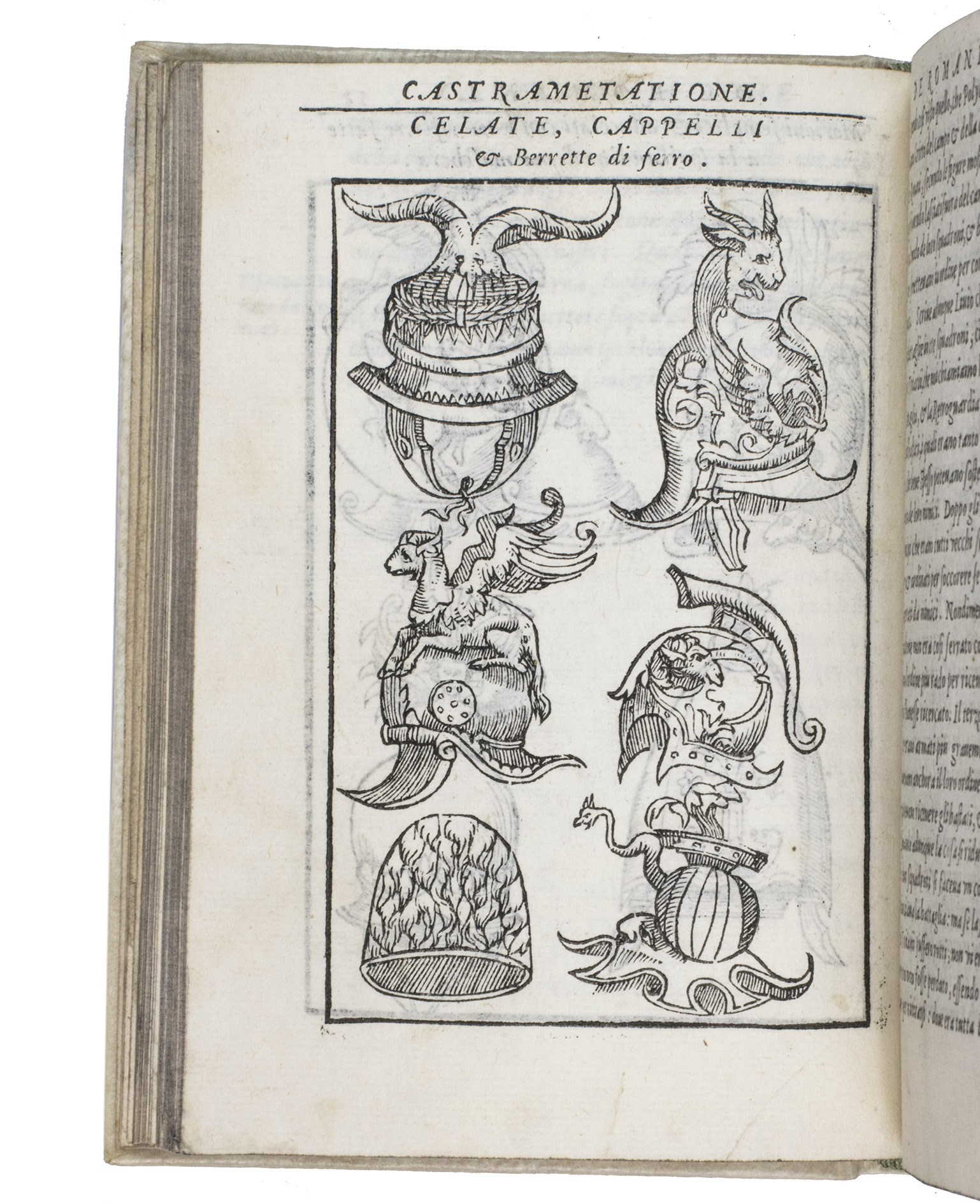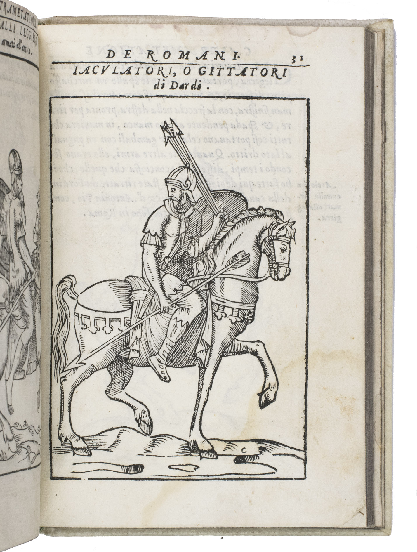 Both works are extensively and beautifully illustrated with 43 full-page woodcuts, 37 for the first, 6 for the second part. A large folding plan of a Roman castrum (Figura del Campo de Romani) is added at the end (often lacking). The woodcuts in our edition are exact copies (some in reverse) of the beautiful cuts by Pierre Edkrich, also named Pierre Cruche or Pierre Vase (ca. 1518-ca, 1590) who worked for Parisian and Lyonese printer/publishers including Guillaume Rouille, in a typical Renaissance style.