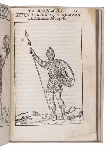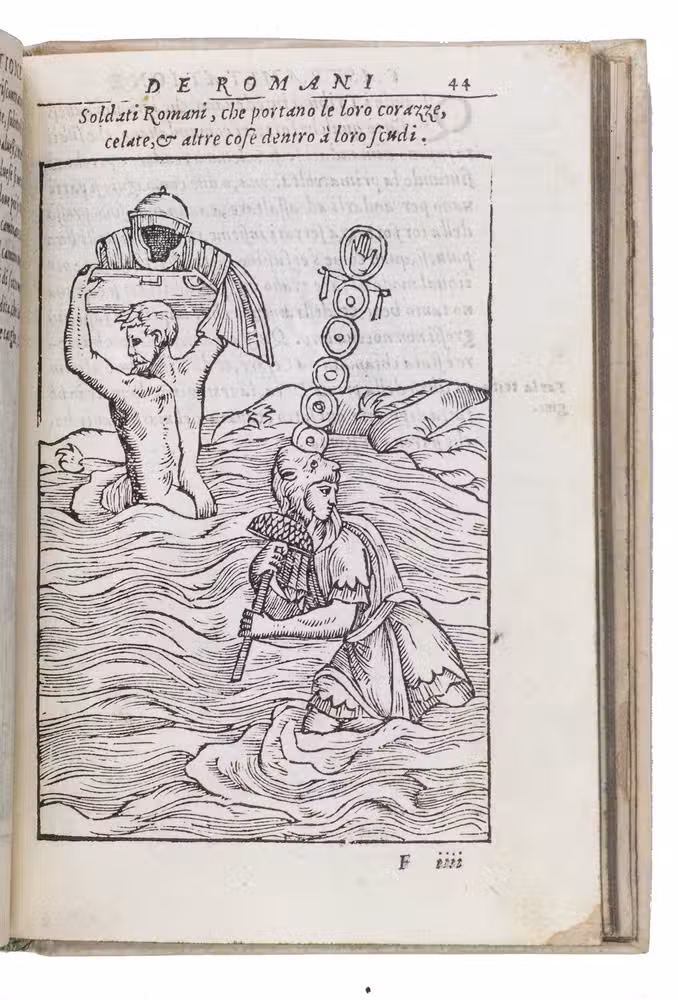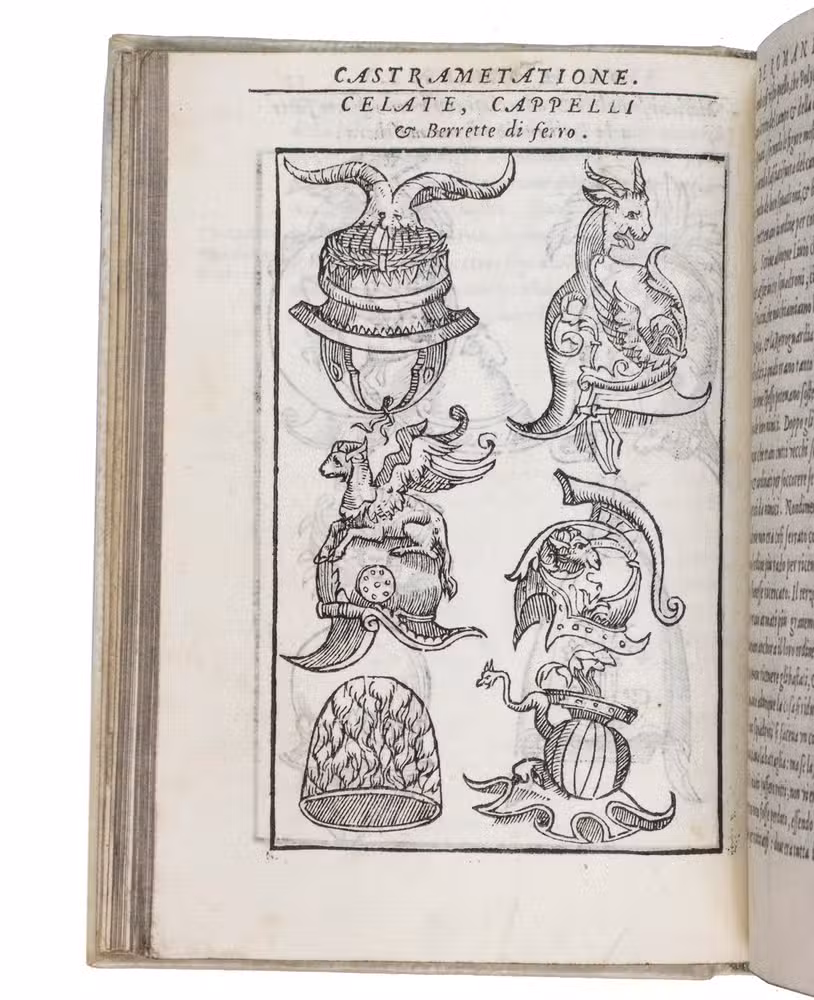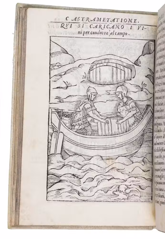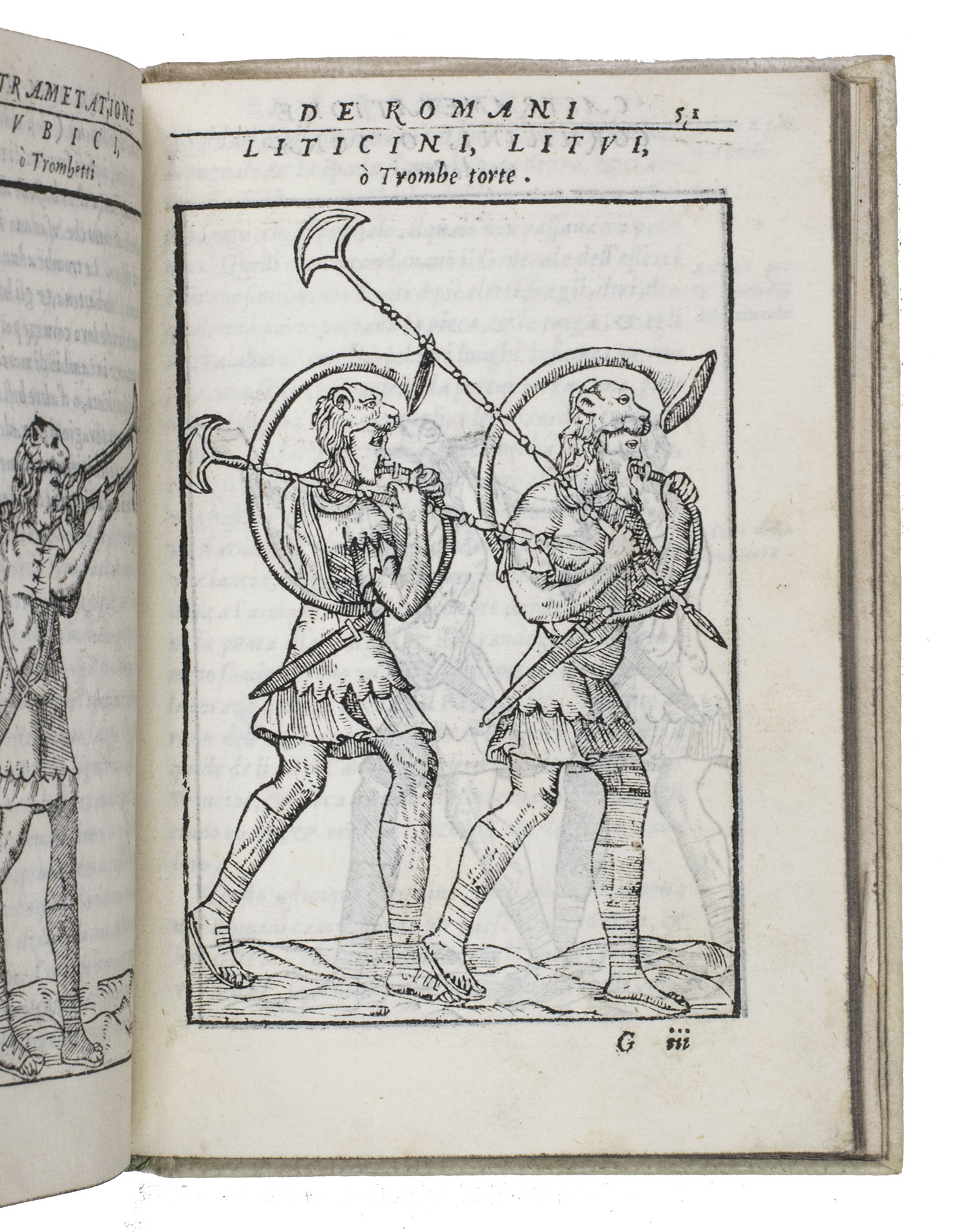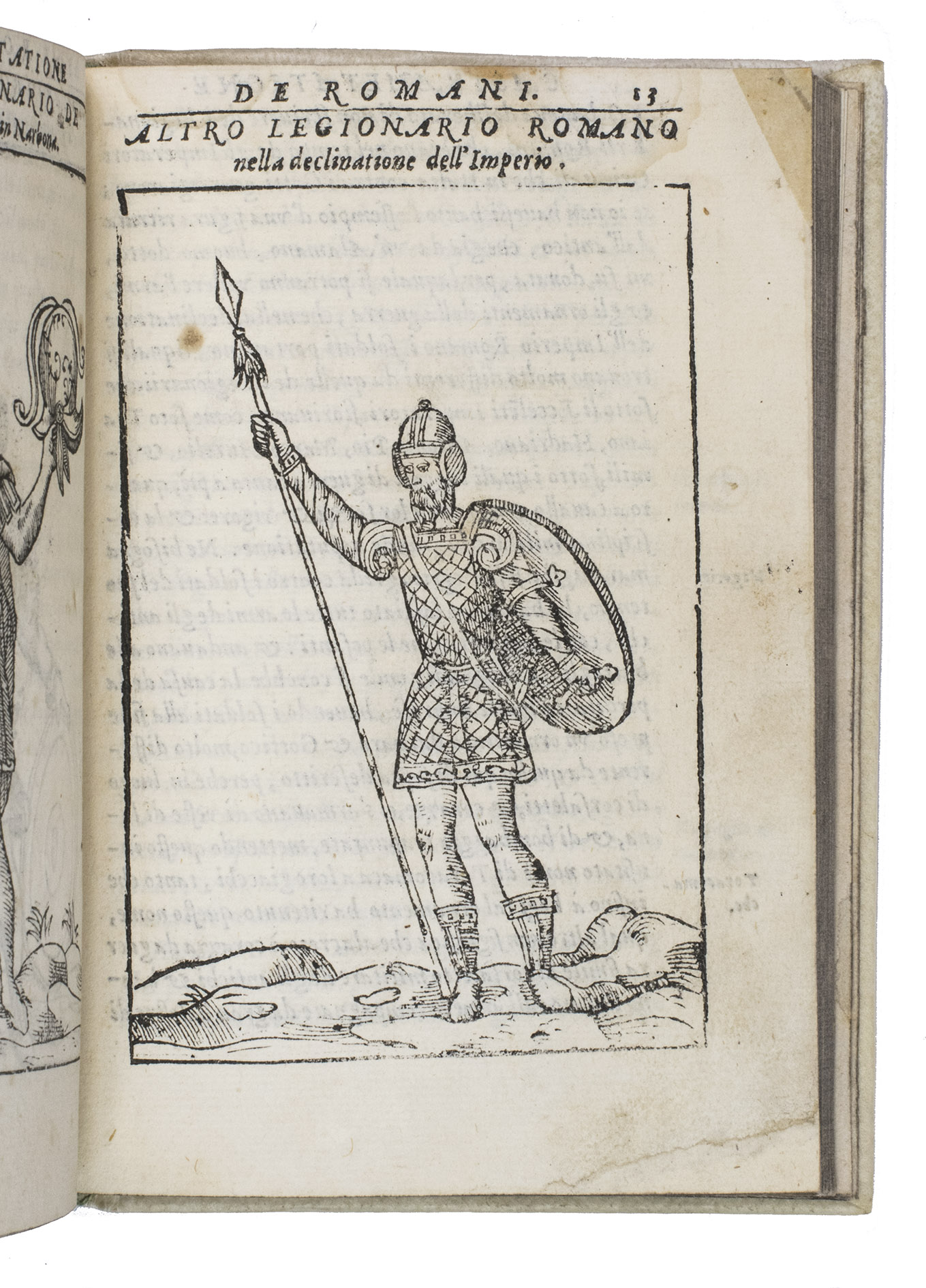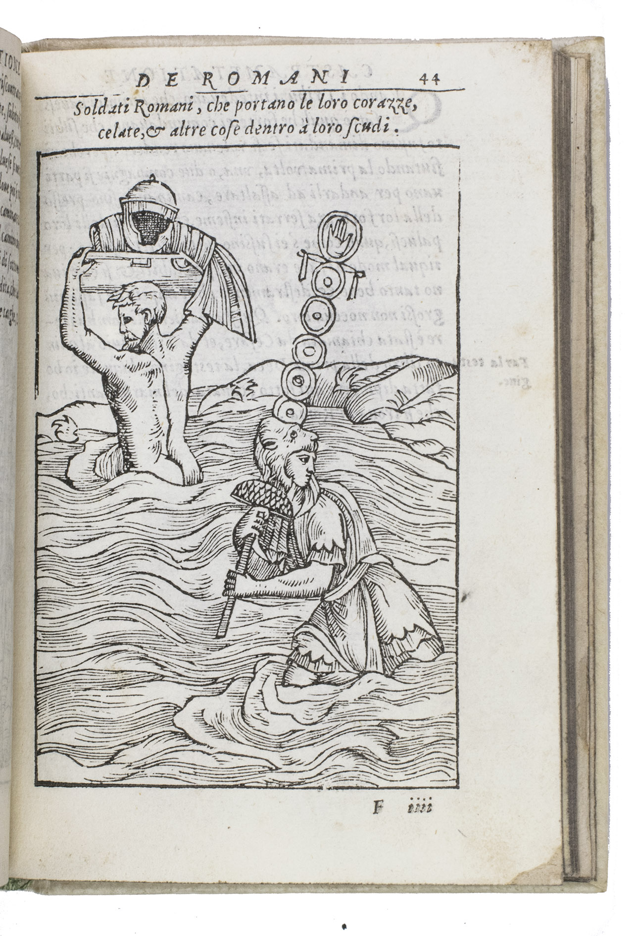 Both works are extensively and beautifully illustrated with 43 full-page woodcuts, 37 for the first, 6 for the second part. A large folding plan of a Roman castrum (Figura del Campo de Romani) is added at the end (often lacking). The woodcuts in our edition are exact copies (some in reverse) of the beautiful cuts by Pierre Edkrich, also named Pierre Cruche or Pierre Vase (ca. 1518-ca, 1590) who worked for Parisian and Lyonese printer/publishers including Guillaume Rouille, in a typical Renaissance style.