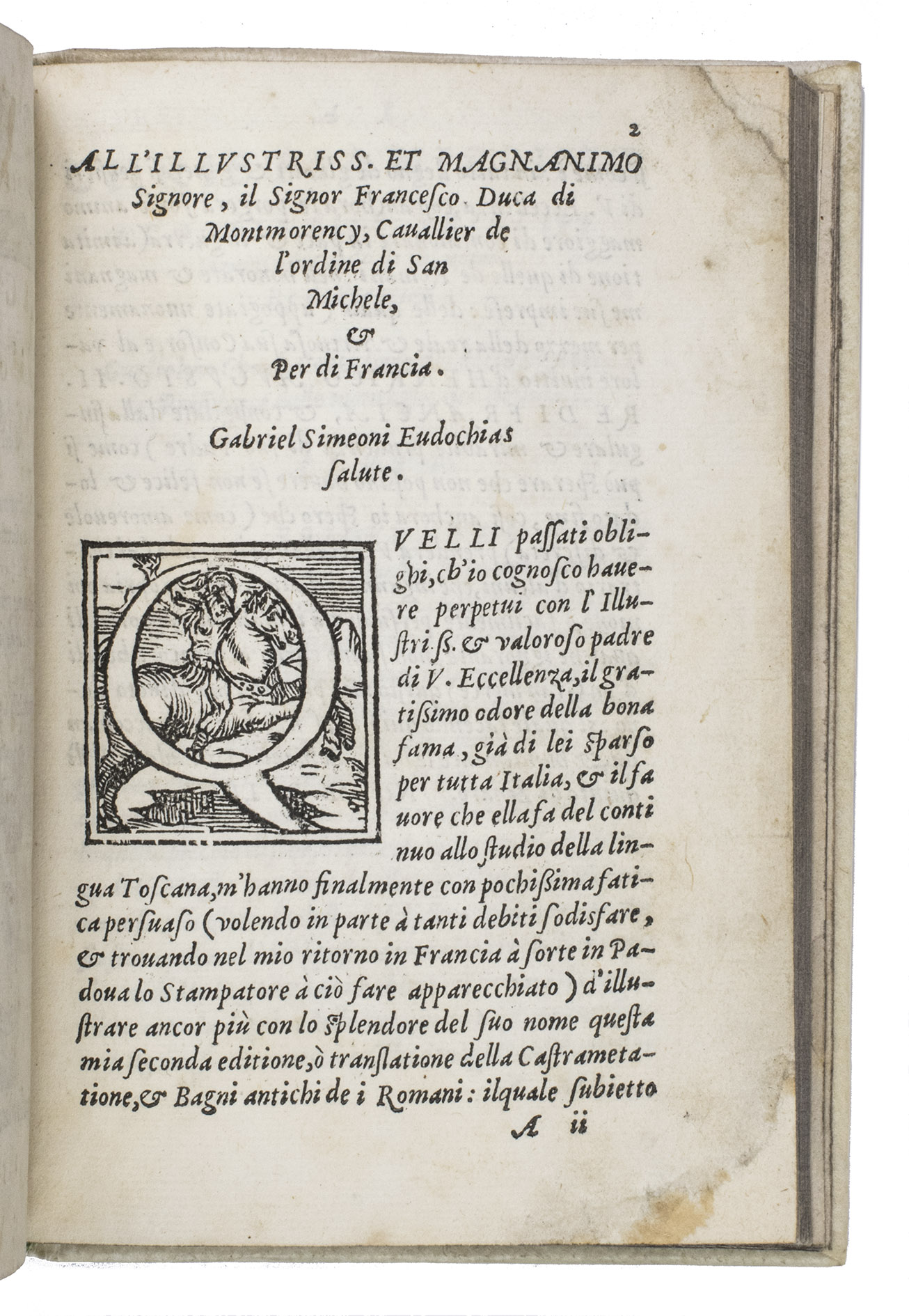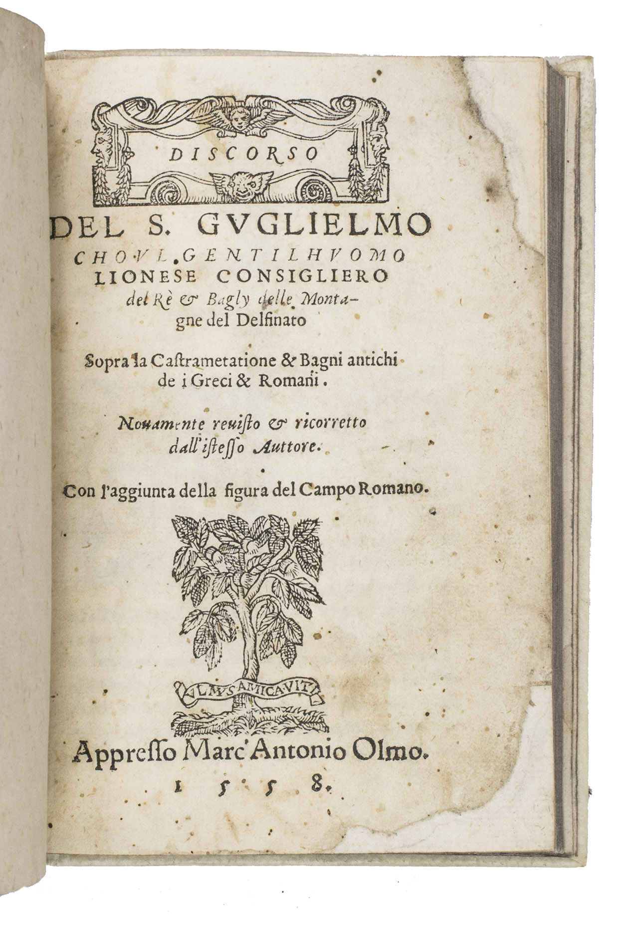 Although there is some confusion in the literature, we can conclude, with the help of the Italian online bibliography EDIT 16, that both parts of this classical work on Roman military practise, establishing military camps and warfare (Discours sur la castrametation et discipline militaire des anciens Romains), as well as the part on Roman baths (Des bains et antiques exercitations grecques et Romaines) were originally published in 1555 in French by the Lyonese publisher Guillaume Rouillé (Rouvill, Rovilius (see: Baudrier, IX, pp. 51-52)). Both works, on Castrametation (on the technique of choosing and arranging fortified encampments (castra) and on military exercises) and on the antique thermae (baths) were based on original research and stayed authoritative till the 18th century.