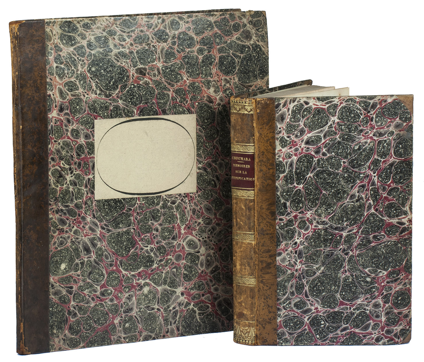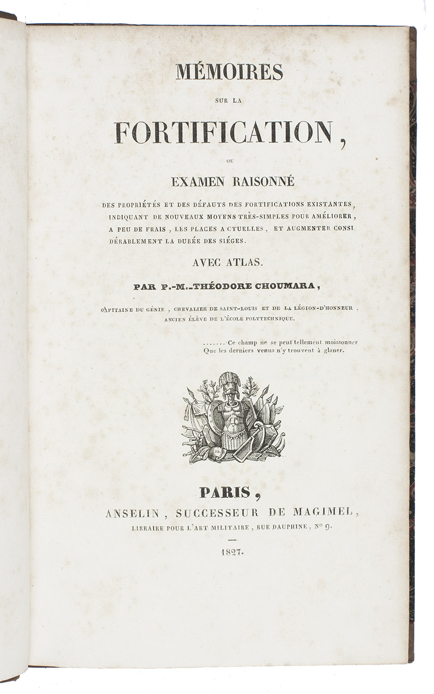 First edition of a work on fortification by the French military engineer Pierre-Marie Théodore Choumara (1787-1870). It examines the characteristics and shortcomings of various French forts, giving suggestions for improvement at low cost. "That which distinguishes Choumara from other writers on the science, is the objection he has to supersede everything by the introduction of a new system; his constant endeavour is to modify the fortresses already extant, in order to increase their power and resistance" (Lendy). Other chapters deal with the attack and defence of an hexagon-shaped fort, the number of soldiers needed to defend a fort and the type of armour required. The atlas volume contains three large folding lithographed plates, showing different types of bastions and an attack plan.