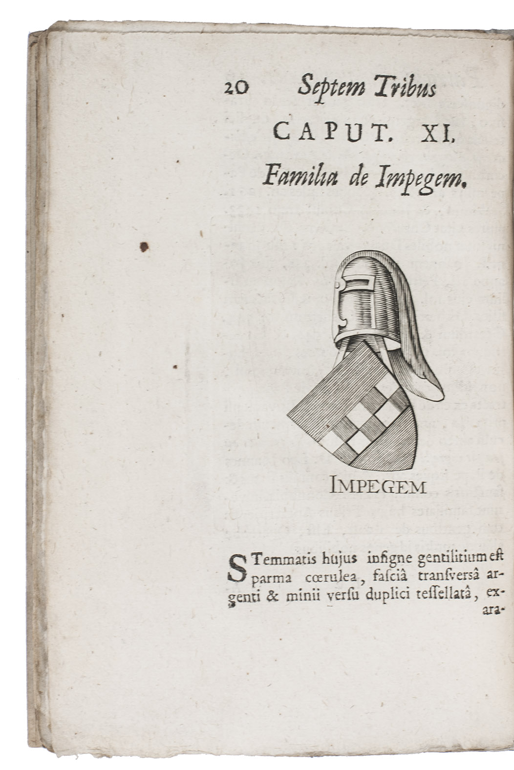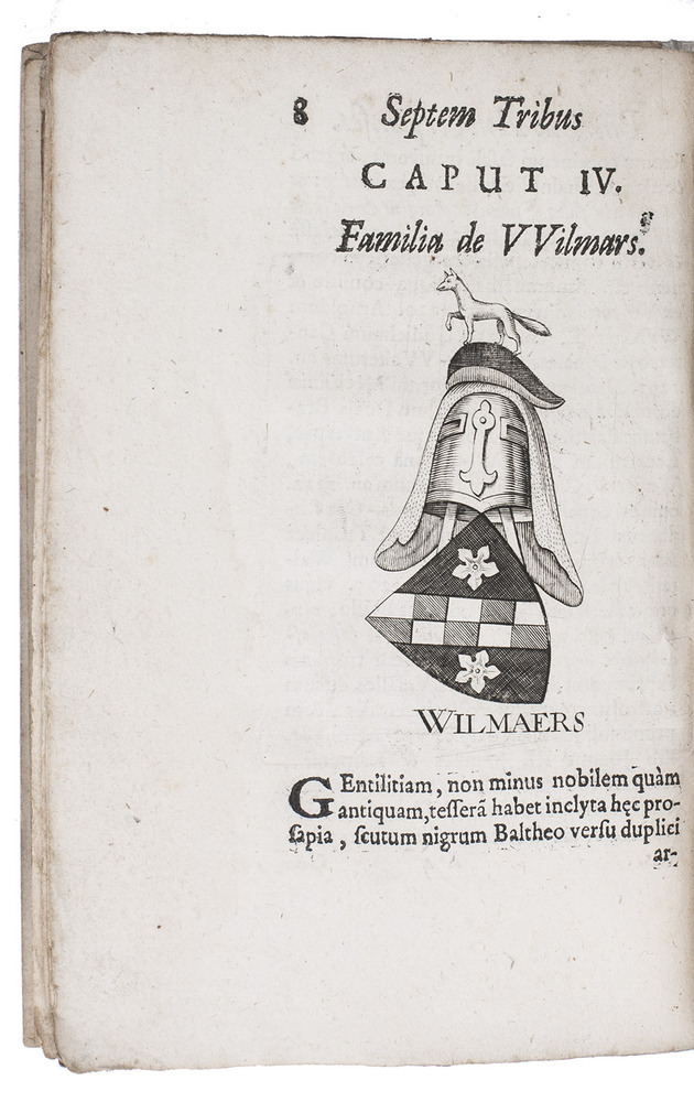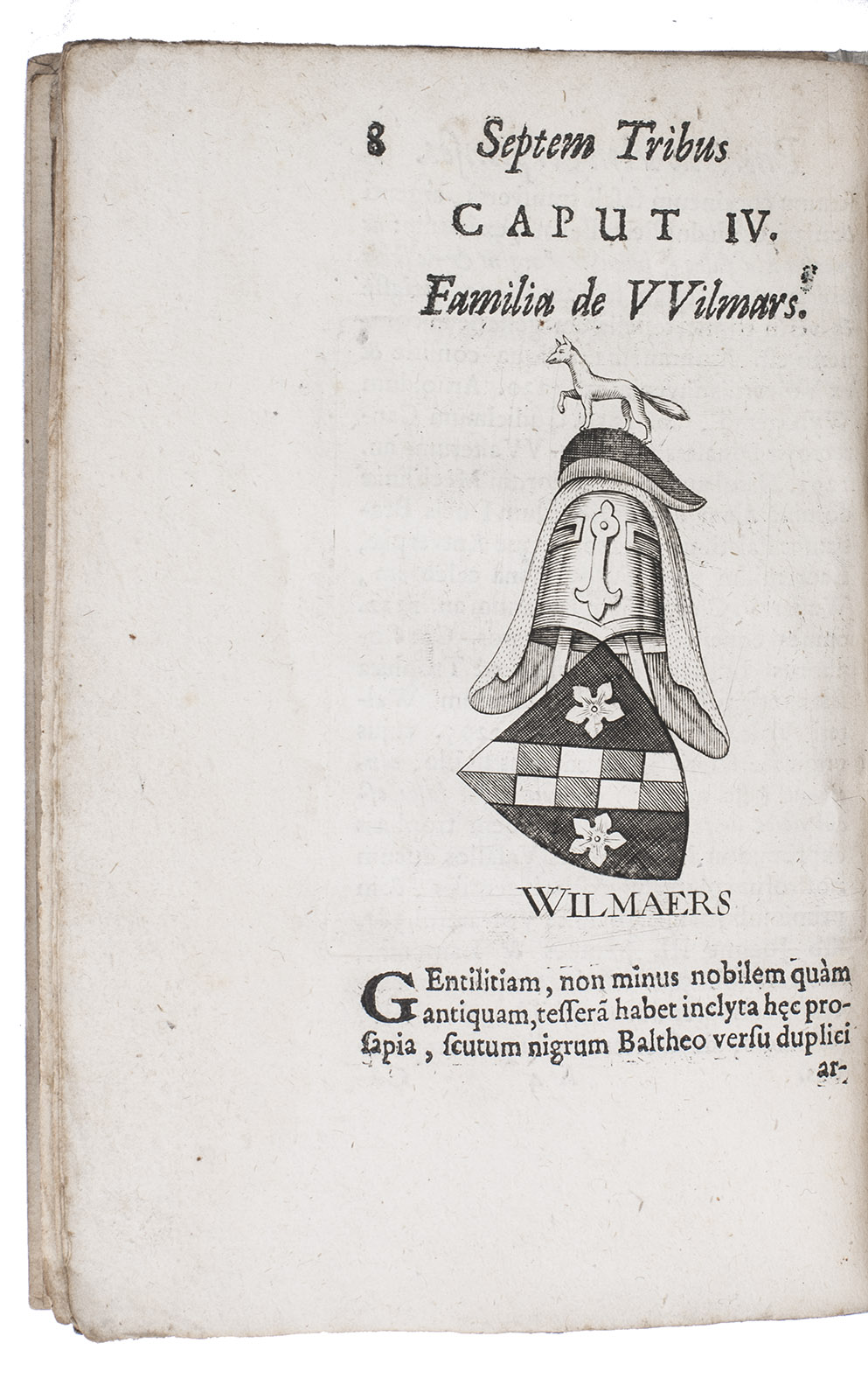 Genealogy of the seven noble houses of Antwerp and chronology of the magistrates of the city. Magistrate offices in Antwerp were traditionally divided between members of the seven patrician families, whose members were supposedly descendants of the companions of the legendary Silvius Brabo. Christyn gives each of these families a short description and genealogy together with an illustration of the family crest. The second part of the book lists the magistrates of the city, with most of the lists starting in the 13th or 14th century.