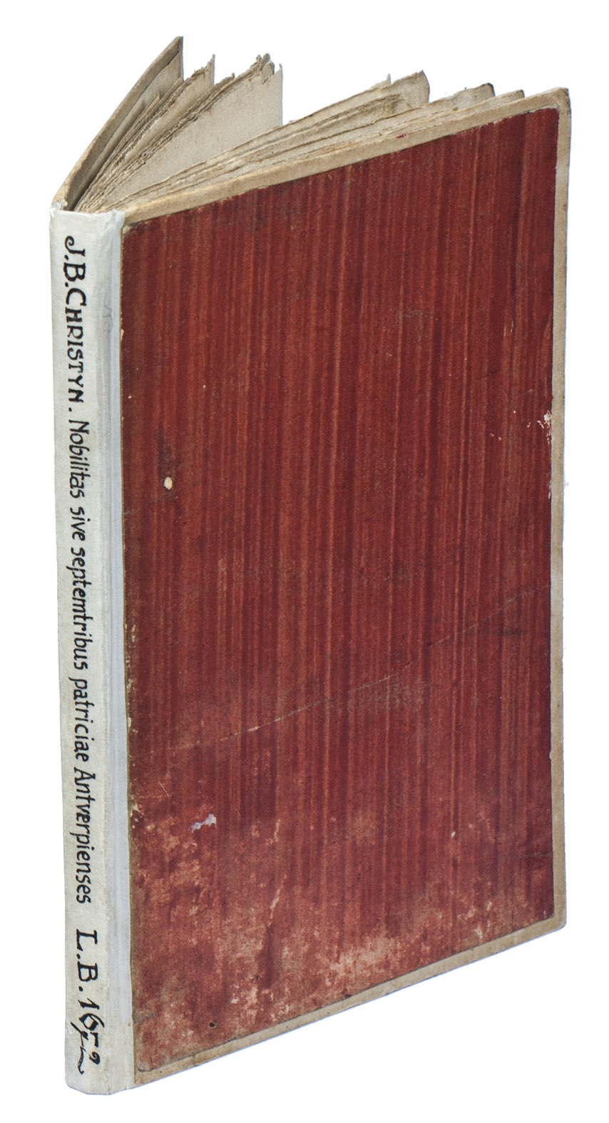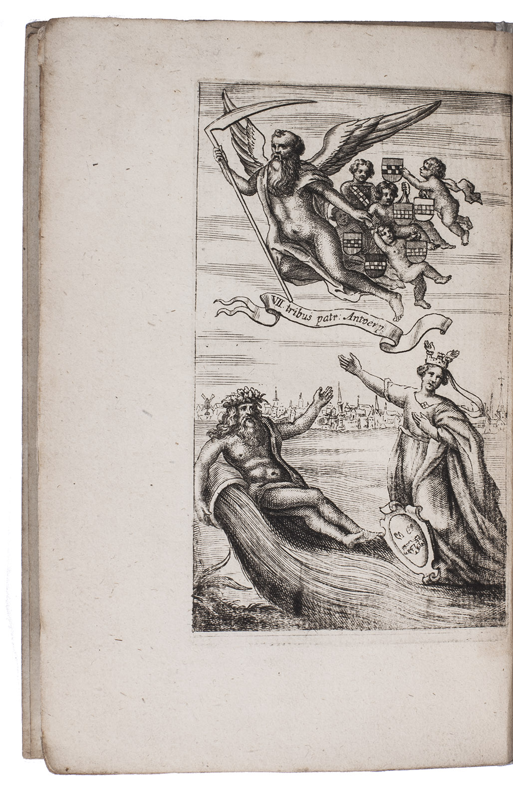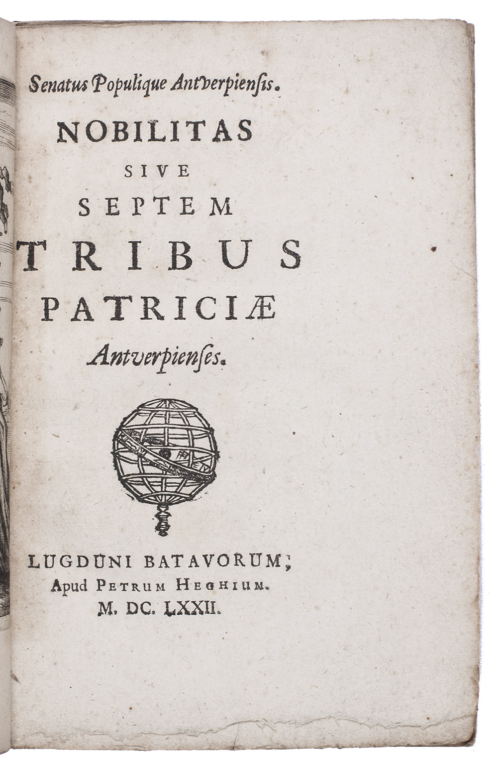 Leiden, Petrus Heghius [printed in Brussels by Philippe Vleugart], 1672. 8vo. With an allegorical frontispiece showing a personification of time accompanying the crests of the seven houses above personifications of the Scheldt and the city of Antwerp and 7 engraved coatsofarms in text. Modern half parchment, red paste paper sides. [10], 55 pp.