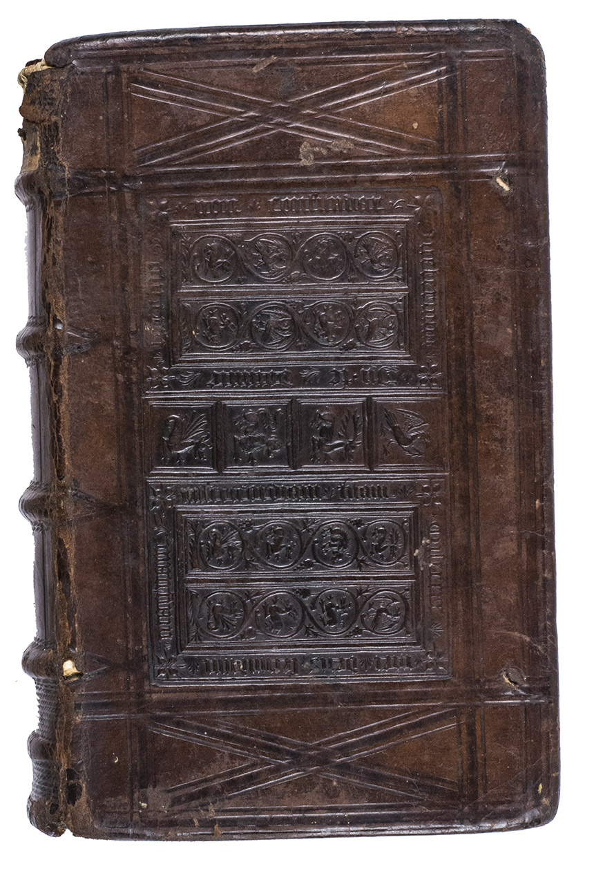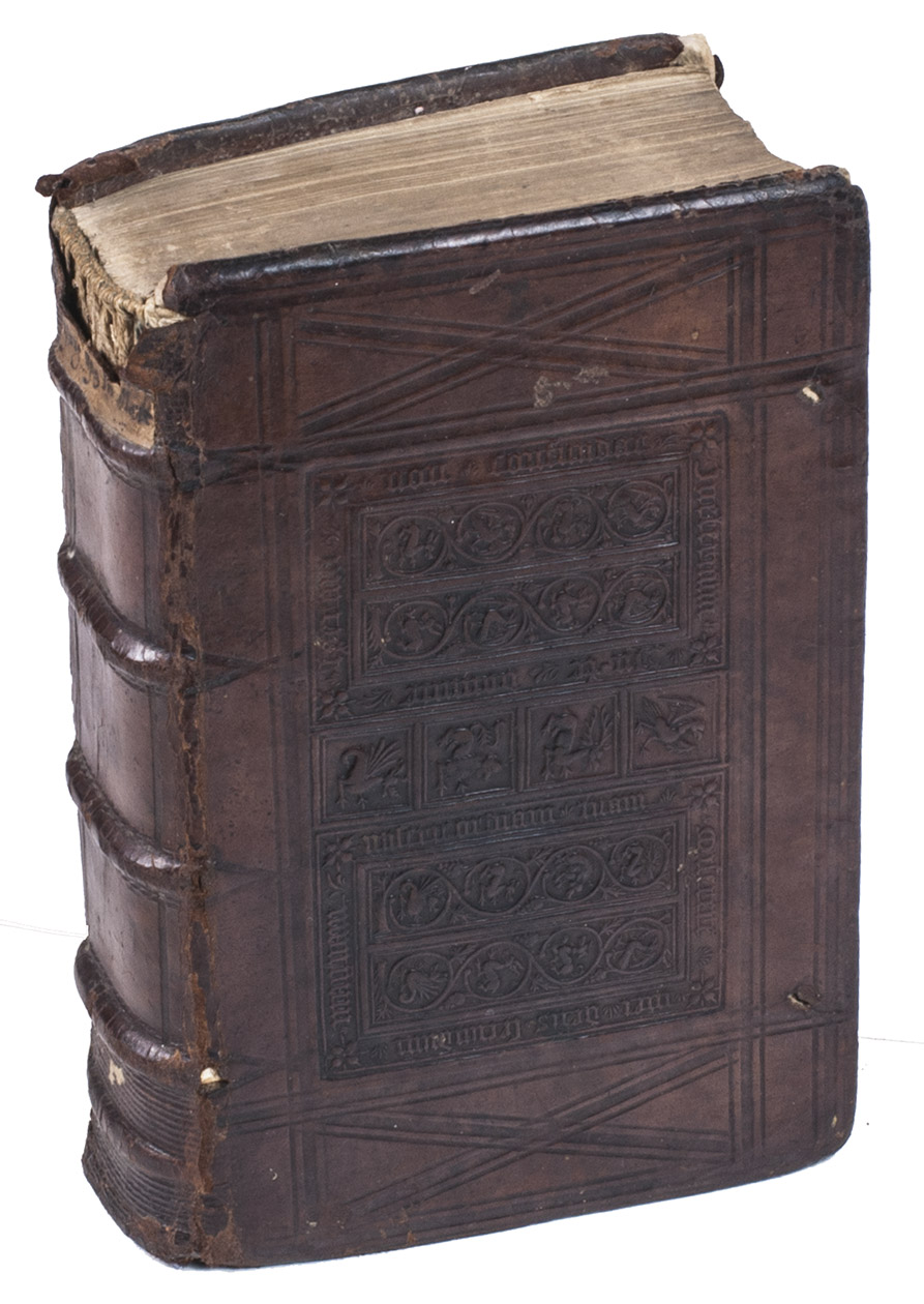 With a manuscript owner's inscription on the recto of first flyleaf, one on the verso of the first flyleaf and two on the title page (one crossed out). The blind-tooling on the boards is very clear. Some loss of leather, mainly at the head of the spine and the corners of the back board. The pastedowns are missing, showing the boards and the manuscript waste used to reinforce the spine. Small brown stains on the first flyleaf and title page, occasionally slightly browned. Otherwise in good condition. Ad 1: Adams C 1531; Belg. Typ. 1608; STCV 12916258 (3 copies); USTC 408234 (15 copies, only 8 with a known shelfmark); WorldCat 69054696, 312713362, 901134465, 67580012, 69058371 (13 copies); Ad 2: Adams C 1533; Belg. Typ. 6076; STCV 12923552 (1 copy); USTC 408266 (16 copies, only 8 with a known shelfmark); cf. for the author: Baur, Catholic Encyclopedia vol. 8, "St. John Chrysostom"; for the binding: Fogelmark, Flemish and related panel-stamped bindings, pp. 32-44; Goldschmidt, Gothic & Renaissance bookbindings, p. 216 plate 45.