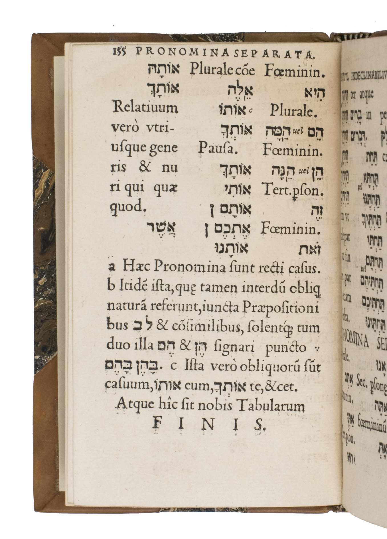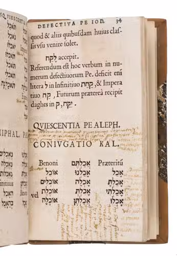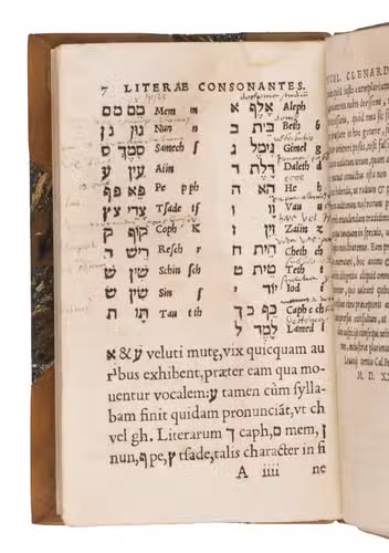 Very rare edition of this early and well-known manual for the Hebrew language. The present copy is the re-issue of the second edition (Wechel, 1533) with only the date on the title page changed. It was originally published in Louvain by Thierry Martens in 1529 and is Clenardus' first published work. The manual is "much praised for its succinct and clear rules" (Smitskamp). It would become one of the most popular Hebrew grammars of the 16th century, and more than 20 editions and reprints had appeared by the time of Franciscus Raphelengius 1589 Leiden edition.