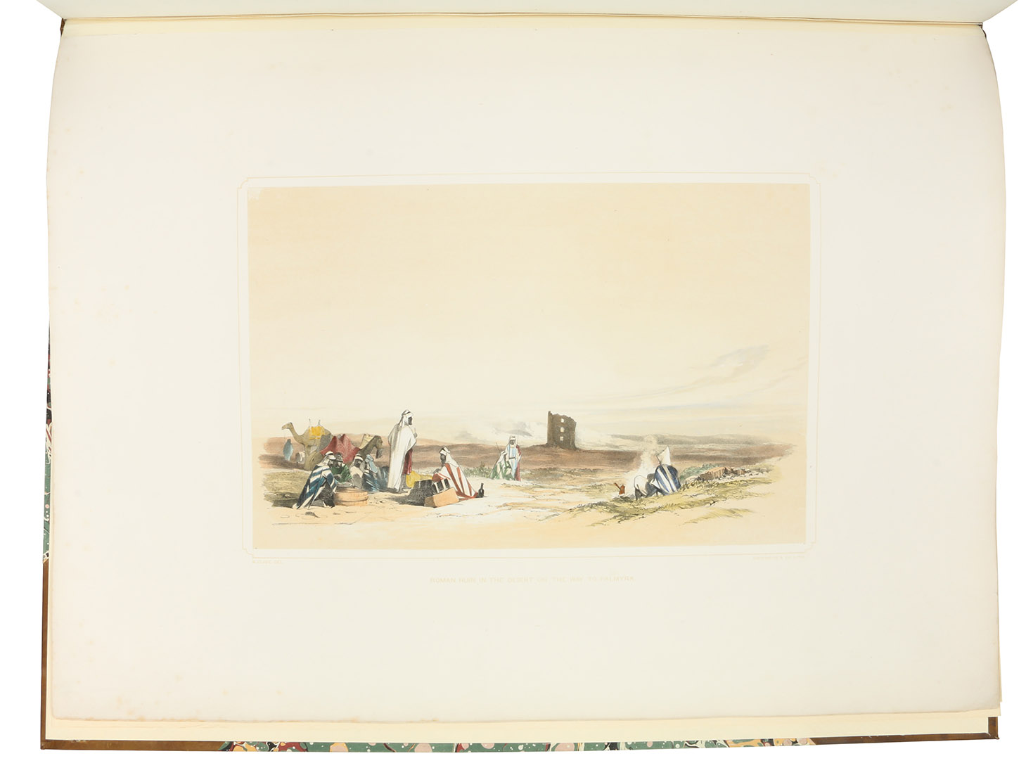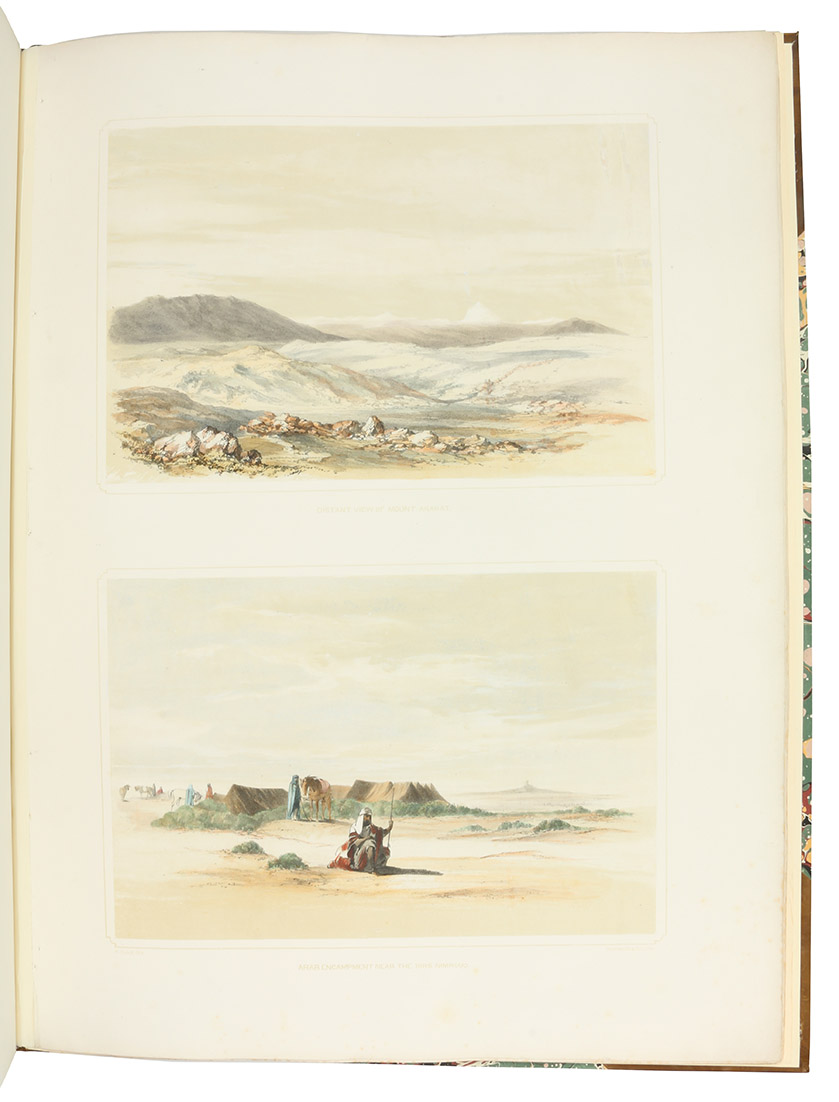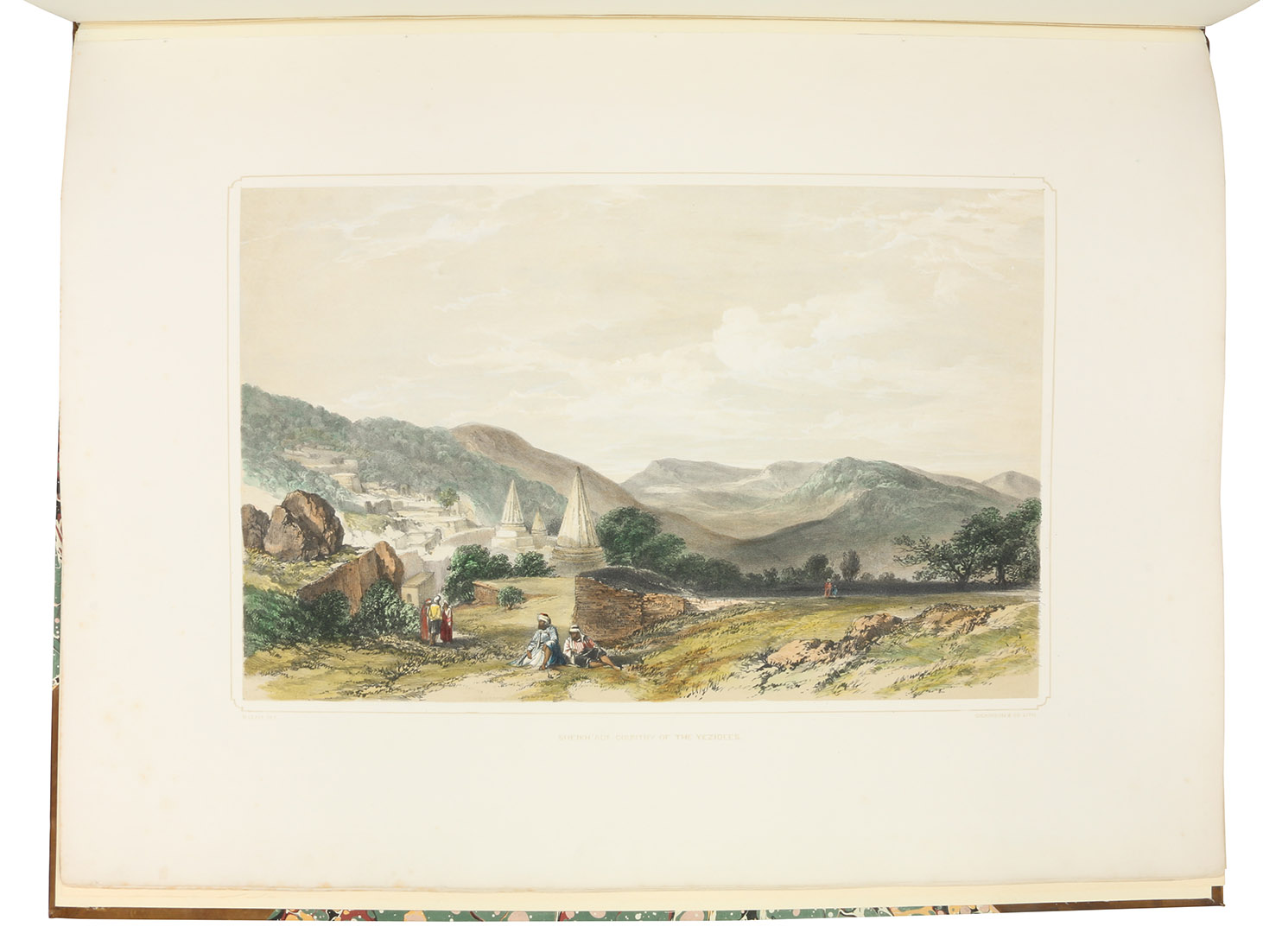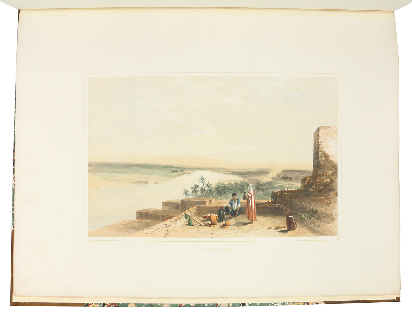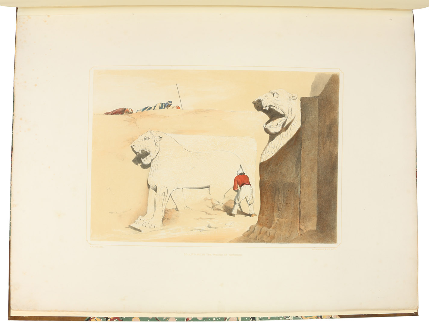 First edition of a rare lithographic plates book of Mesopotamian antiquities and views. The first instalment of a total of three, containing nine lithographs: 1. Sculptures at Nimroud-Lions; 2. Moosul; 3. Hît; 4. Distant view of Mount Ararat; 5. Arab encampment near the Birs Nimroud (on one sheet ); 6. Sheikh Adi; 7. Baghdad; 8. Roman ruin on the way to Palmyra; 9. Sculptures in the Mount at Nimroud. The Victoria and Albert Museum ascribes this work to the artist Robert Charles Clive (1827-1902).