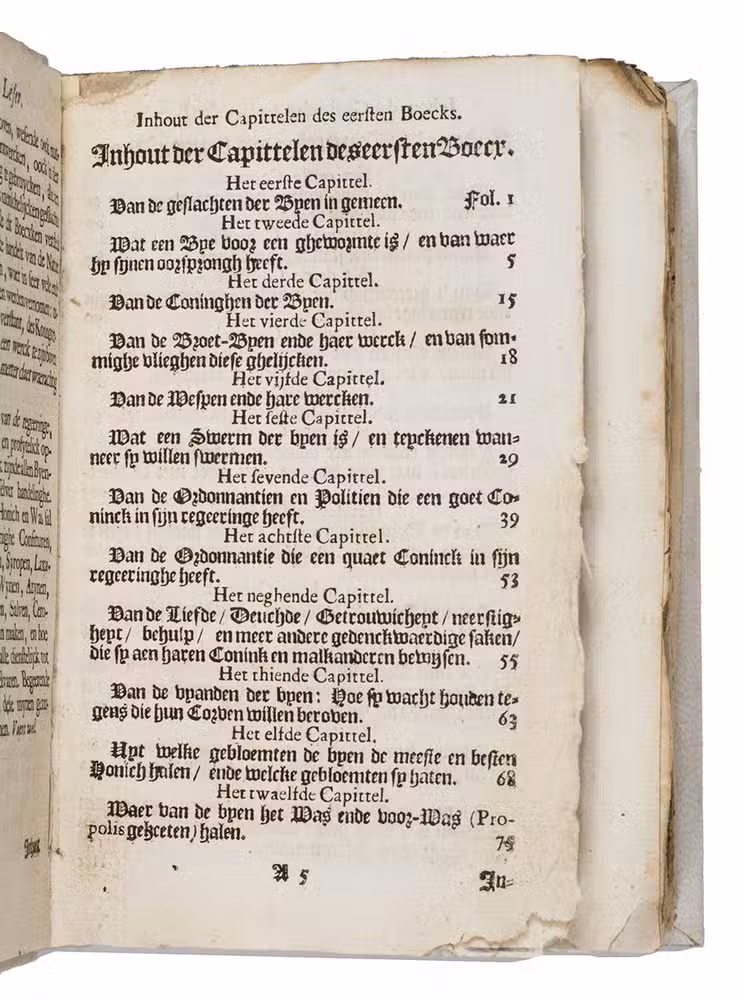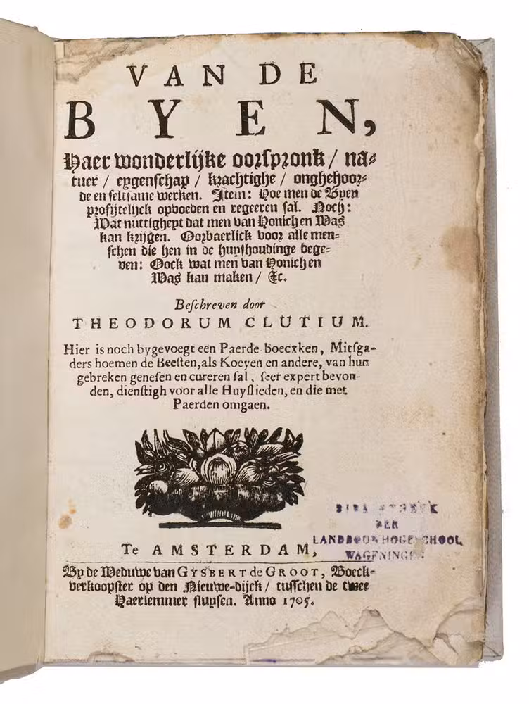 Van de byen, haer wonderlijke oorspronk, natuur, eygenschap ... Item hoe men de byen profijtelijck opvoeden en regeeren sal. Noch: Wat nuttigheyt dat men van honnich en was kan krijgen ...Including: (2) Meesterye voor de paarden, om te weten alle de secreten, alsoo men die gebruyckt by den maerschalk des keysers ende eertz-hertogen keyser Carolus de vijfde. ...