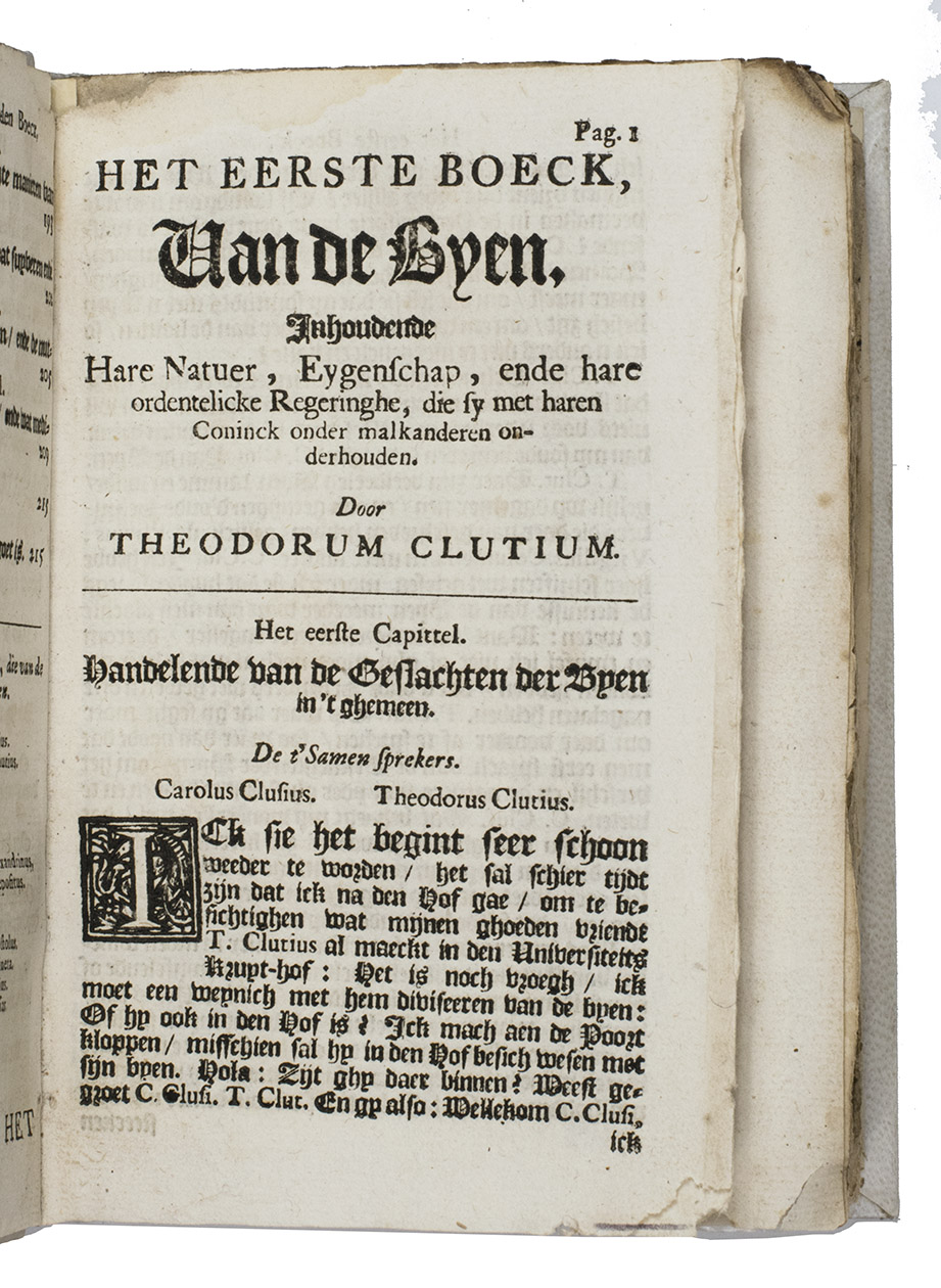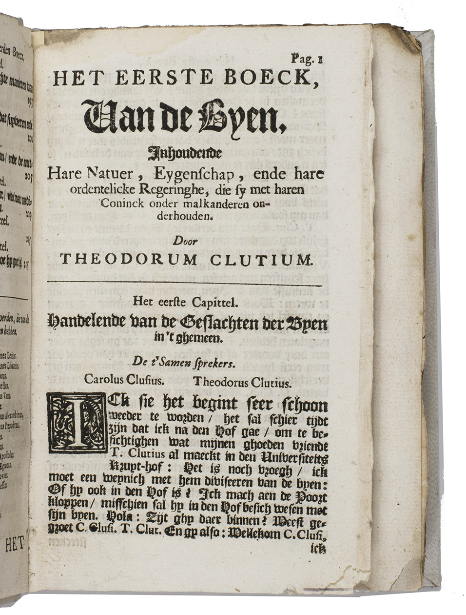 Sixth edition of a treatise, in form of a dialogue between Carolus Clusius and Theodorus Clutius, (based on their correspondence) on bees, beeswax and apiculture, edited by Clutius for the first time in 1597, followed by editions in 1619, 1627, 1648, 1653 and 1705.