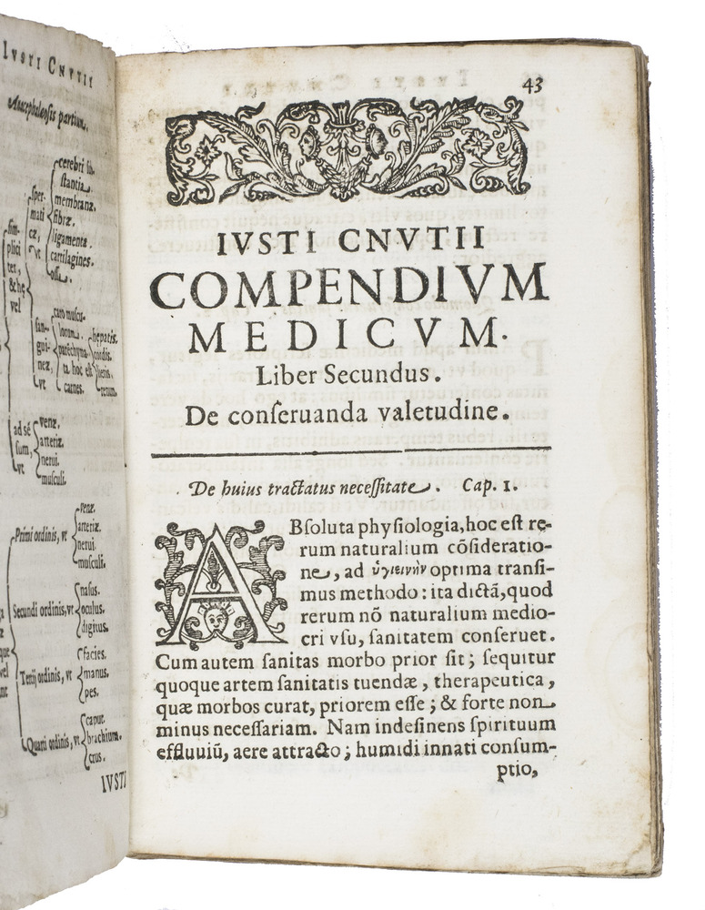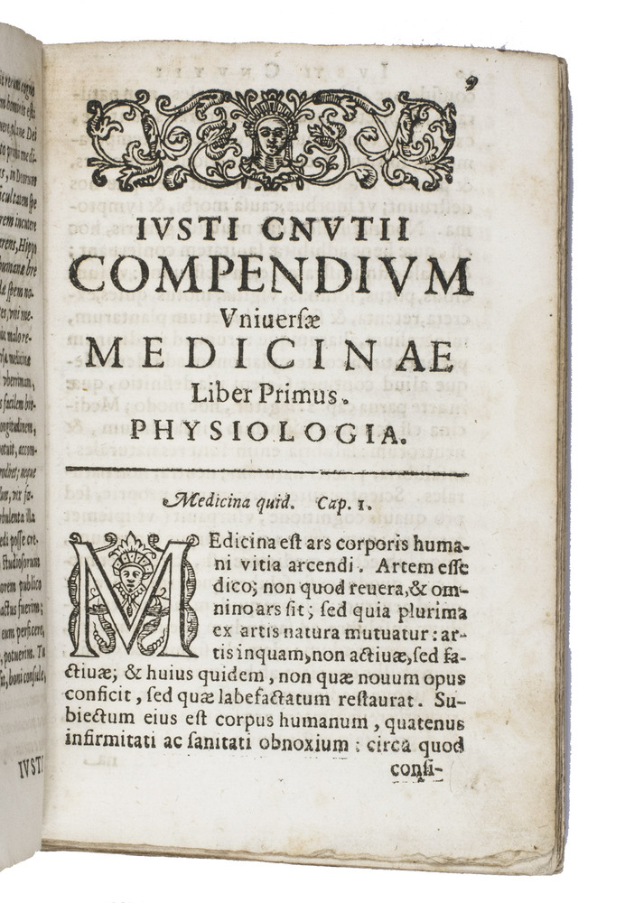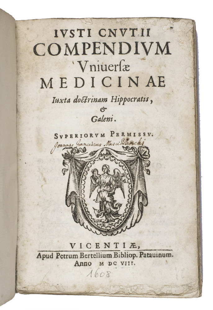 Rare first edition of a medical compendium based on the doctrines of Hippocrates and Galen, written by a Dutch professor at the university of Padua. Hippocrates (ca. 460-370 BCE) is often called the "father of medicine", due to his numerous contributions to the field which are still in use today, like the Hippocratic oath. Together with Galen (ca. 129-216 CE), who developed the theory of the four humours, he is considered the leading doctor of his time. The present work is a compilation of some of their most important texts. It is very rare, as we have not been able to find any other copies in sales records of the past hundred years.