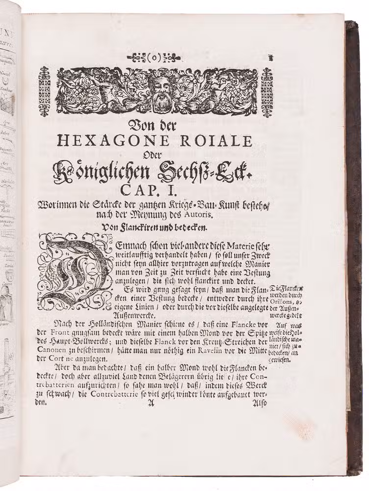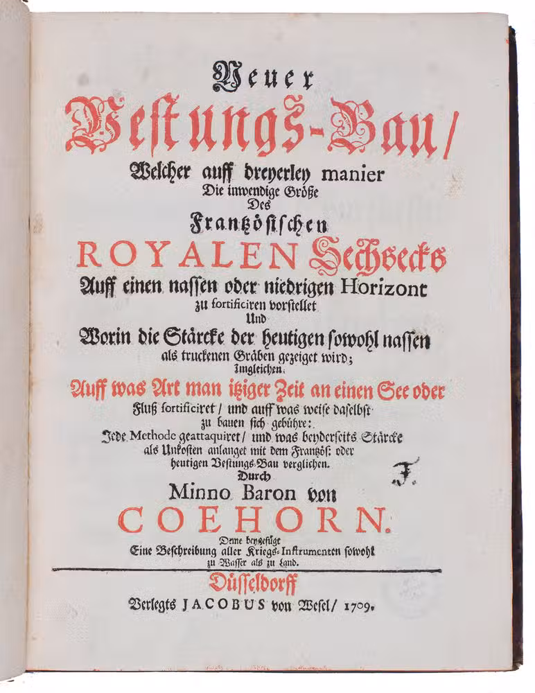 First German edition (second issue) of one of the greatest classics of the art of fortification, by the Inspector General of Dutch fortifications and Master General of the artillery, Menno van Coehoorn. While the Dutch had established themselves as the greatest masters of fortification during the Eighty Years' War for Dutch independence from Spain, the art did not stand still after peace came temporarily in 1648. Although a few Dutch engineers spoke out for reform, the Frenchman Sébastien Le Prestre de Vauban (1633-1707) was to dominate the field with his fortifications, defensive and especially offensive strategies, and publications on the subjects from the 1670s. Van Coehoorn (1641-1704), Vauban's only major rival, took a very different approach, more practical than theoretical, with his great fortification manual in 1685. He deployed troops more actively in the defence of fortifications and tailored his designs and strategies to the particular features of the site. This made them especially important for fortifications and siege warfare in the marshy flat lands of the Low Countries, circumstances less familiar to Vauban.