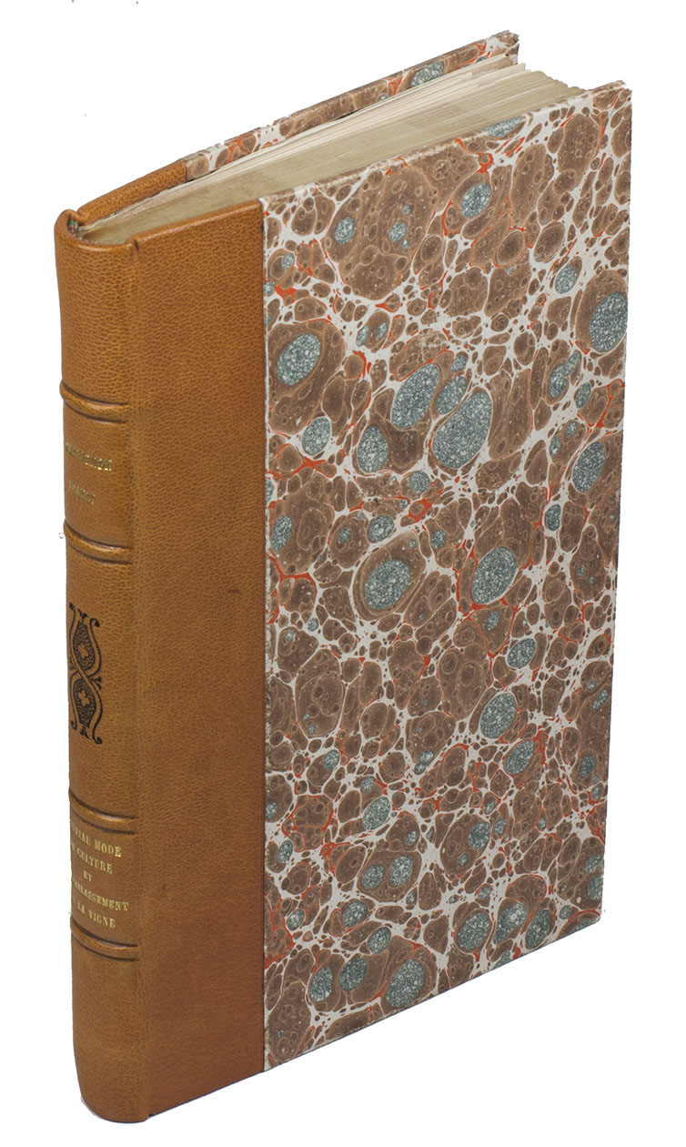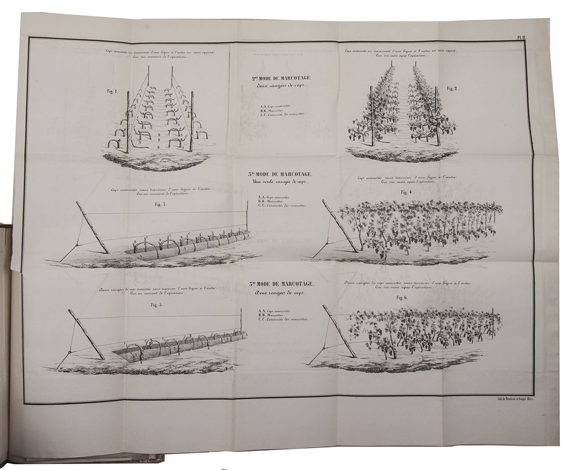 First edition of an excellent treatise on viticulture, presenting a new and economical method of cultivating grapes and producing wine. The first part describes the various grapes cultivated in the Moselle department, as well as methods of cultivation, and introduces a new system of marcotting using iron wire instead of stakes. The subsequent parts are devoted to different steps in the winemaking process, from the picking of grapes to fertilization, with suggestions for improvement. In three tables the author shows the (financial) benefits of his system, and the plates depict his improved method of marcotting. The treatise includes a history of viticulture in the Moselle départment (Lorraine, France).
