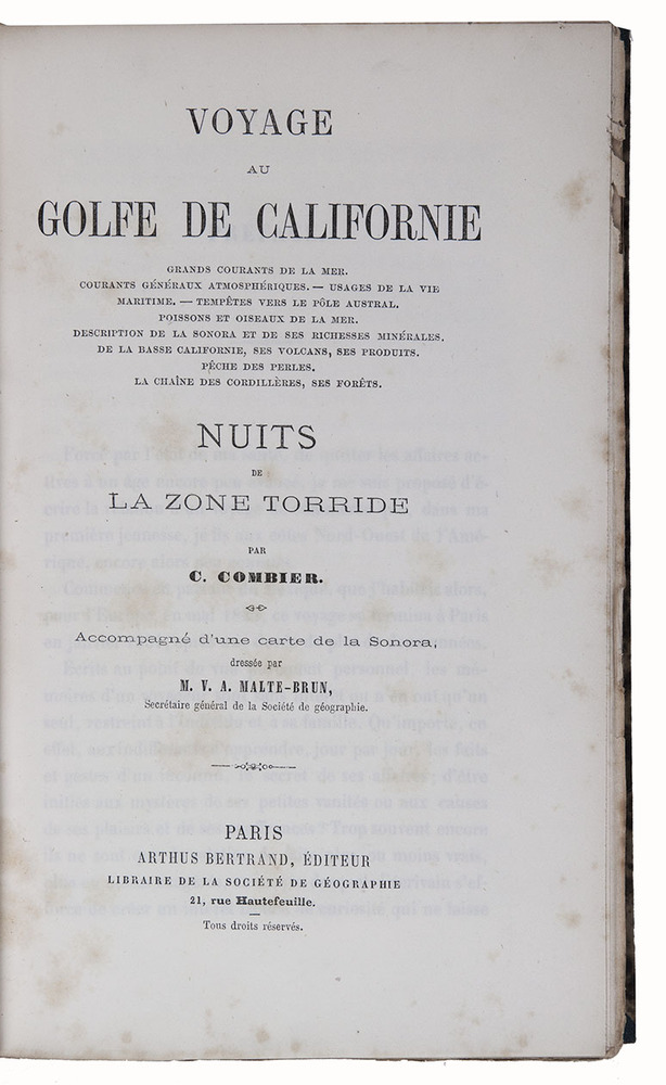 First edition. The author collected the material for this narrative during his business ventures in the New World. Sailing in the privately owned Félicie between the Mexican ports Guaymas, Acapulco, Mazatlan and Veracruz he visited Valparaiso, Chile, the La Paz-Loreto area and the Bay of California. The account is rich in detail about the products, geography, and geology of Sonora. The map was drawn by Victor Adolph Malte-Brun, an acclaimed French cartographer and geographer, and apparently also published in the journal Nouvelles annales des voyages (May, 1863).