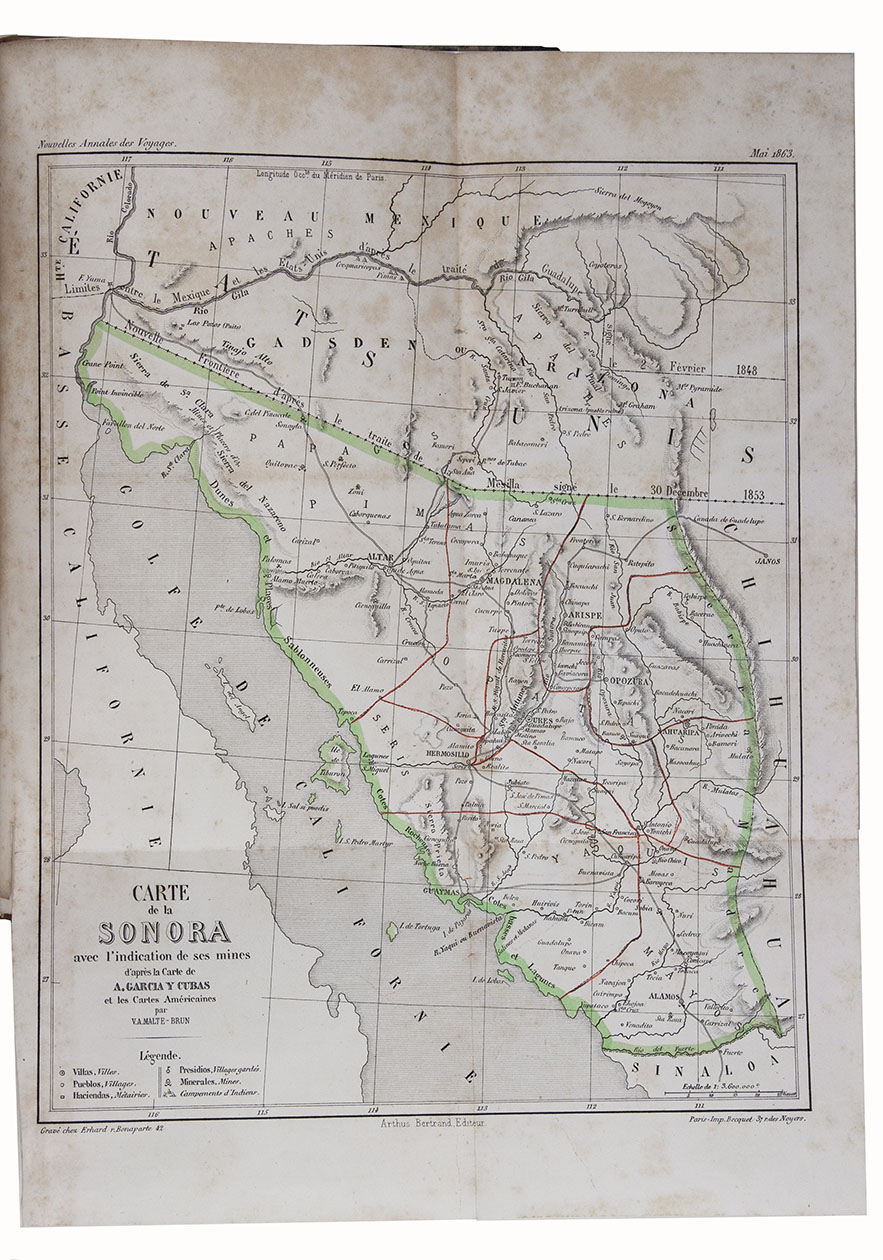 Paris, Arthus Bertrand, [1864]. 8vo. With folding map of Sonora by Malte-Brun, hand-coloured in outline. Modern half calf. XVI, 544 pp.