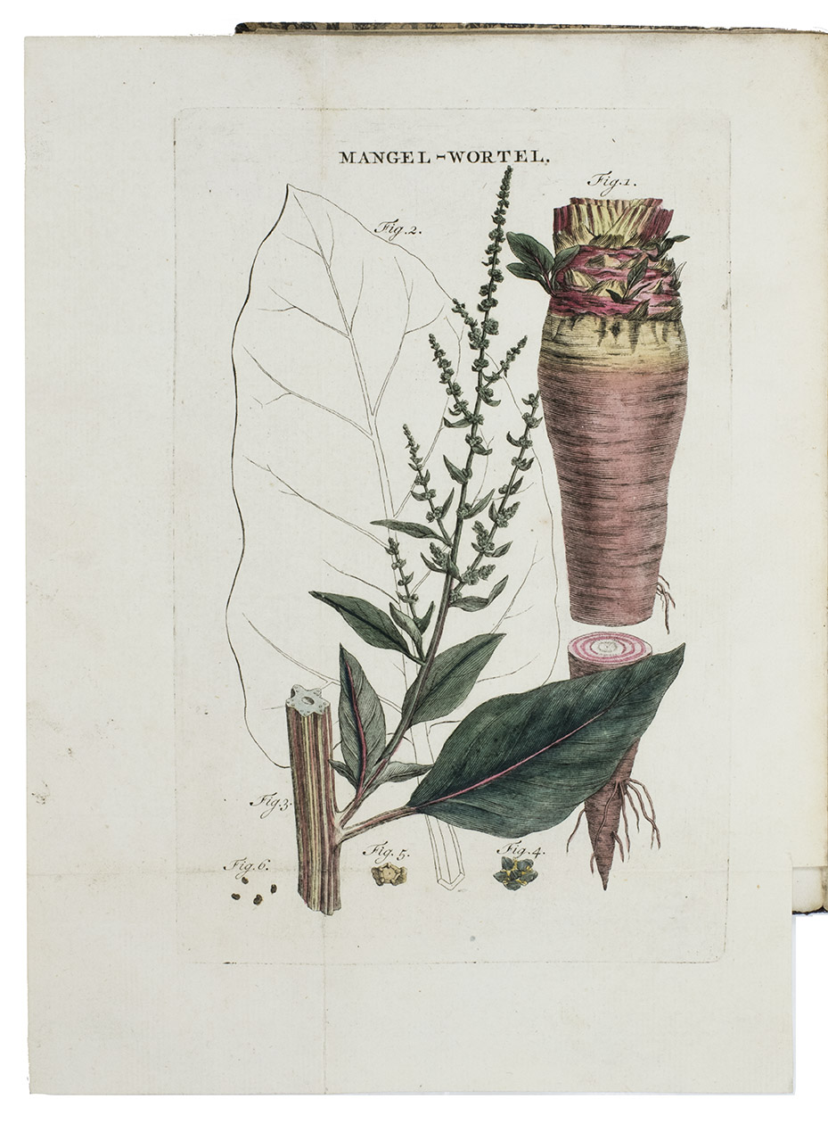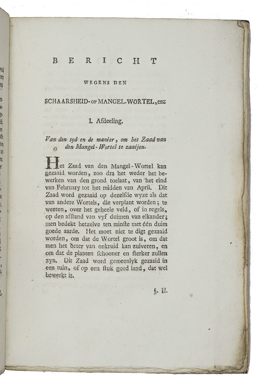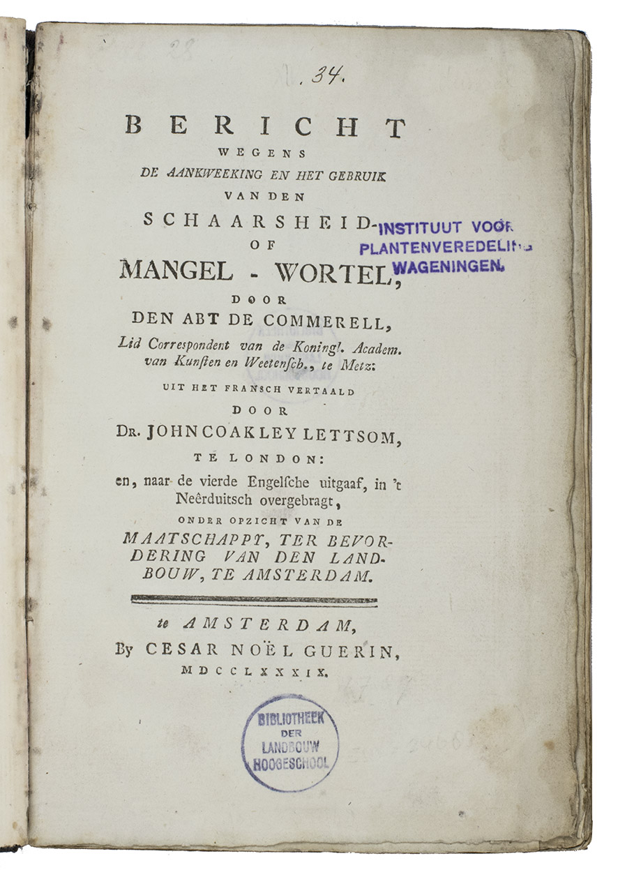 First edition of the Dutch translation of Instruction sur la culture, l'usage, et les avantages de la betterave champêtre ... by Abbé de Commerell (Paris, 1786), after the 4th edition of the English translation by John Coakley Lettsom. Translated into Dutch by Jan Christiaan Sepp. The mangel beet, a cultivar of the common beet Beta vulgaris, is now grown primarily as cattle fodder, but was formerly eaten by people and used to make a fermented drink.