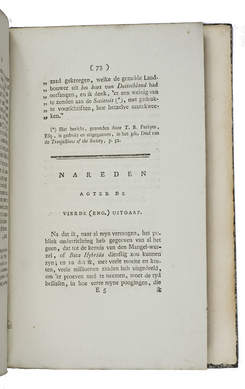 With a new 8-page preface by the secretary of the Amsterdam Maatschappij ter Bevordering van den Landbouw, with the live signature of the secretary, H. Calkoen, in brown ink. In very good condition and largely untrimmed, preserving most deckles and point holes. STCN (2 copies).