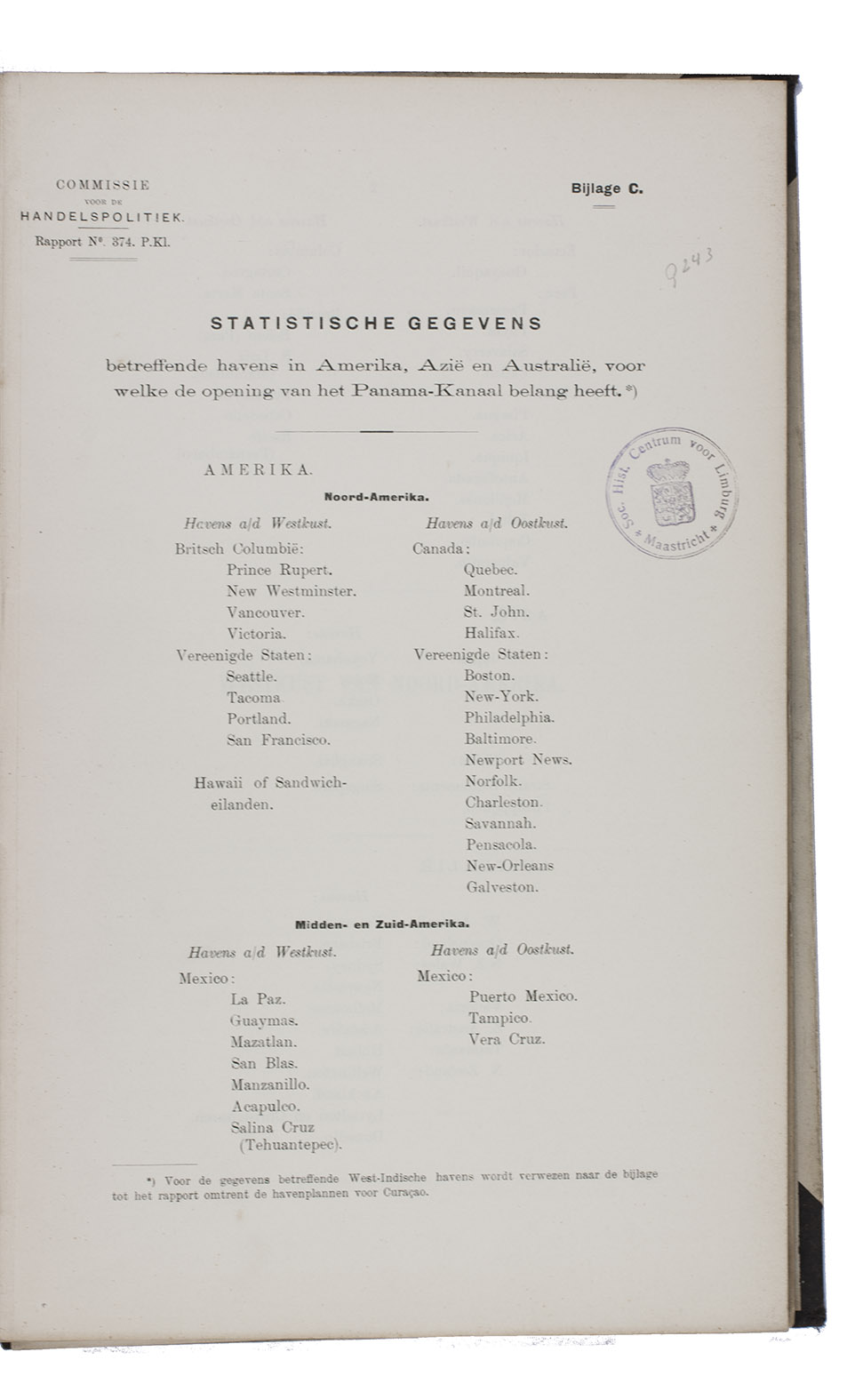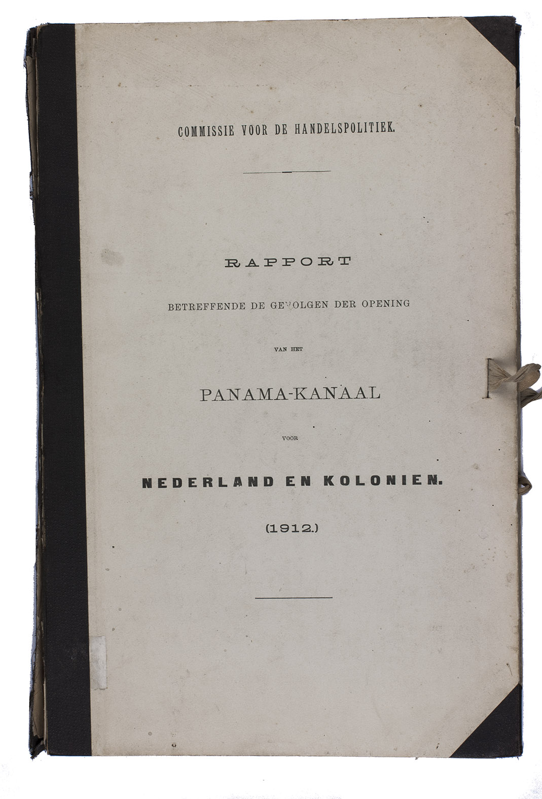 First edition of an investigation of the effects and consequences of the Panama canal on the Dutch overseas trade, compiled by a committee appointed by the Dutch minister of Water Affairs. It consists of a introduction, a list of appendixes, seven appendixes (lettered A-G), all loosely inserted in the portfolio, containing a list of publications on the Panama canal, a list of ports in America, Asia and Australia whose travel time are affected by the canal, the influence of the canal on the South American trade, and more.
