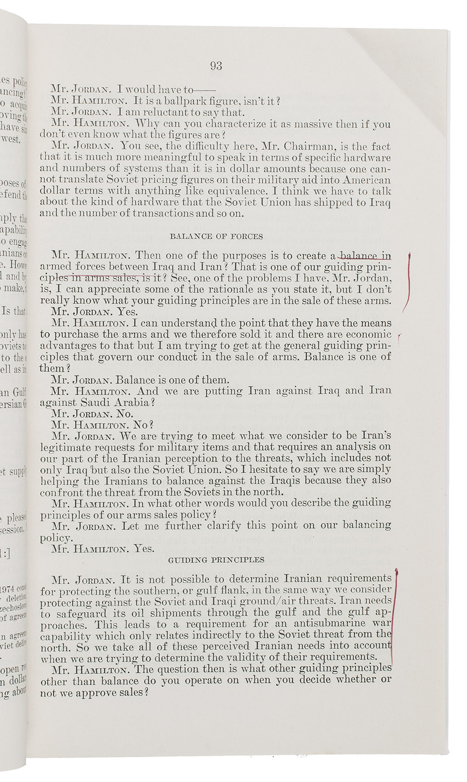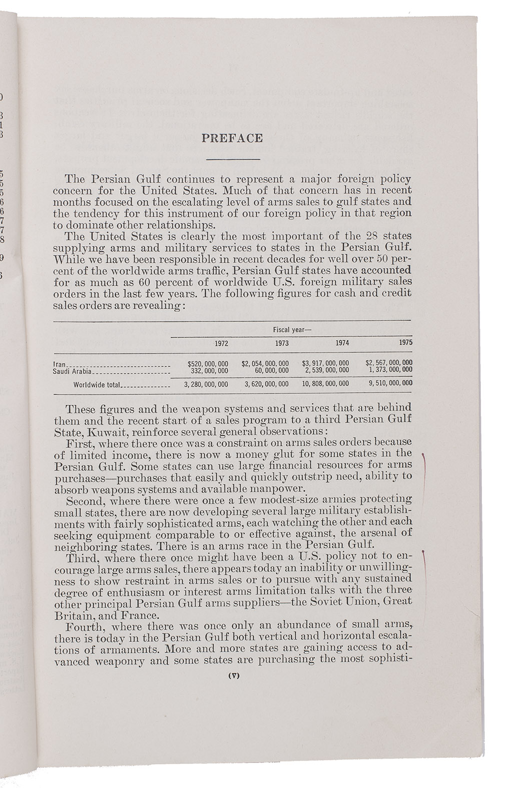 Document printed by the government of the United States of America, concerning "the escalating level of arms sales to Gulf states" (p. V). Included are statements of witnesses, memorandums, tables and other important documents concerning the (illegal) arms trade.