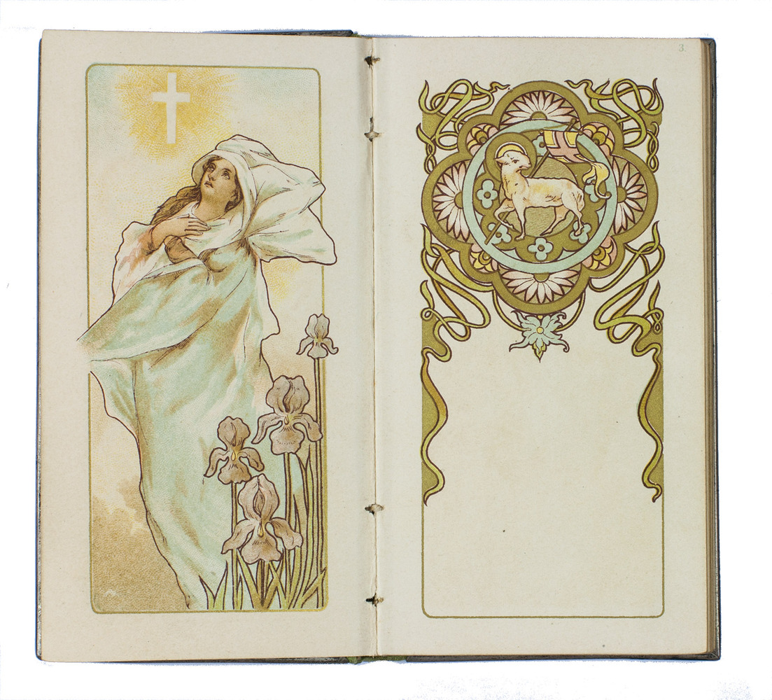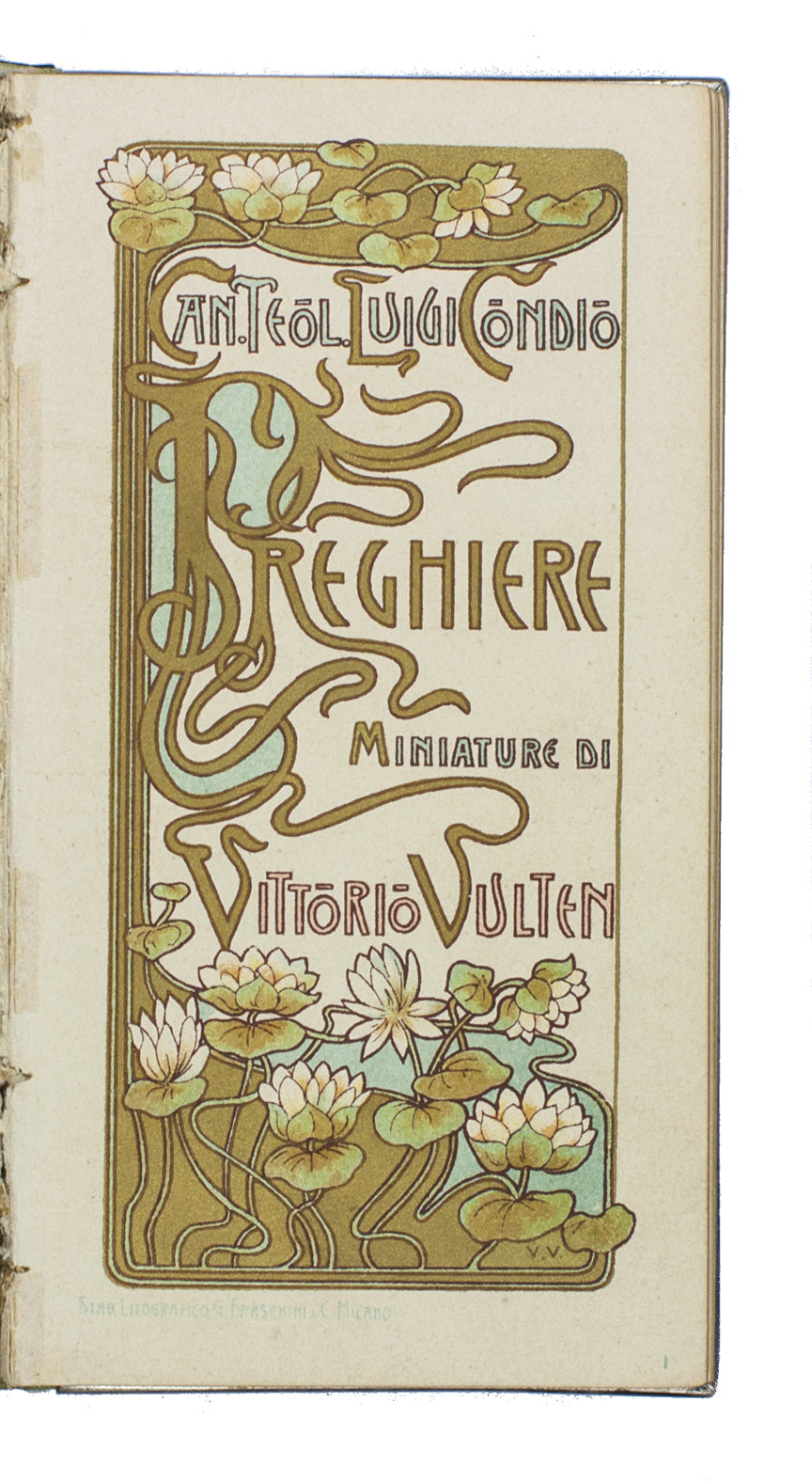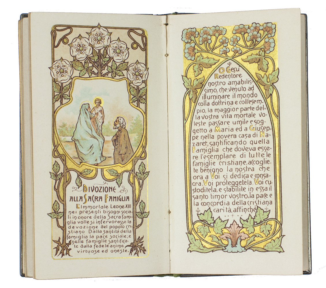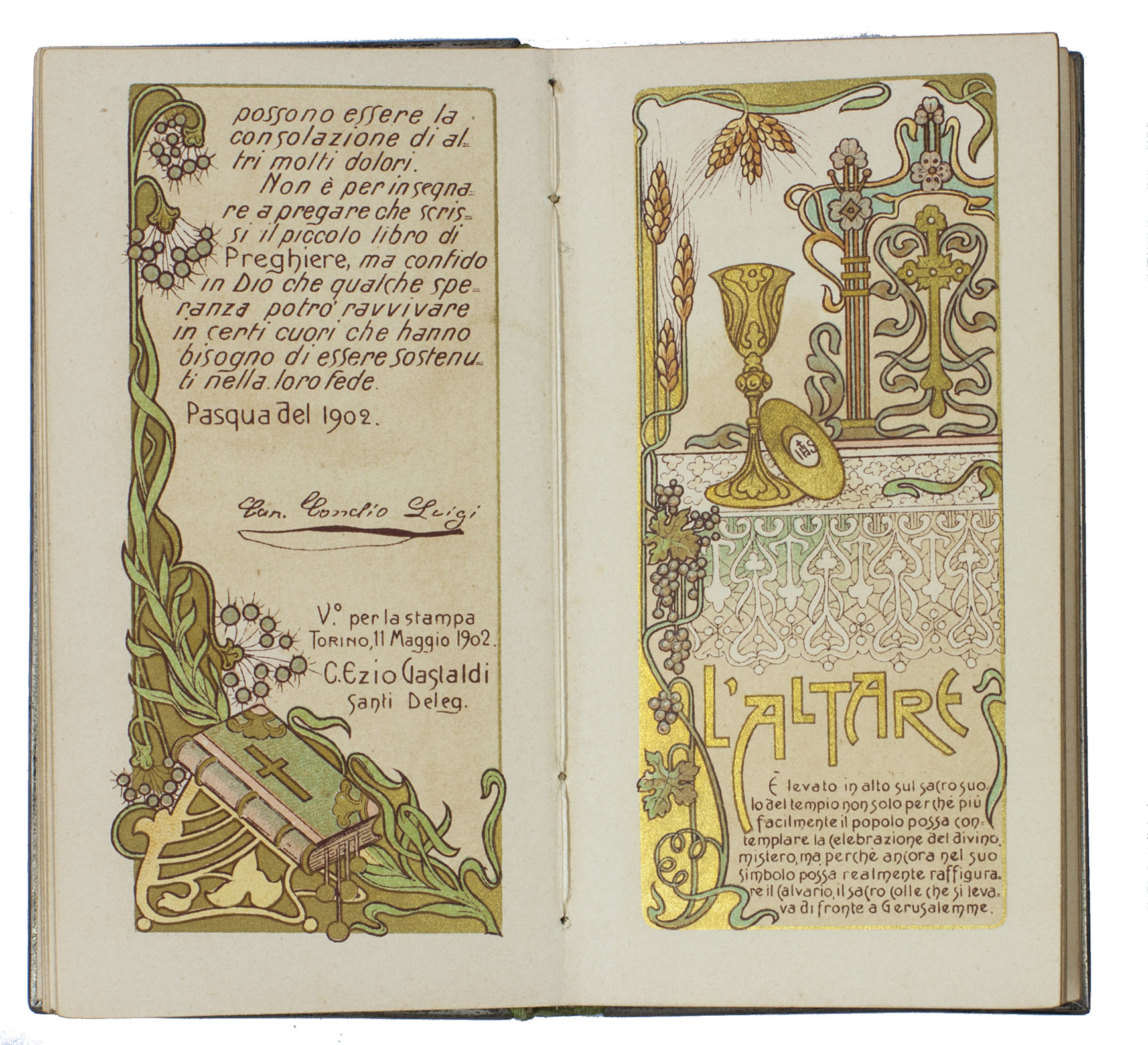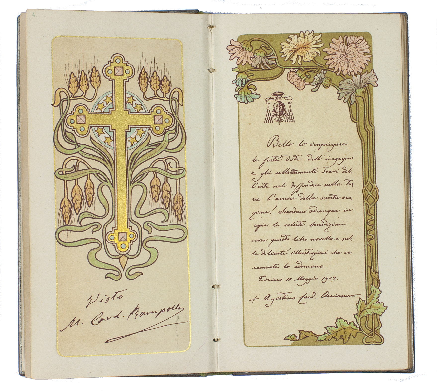 A lovely, wholly chromolithographed Catholic prayer book in Art Nouveaux style and in a high relief hallmarked silver binding. The text was written by Luigi Condio, a church canon in Torino and author of several editions of Manuale di preghiere. The illustrations and decorations were drawn by the Torino miniaturist and calligrapher Vittorio Vulten, who no doubt calligraphed the text as well. Condio's preface is dated from Torino, 11 May 1902, and the book was almost certainly published that year. Some preliminary pages are signed in the plates by two Cardinals: Mariano Rampollo (1843-1913) in Rome, whose expected election as Pope in the following year was vetoed by the Austrian Emperor; and Agostino [Richelmy] (1850-1923) of Torino.