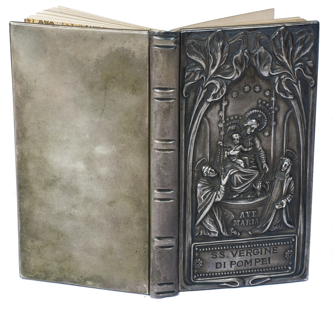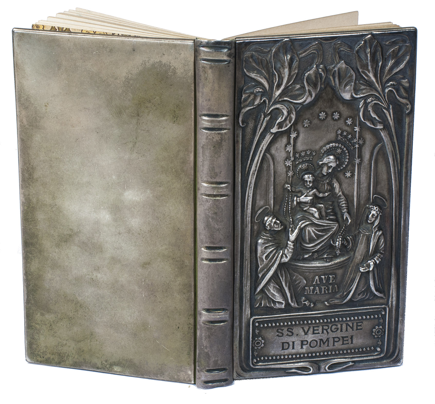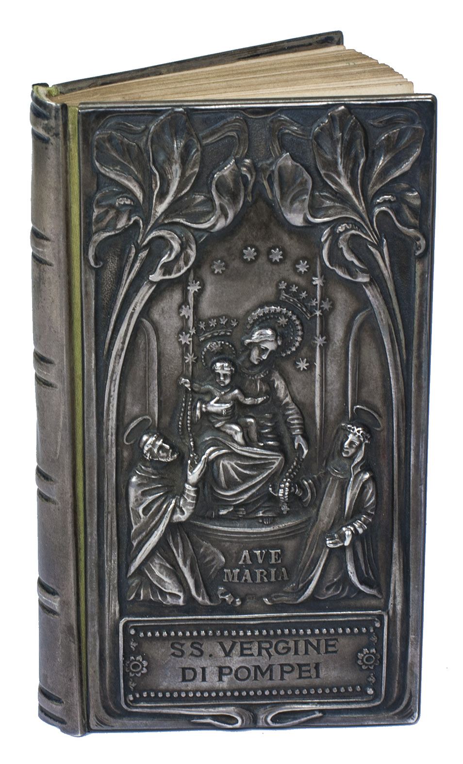 Torino, Carlo de Martini (printed by Stab. Litografico Giovanni Fraschini & C., Milan), 1902. 18mo (13.5 x 7.5 x 1.5 cm). A wholly chromolithographed Art Nouveau prayer book, printed in numerous pastel colours plus gold, with (mostly floral) decoration on every page and numerous additional illustrations. In a silver binding (hallmarked "800" at the foot of the otherwise blank back cover), with "Our Lady of the Rosary" from the shrine of the Virgin of the Rosary in Pompei depicted on the front cover in high relief (madonna and child presenting rosaries to Saint Dominic and Saint Catherine) flanked by two irises, above "Ave Maria" and a panel with "SS. Vergine di Pompei", endpapers lithographed in pastel colours plus gold, in a repeating pattern of abstracted flowers, crosses, anchors, hearts and initials "VD" or "DV", gilt edges. [104] pp.