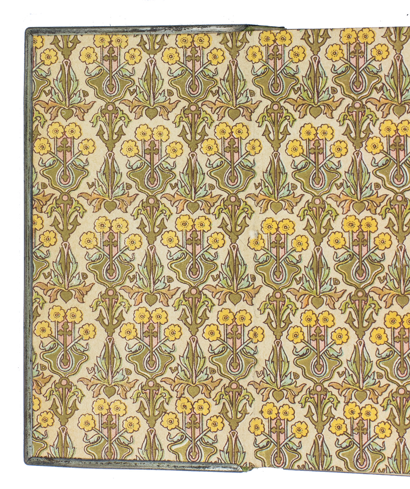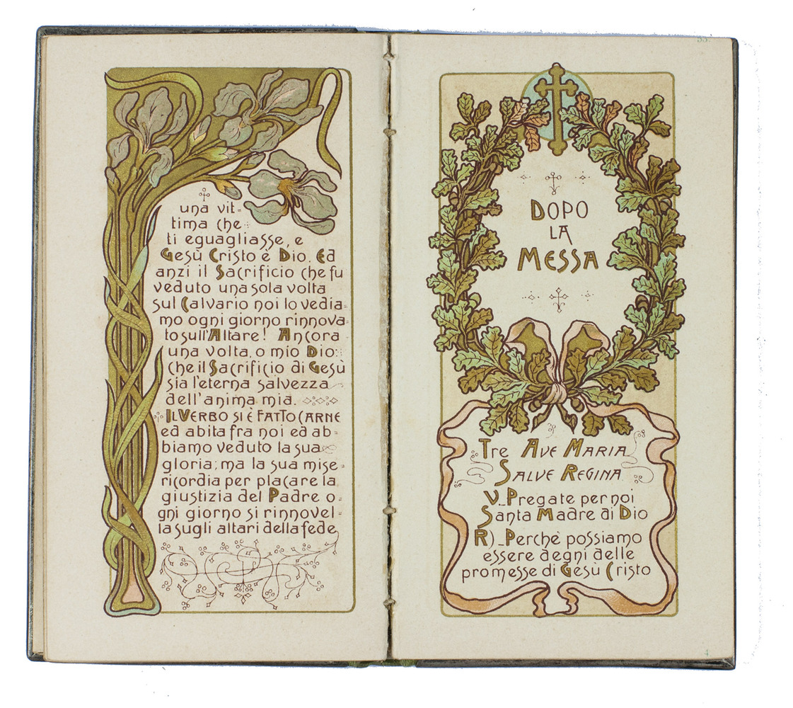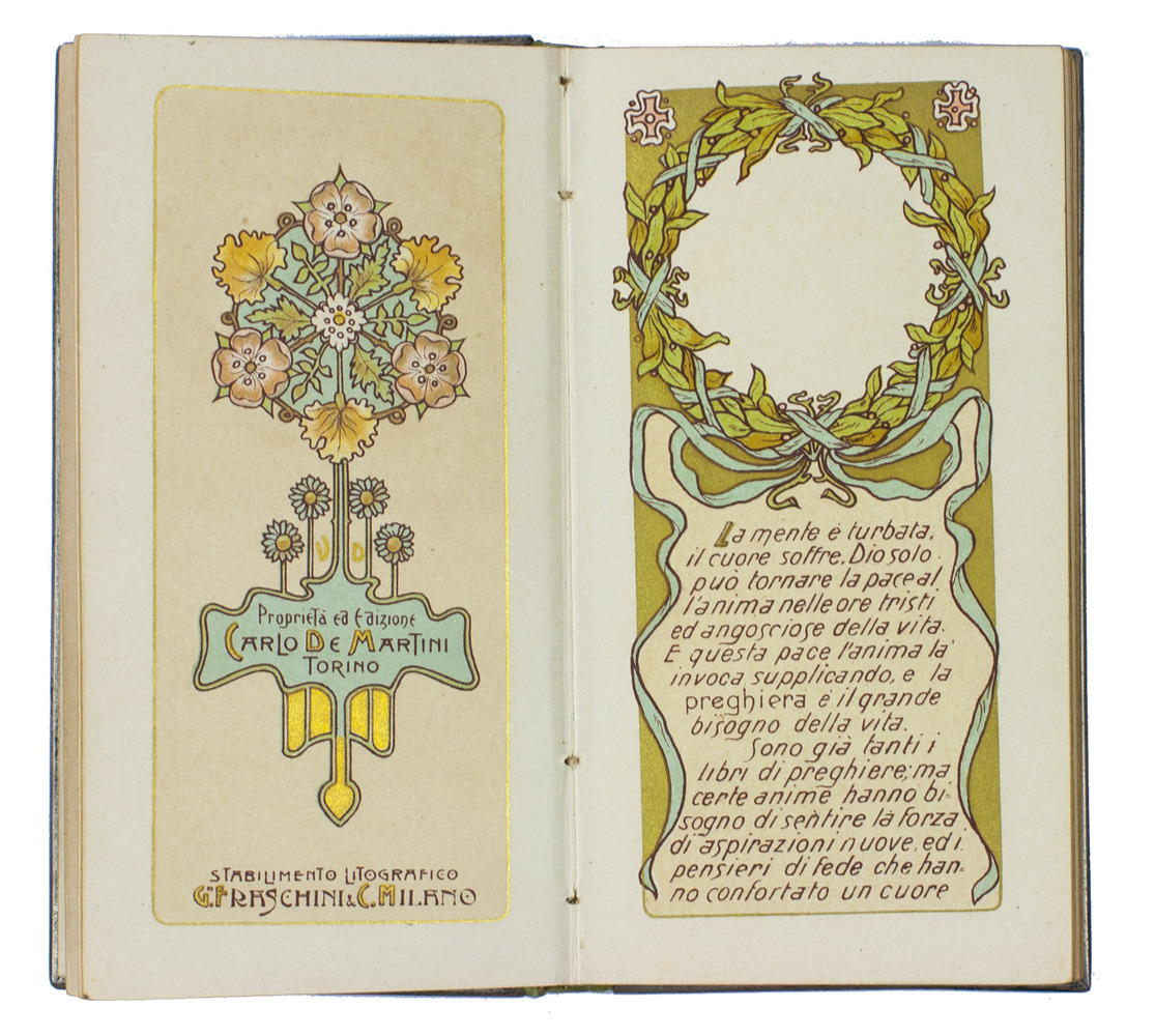 Torino, Carlo de Martini (printed by Stab. Litografico Giovanni Fraschini & C., Milan), 1902. 18mo (13.5 x 7.5 x 1.5 cm). A wholly chromolithographed Art Nouveau prayer book, printed in numerous pastel colours plus gold, with (mostly floral) decoration on every page and numerous additional illustrations. In a silver binding (hallmarked "800" at the foot of the otherwise blank back cover), with "Our Lady of the Rosary" from the shrine of the Virgin of the Rosary in Pompei depicted on the front cover in high relief (madonna and child presenting rosaries to Saint Dominic and Saint Catherine) flanked by two irises, above "Ave Maria" and a panel with "SS. Vergine di Pompei", endpapers lithographed in pastel colours plus gold, in a repeating pattern of abstracted flowers, crosses, anchors, hearts and initials "VD" or "DV", gilt edges. [104] pp.