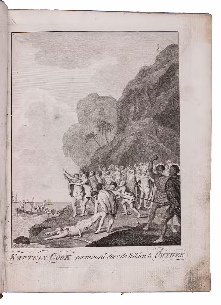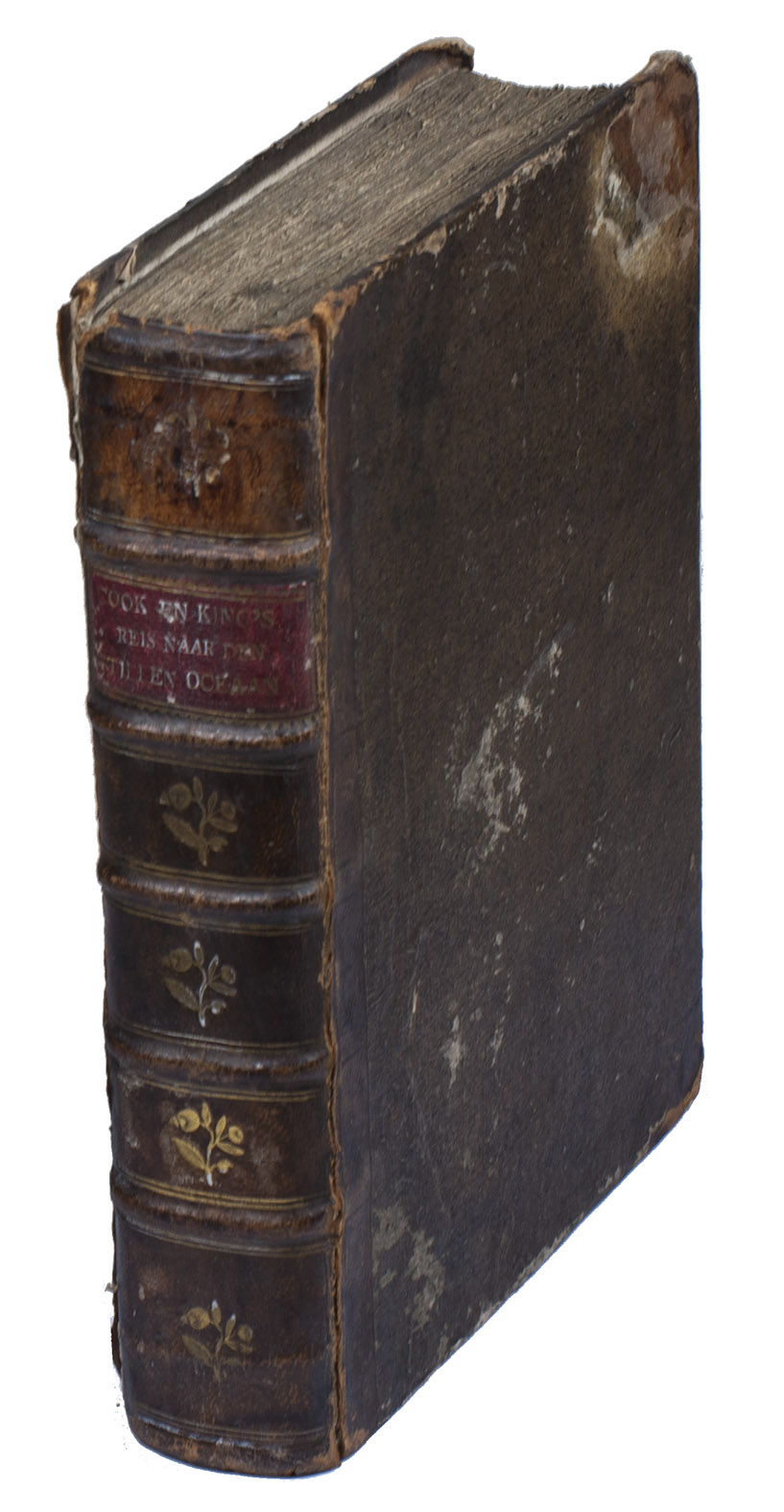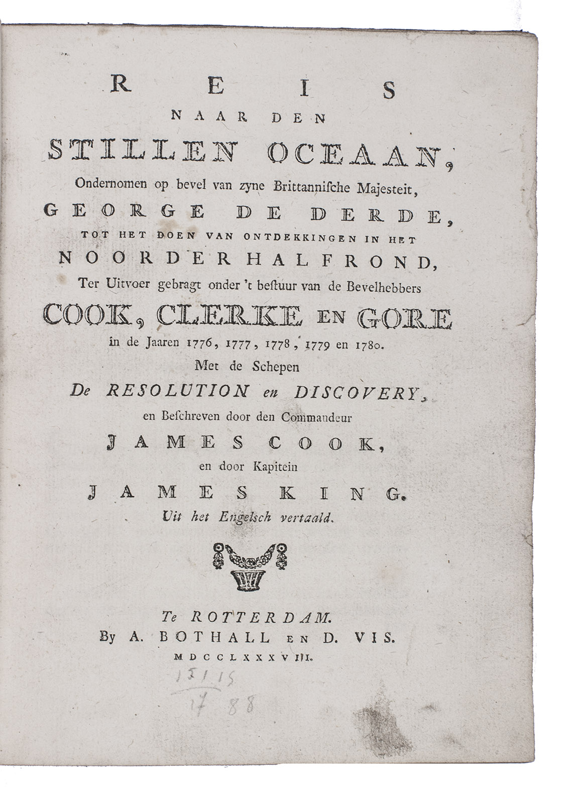 First edition, with the imprint changed to 1788 by pen, of the Dutch translation of Cook's account of his third and last voyage, with an engraved frontispiece depicting Cook's death by the native inhabitants of "Owyhee" (Hawaii). Cook (1728-1779) volunteered in 1776 for a third voyage "to investigate the coasts of the north Pacific, and to settle once and for all the question of the northwest passage" (Howgego). Via Cape of Good Hope, Tasmania and New Zealand they reached the Pacific Ocean, where they discovered and mapped several islands. They continued sailing north to the west coast of North America. Sailing south again they mapped some islands around Hawaii. After some natives had stolen one of the Discovery's boats, Cook came ashore with a small party. The meeting escalated and during retreat Cook was overpowered by some native inhabitants and killed. Clerke gained command and set out to Kamchatka, but died along the way and was buried at Petropavlovsk. James King and John Gore were now in command of the two ships, and started sailing back to Plymouth.