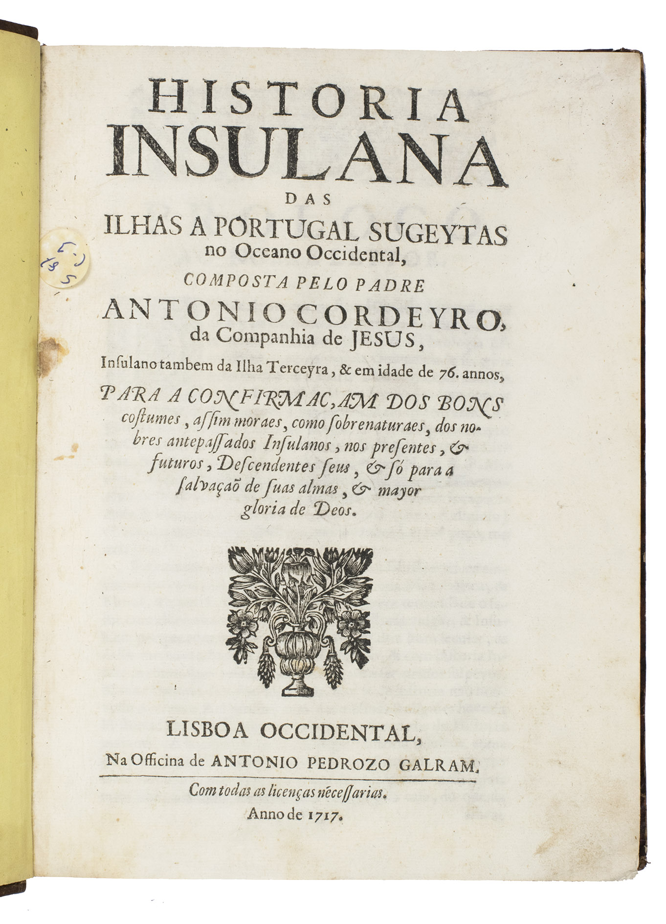 First edition of a history of the collection of four archipelagos in the North Atlantic, off the coasts of Africa and Europe, called Macaronesia, and the Azores in particular, written by a native of Terceira. The work describes each island separately, focussing on its history, discovery, natural resources and inhabitants. It also gives important information on prominent Azorean families, including the author's own. These parts are preceded by shorter parts about the history of Portugal, the Canaries, Cape Verde and Madeira, with references to Brazil and the Americas. This work rarely appears on the market.