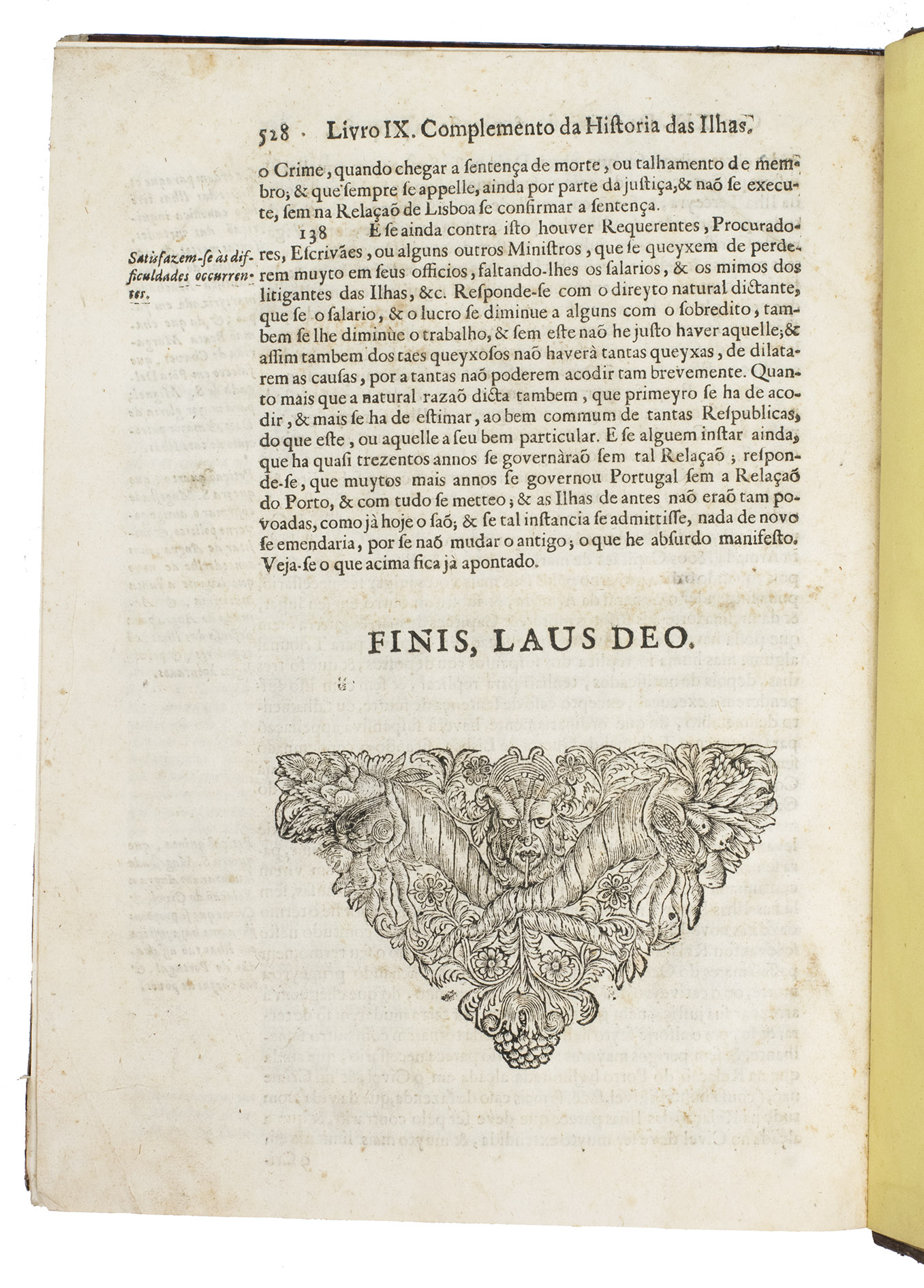 Lisboa occidental, Na officina de Antonio Pedrozo Galram, 1717. Small folio (ca. 28 x 21 cm). With a woodcut printer's device on the title-page, woodcut decorated initials, and woodcut head- and tailpieces. Gold-tooled brown calf from the first half of the 19th century. [1], [1 blank], [14], 528 pp.