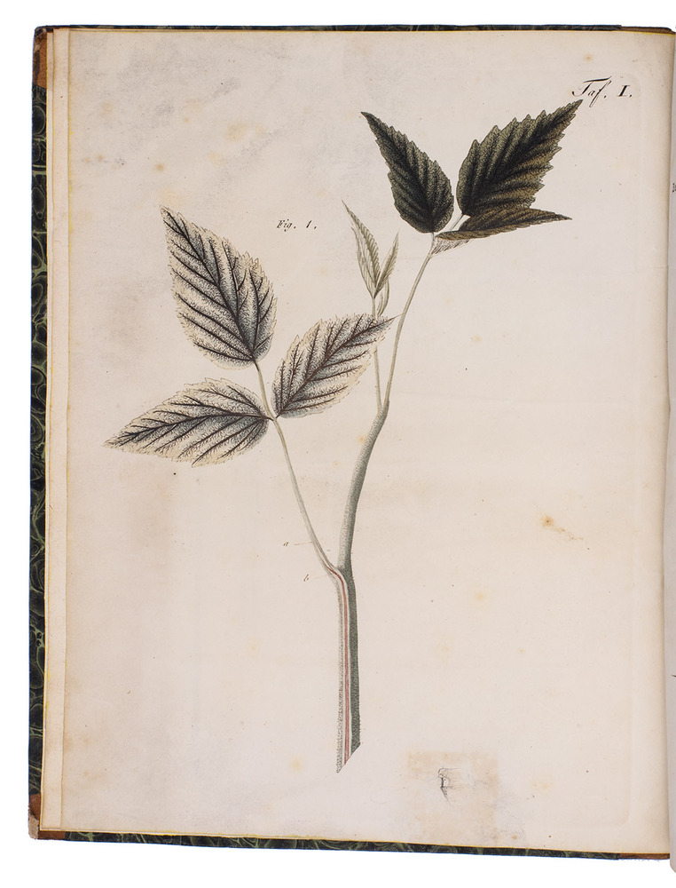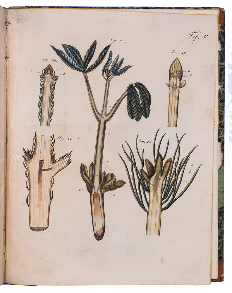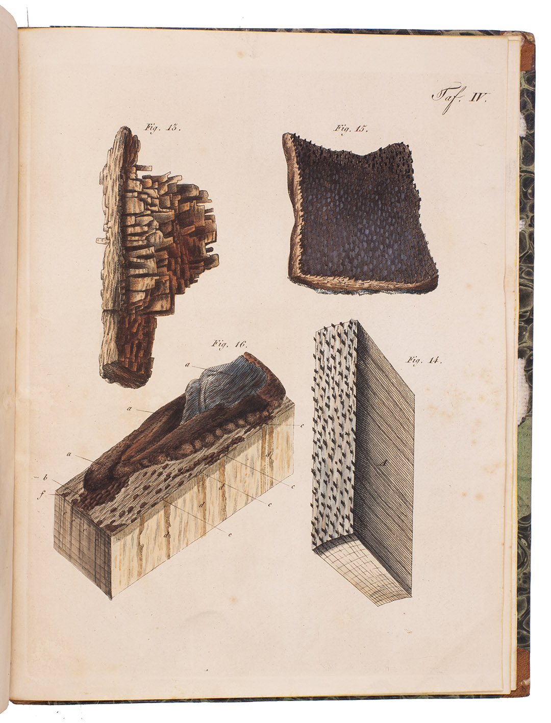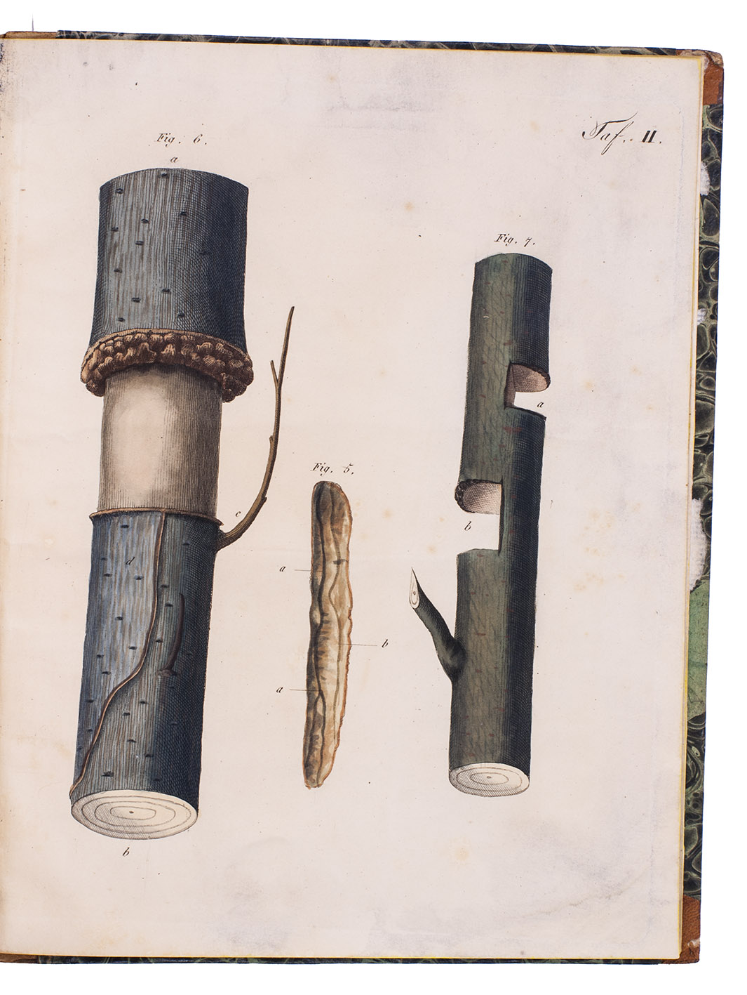 First edition of an early work on endosmosis (the movement of the sap in the stem) by the German silviculturist Heinrich Cotta (1763-1844), with 7 hand-coloured engraved plates of tree branches and bark. Active research on endosmosis was done in Germany by vegetable physiologists between 1804 and 1840. The work opens with a preface, introduction and table of contents, followed by the main text discussing the movement of sap in woody plants and its function. It is "in many respects an instructive work" (Sachs).