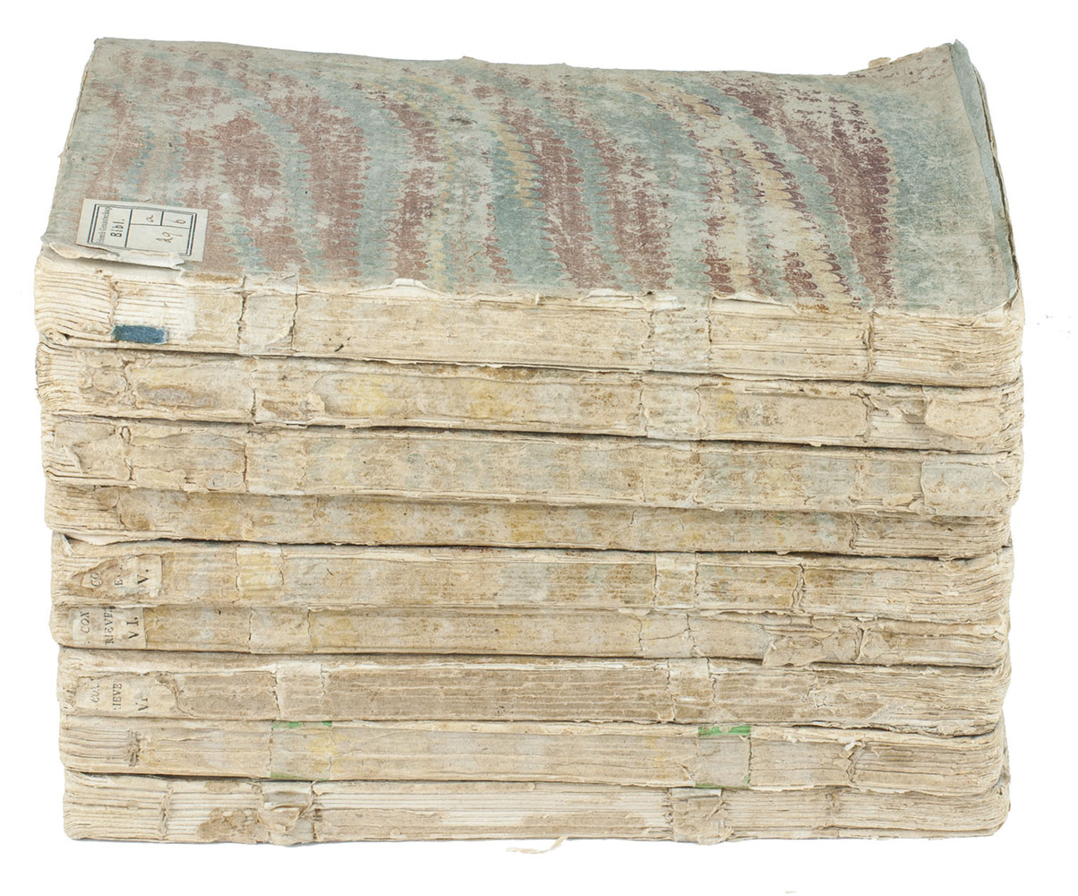 Each volume with manuscript records of the book's readers from a reading circle, giving a remarkably detailed record of each volume's circulation. Small 19th-century ink stamps. In very good condition and almost entirely untrimmed. Marbled wrappers rubbed and spines tattered. V. Gestel-Van het Schip 64; Petersen, Travels in Norway, p. 14; STCN (5 copies, incl. 3 incompl.).