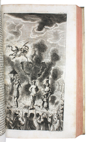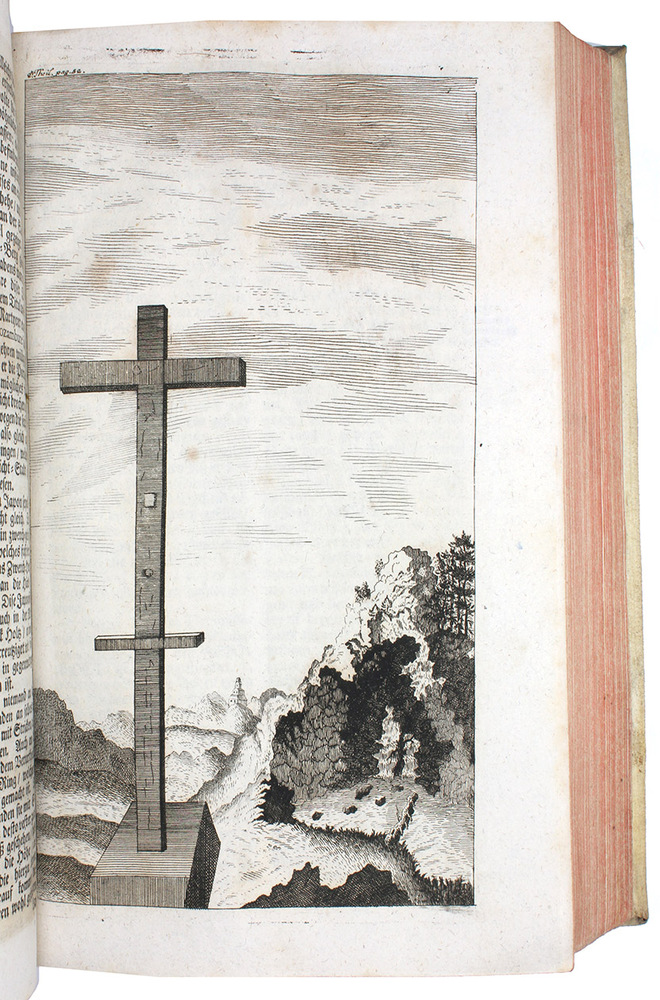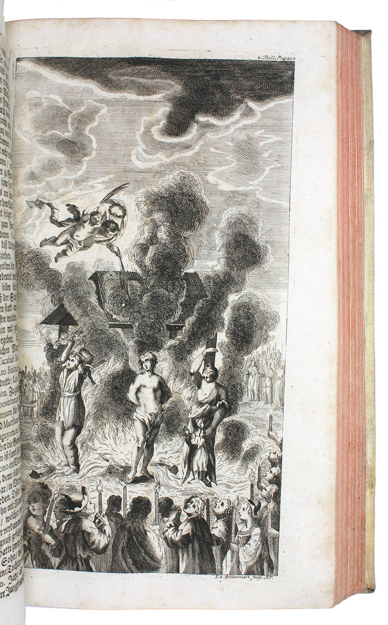 Augsburg, Franz Anton Ilger (printed by Anton Maximilian Heiss), 1738. 2 parts in 1 volume. Folio. With title-page printed in red and black, and 9 etched plates by Joseph Anton Zimmermann; woodcut head- and tailpieces. Contemporary blind-tooled pigskin over wooden boards. [24], 534; “559” [= 555], [1 blank].