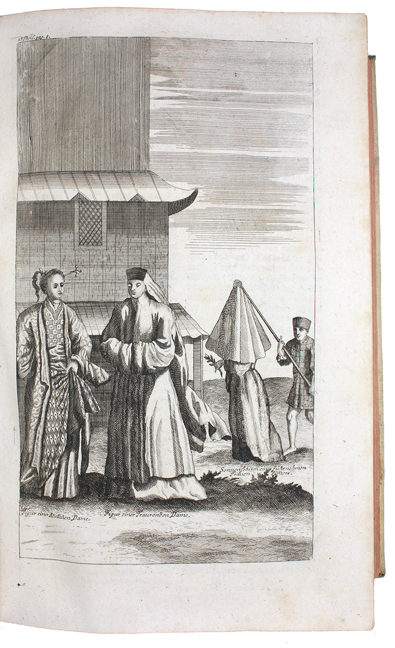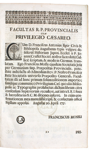 First German translation of Crasset's Histoire de l'eglise du Japon, first published in 1689. Crasset, a French Jesuit, based the earlier part of his account on François Solier's Histoire ecclesiastique des isles et royaumes du Japon (1627) but continued it from 1624 to 1658. He gives an elaborate history of the Jesuit mission in Japan, beginning with Francis Xavier. He includes many details about Japan and the Japanese, and the nine plates include several depictions of Japanese costumes and three illustrations of gruesome executions of Jesuit missionaries.