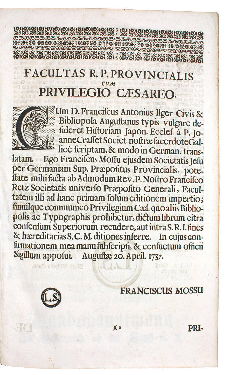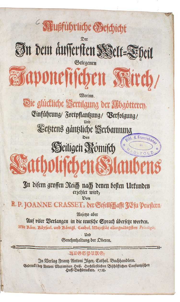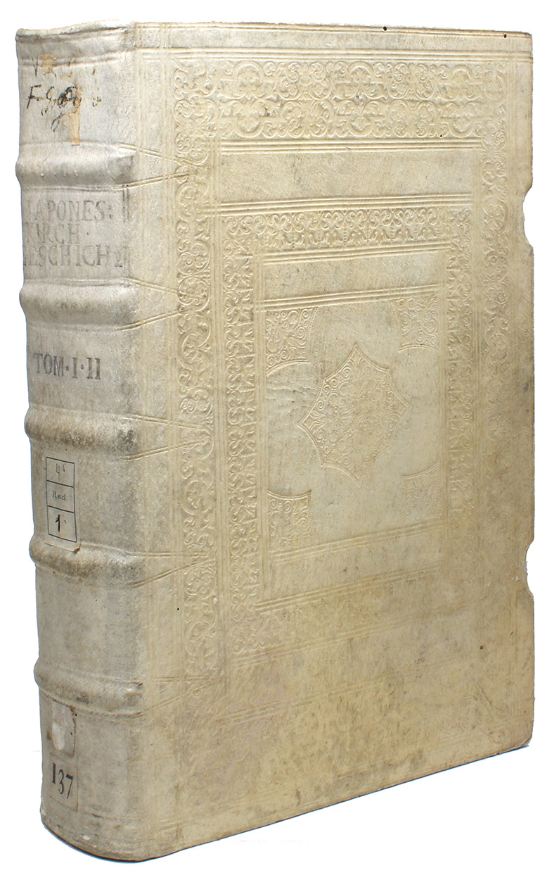 With the engraved bookplate of the monastery of Polling and some stamps. Clasps lost. Otherwise in fine condition. Alt-Japan-Katalog 379; De Backer & Sommervogel II, col. 1641, no. 21; Cordier, Japonica, col. 401.
