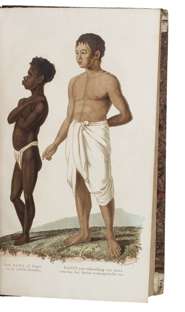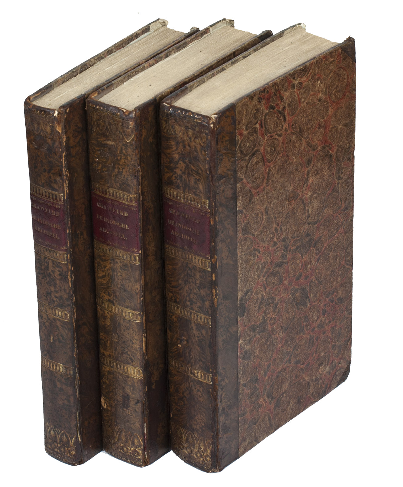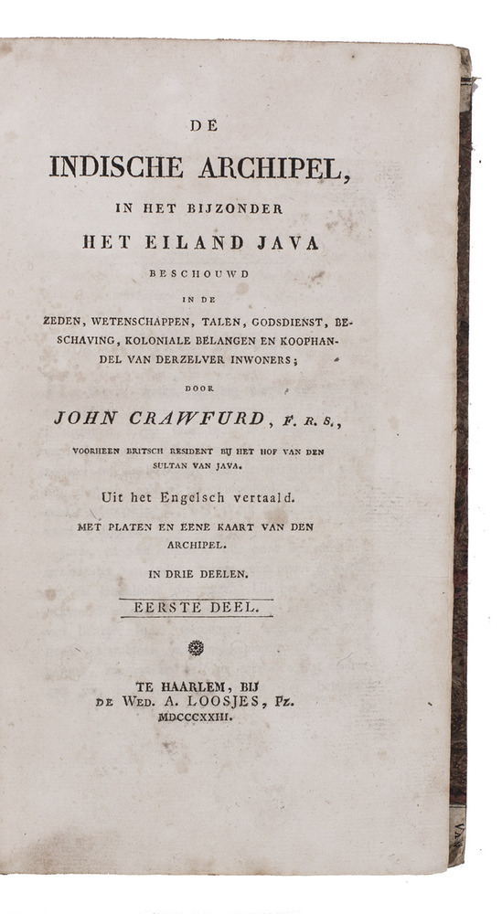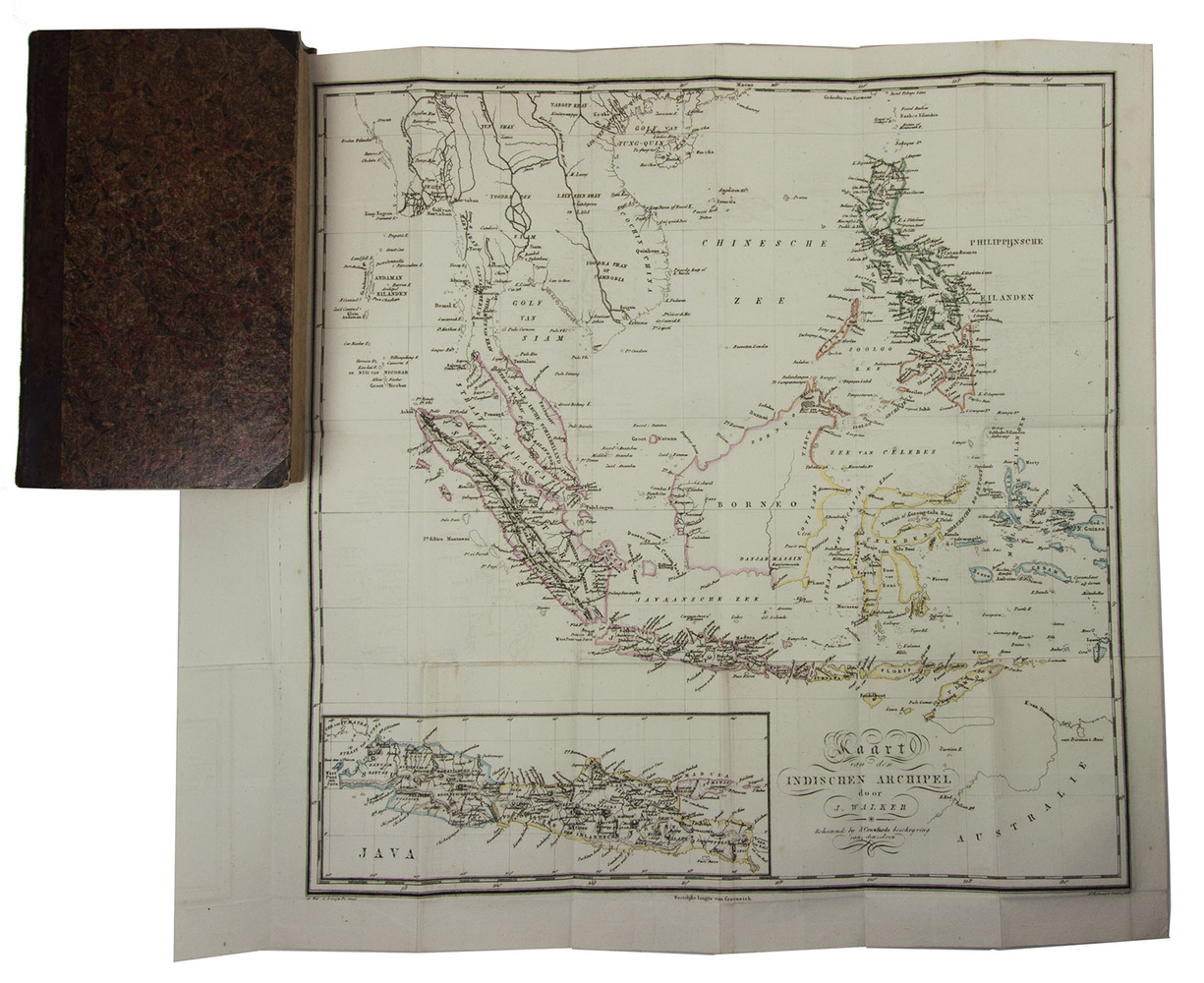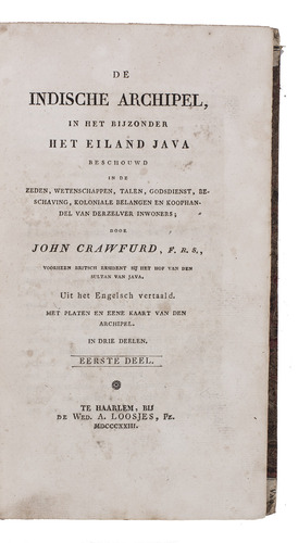 First Dutch edition of Crawfurd's major History of the Indian Archipelago, with a preface by the translator, Pieter de Haan. Crawfurd was part of the British expedition to Java in 1811 and held several senior post during the British occupation of the island. He befriended Javanese aristocratic literati and studied both Javanese and ancient Kawi, thus acquiring an intimate knowledge of Indonesian culture. The present work is an in depth account of the archipelago, more specifically of Java, treating its native population, agriculture, sciences and arts, languages, religions, history and legislation. The coloured plate shows a Papuan boy and a native from Bali. The accurate map is by John Walker and includes the Philippines.
