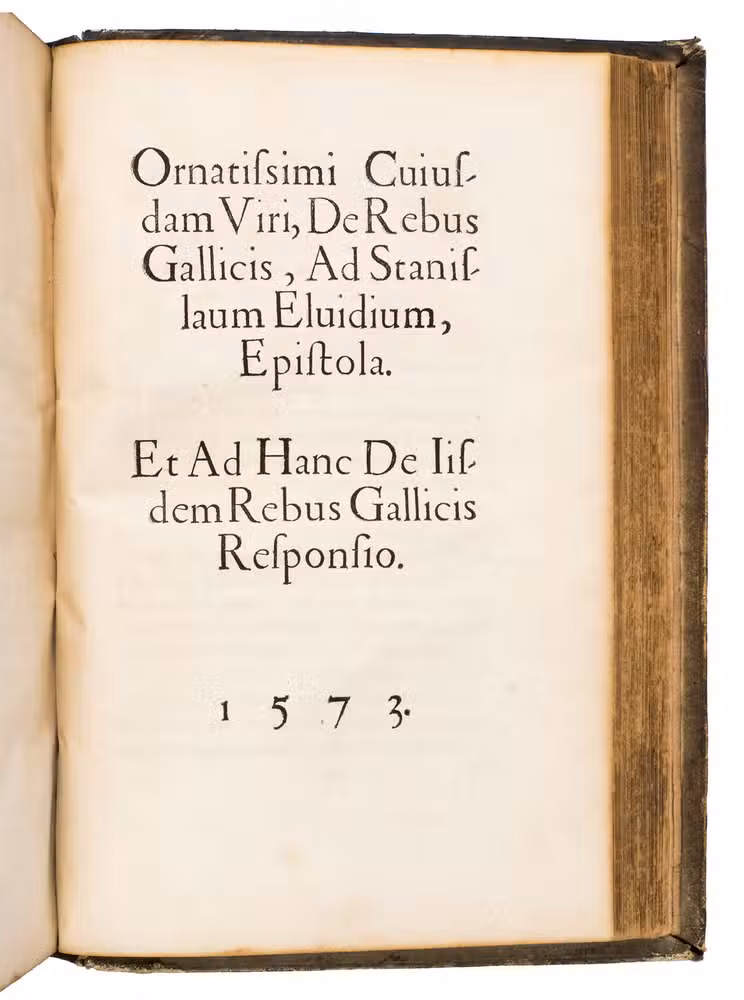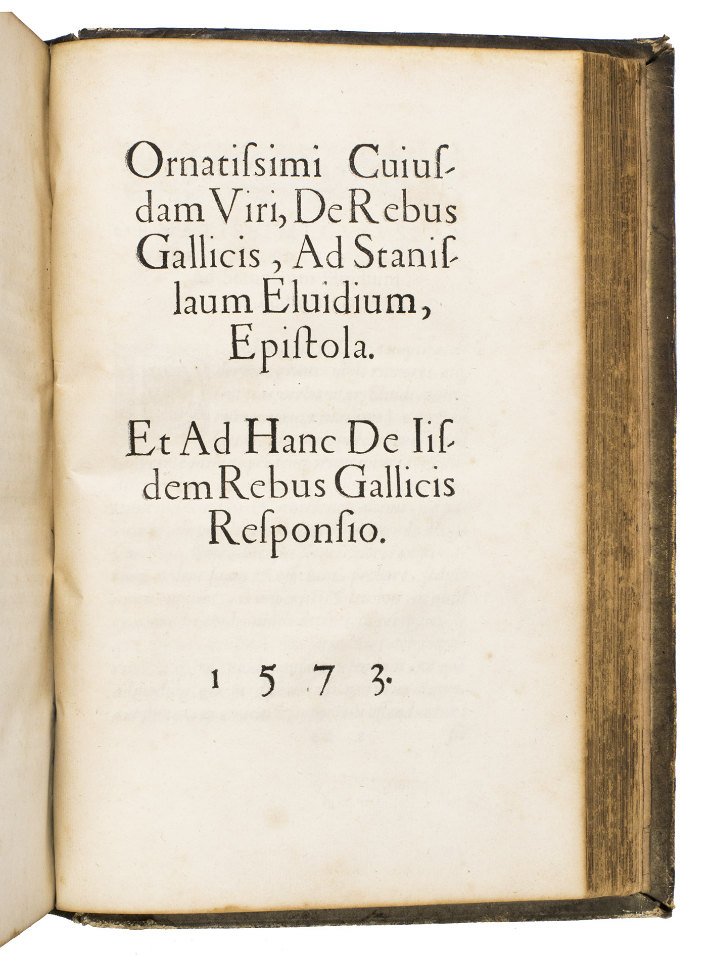 With: (2) [PIBRAC, Guy du Faur, seigneur de]. De rebus Gallicis, ad Stanislaum Elvidium, epistola. Et ad hanc de iisdem rebus Gallicis responsio.
