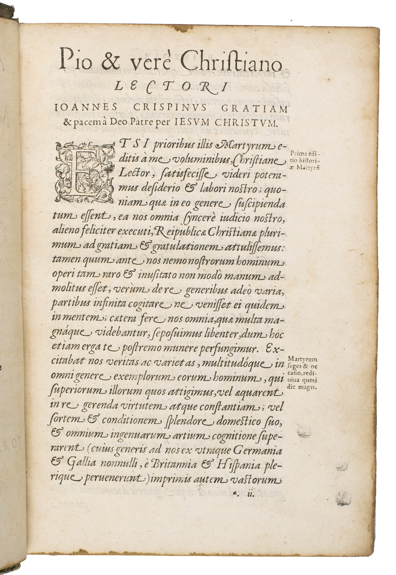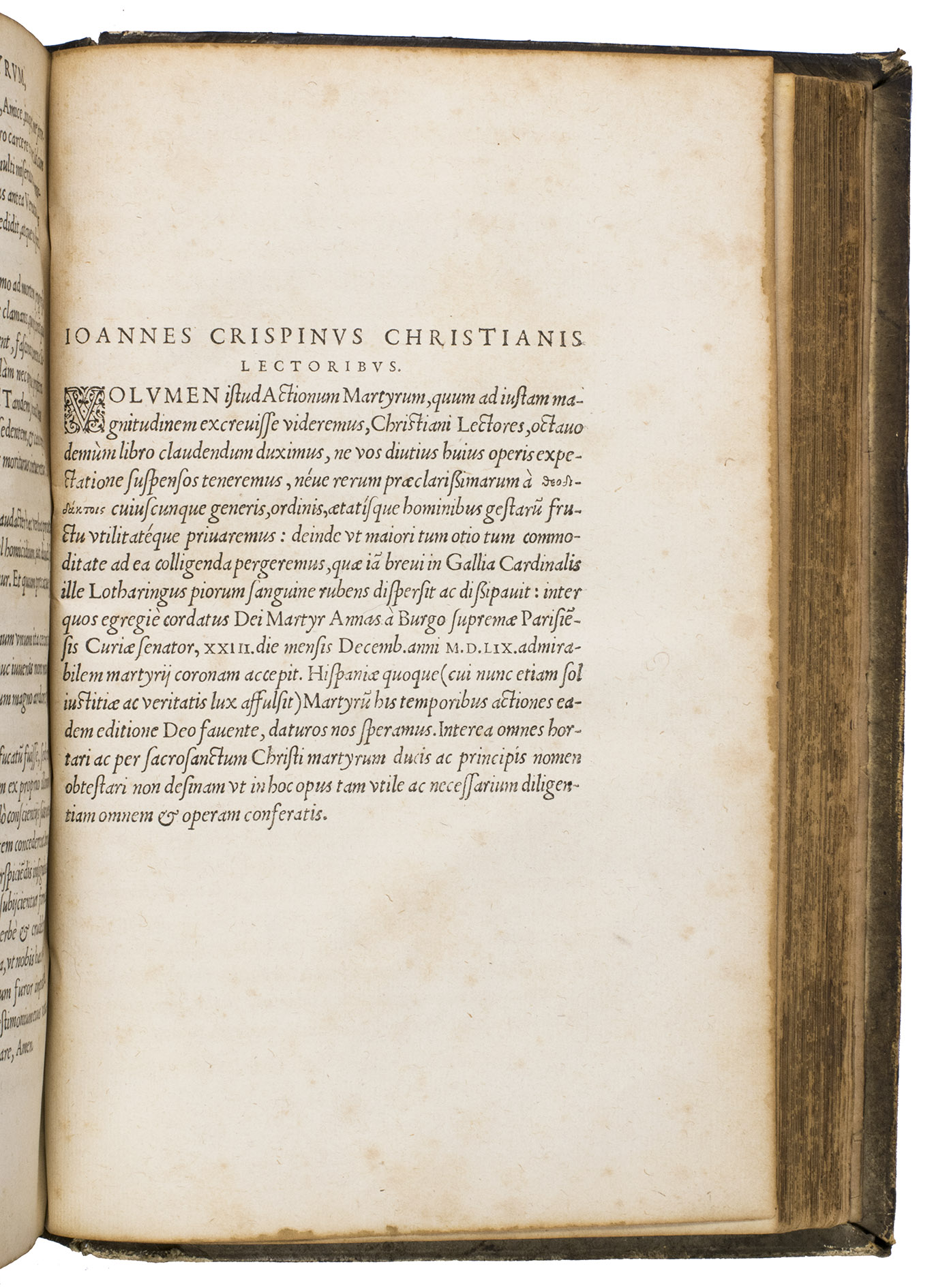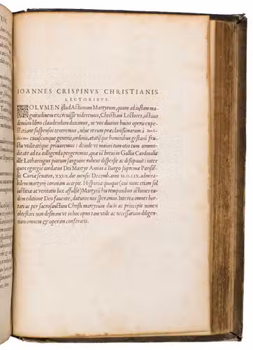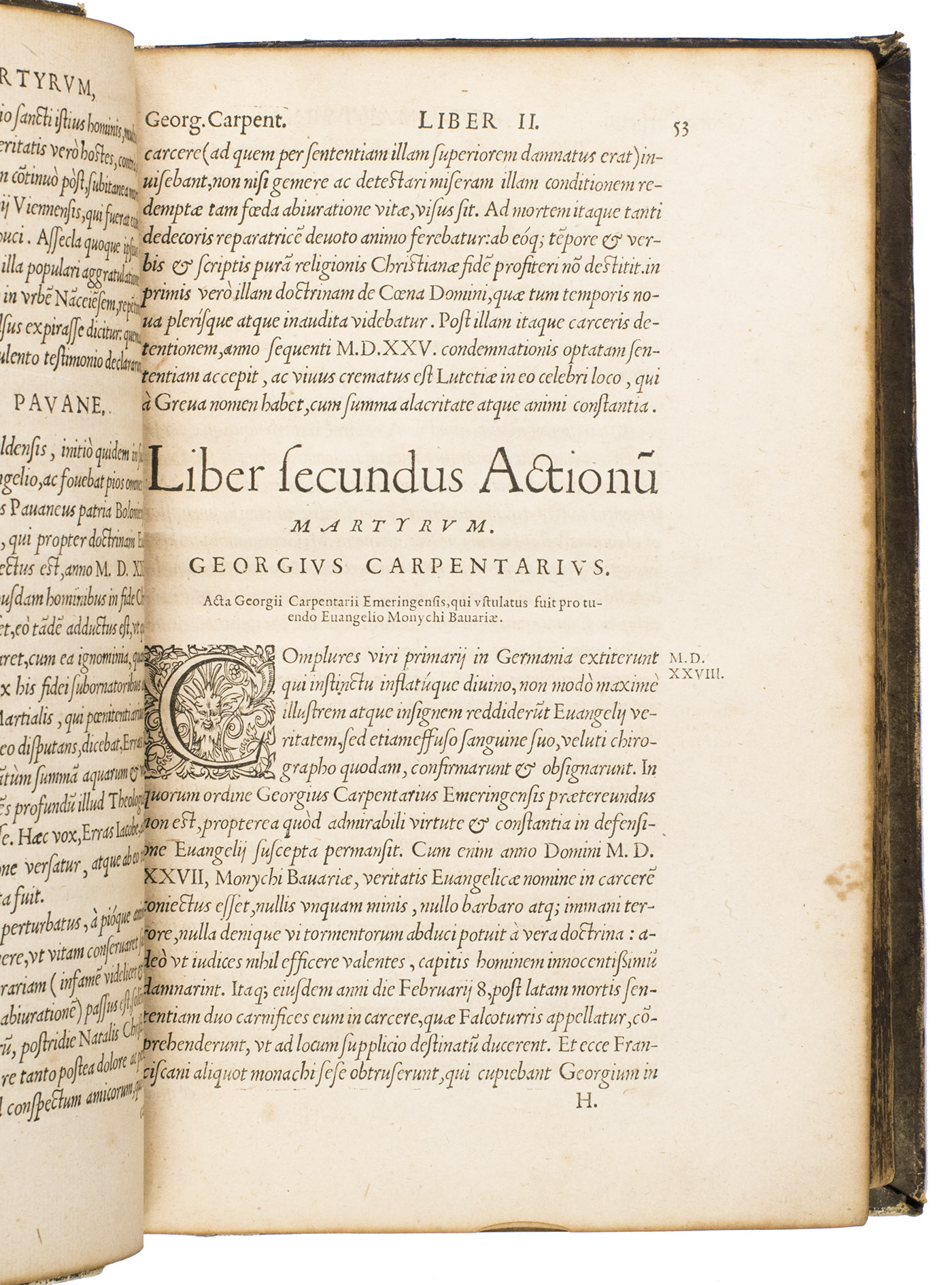 Extended Latin edition of a celebrated Protestant martyrology, in a beautiful contemporary blind-stamped pigskin binding, which has been signed by the binder. The work comprises descriptions of the lives and works of early Reformers as Wyclif, Hus, and Jerome of Prague as well as of many lesser known martyrs of later times who entertained Nonconformist or heretical views. It contains the texts of numerous contemporary documents, including confessions of faith, court reports, eye witness accounts, and letters to and from the prisoners, and is therefore an important source on the Reformation.